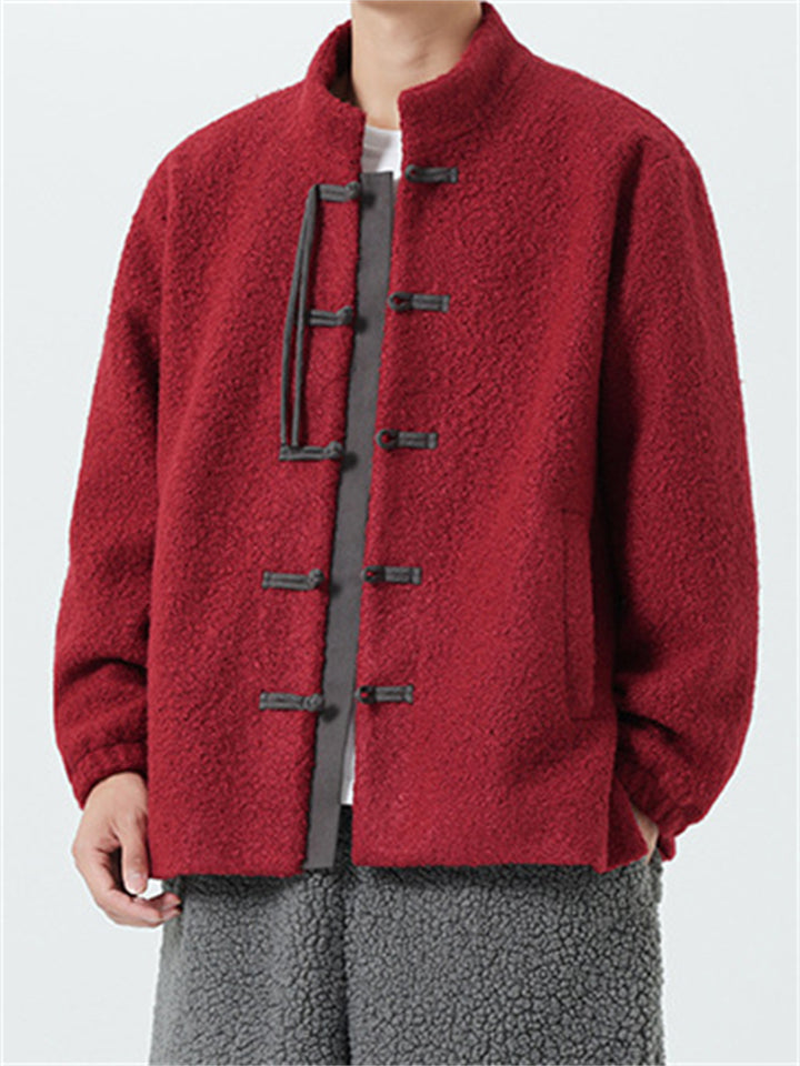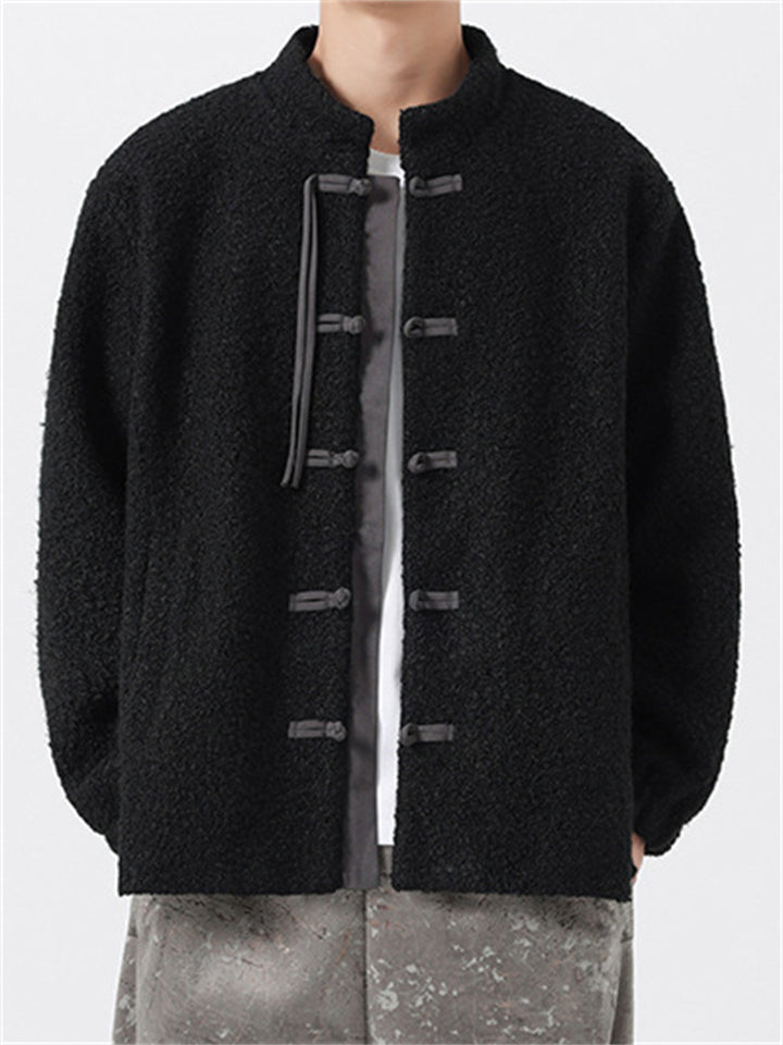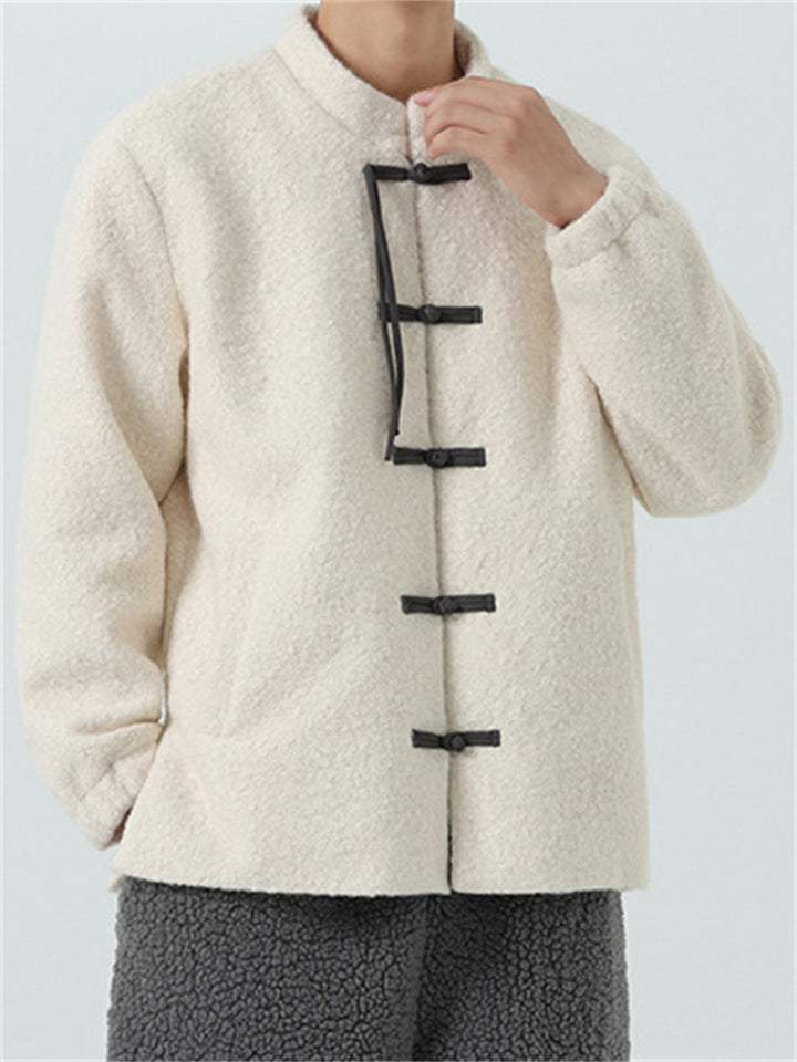 Fleece Mandarin Collar Coat for Men with Traditional Chinese Buttons