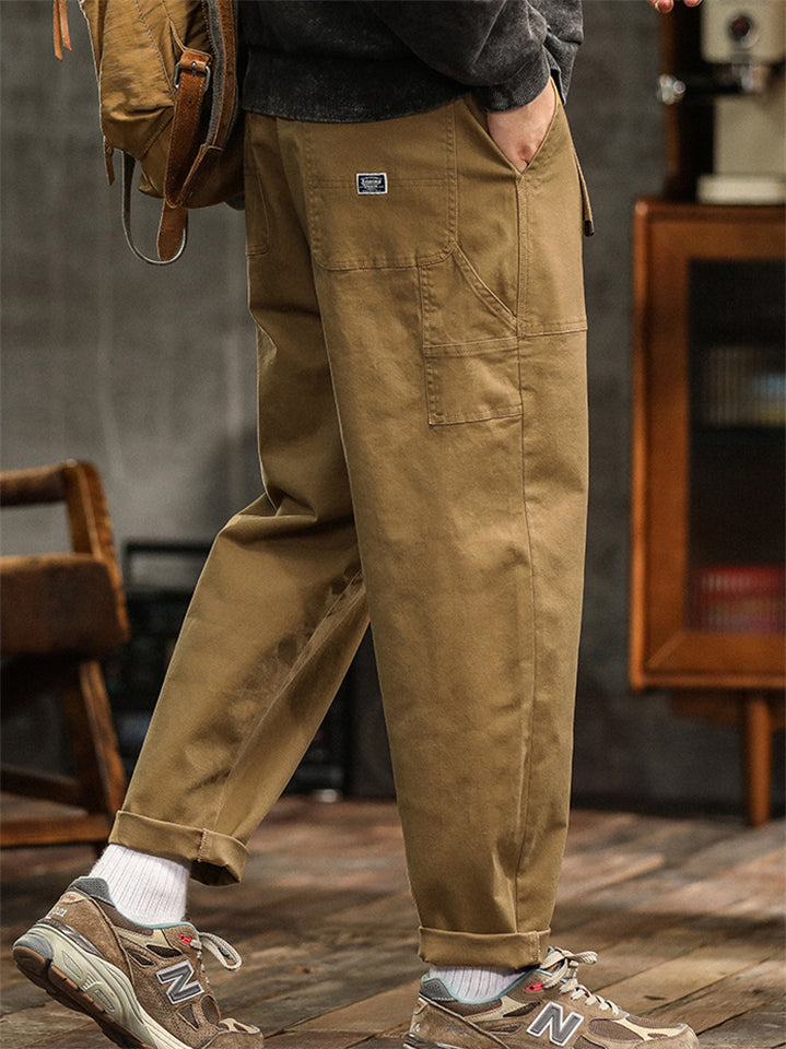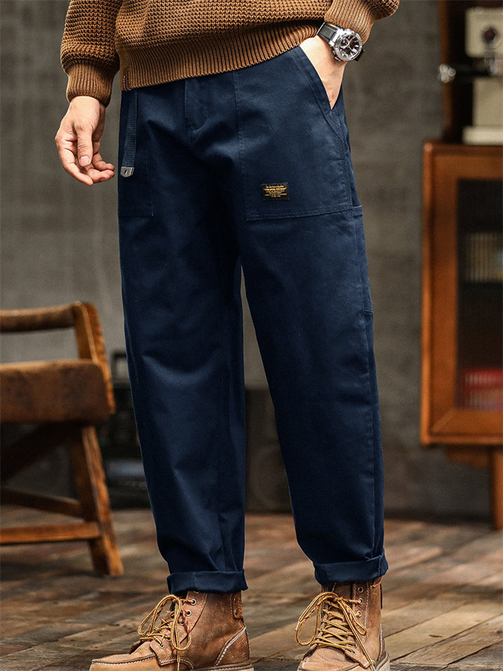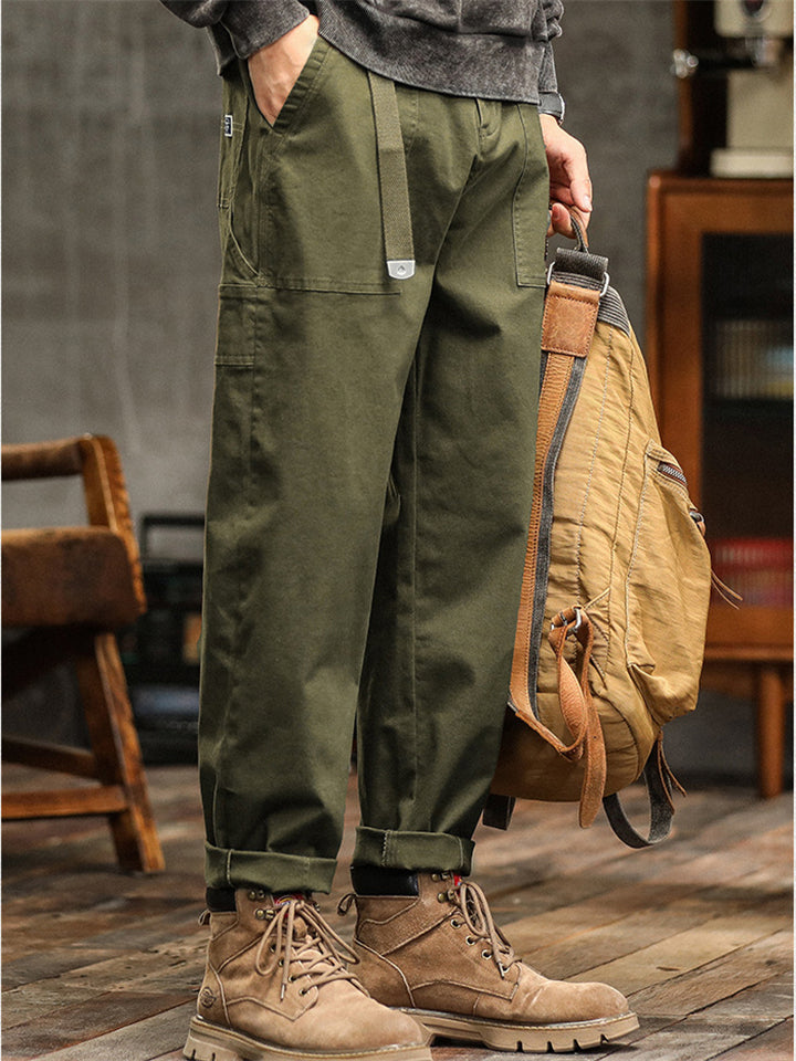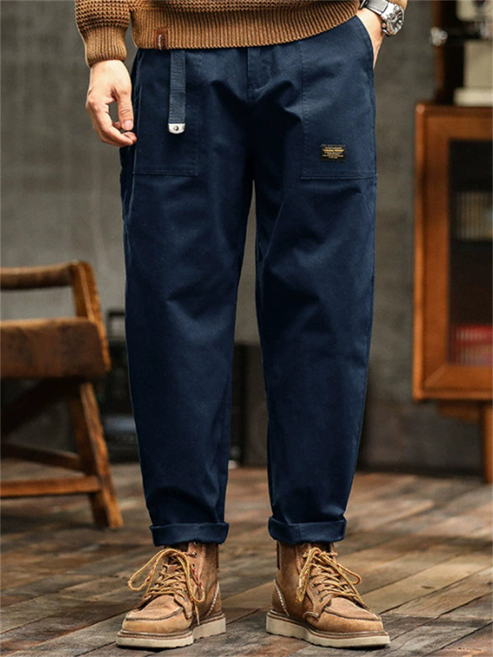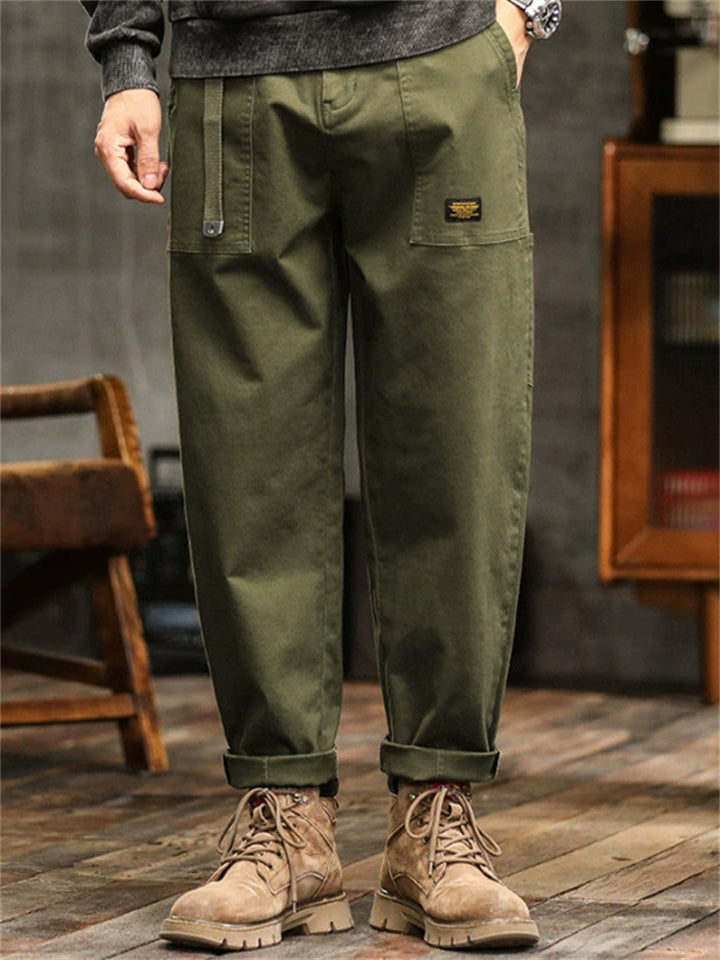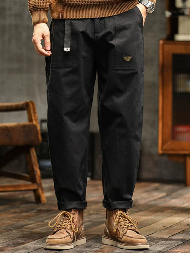 Men's Japanese Style Cotton Solid Color Pockets Straight Cargo Pants with Belt