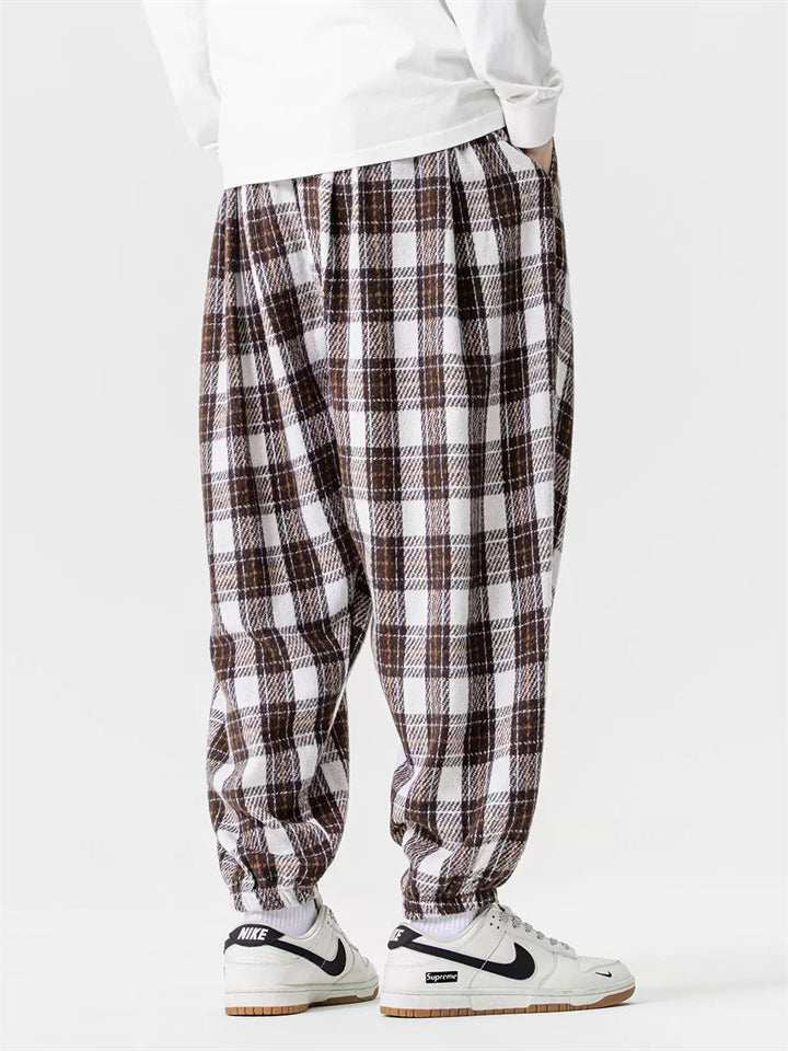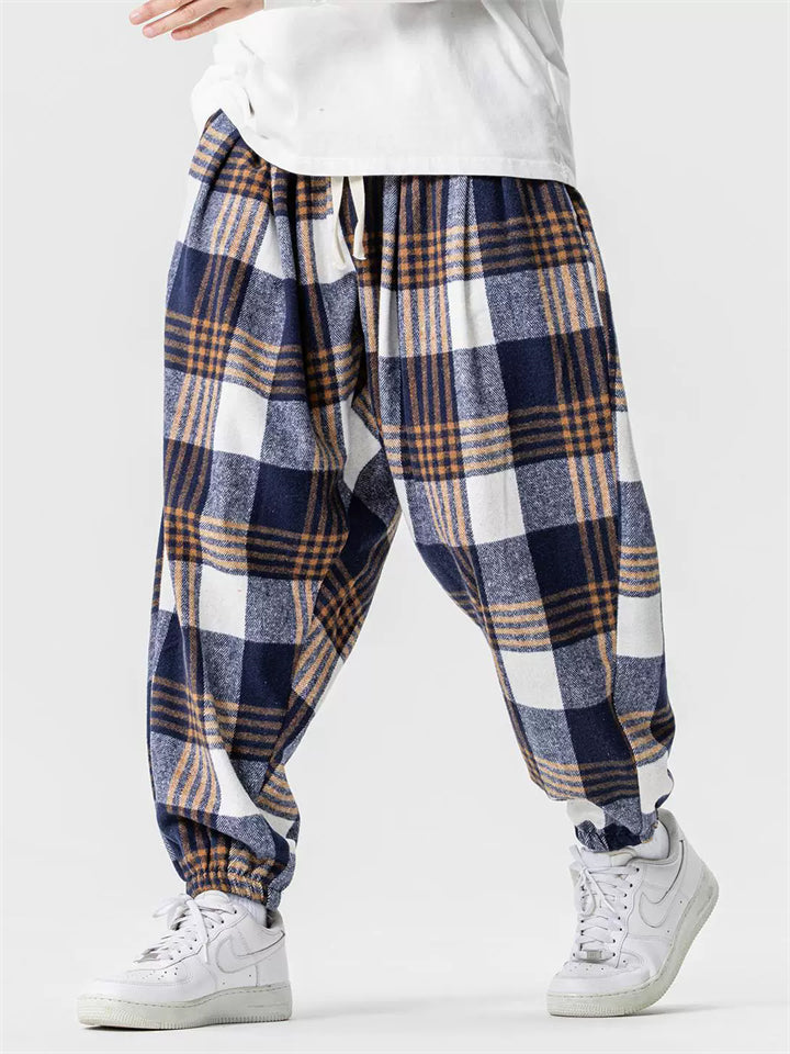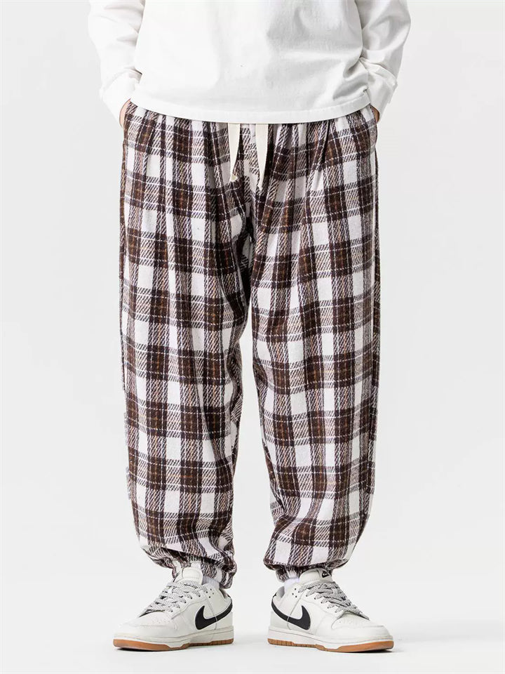 Men's Japanese Style Retro Loose Fit Elastic Waist Checkered Joggers Pants
