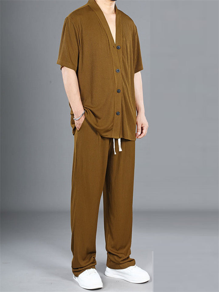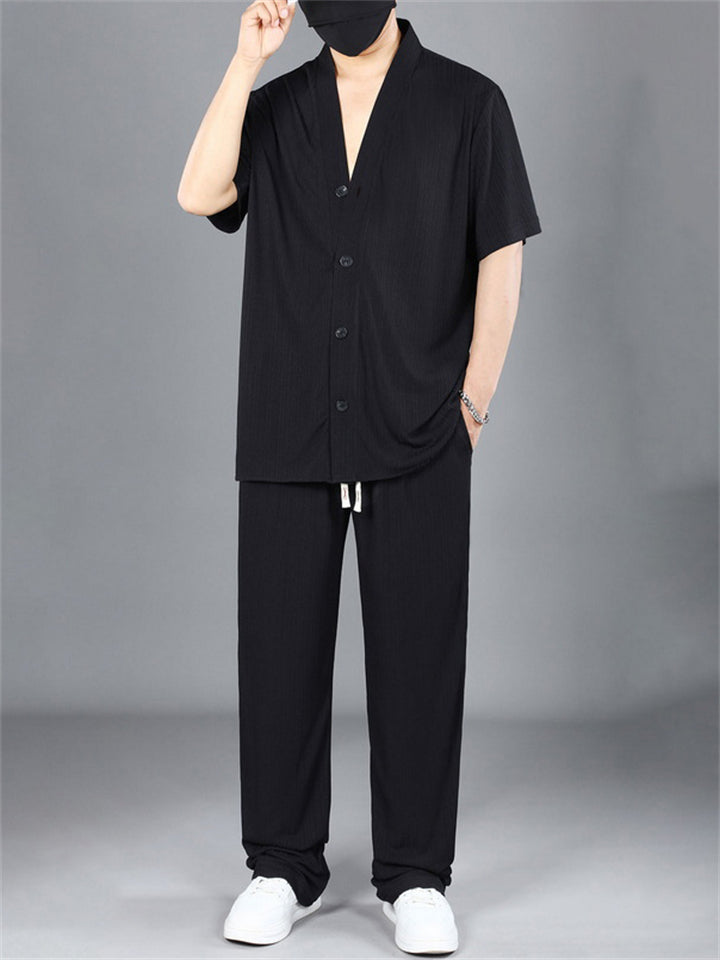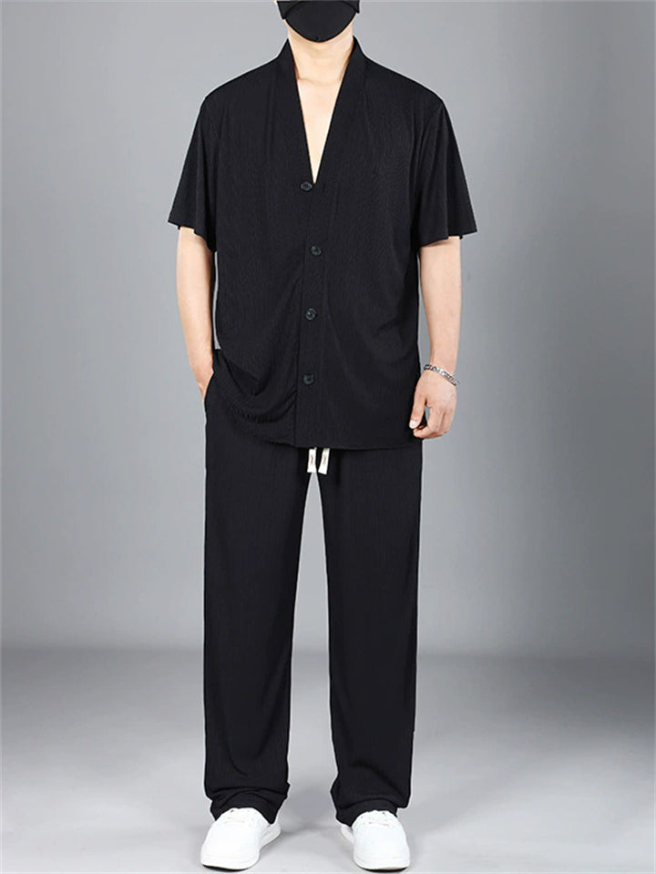 Men's Summer Plus Size V-Neck Short Sleeve Set with Loose Fit and Drawstring Pants