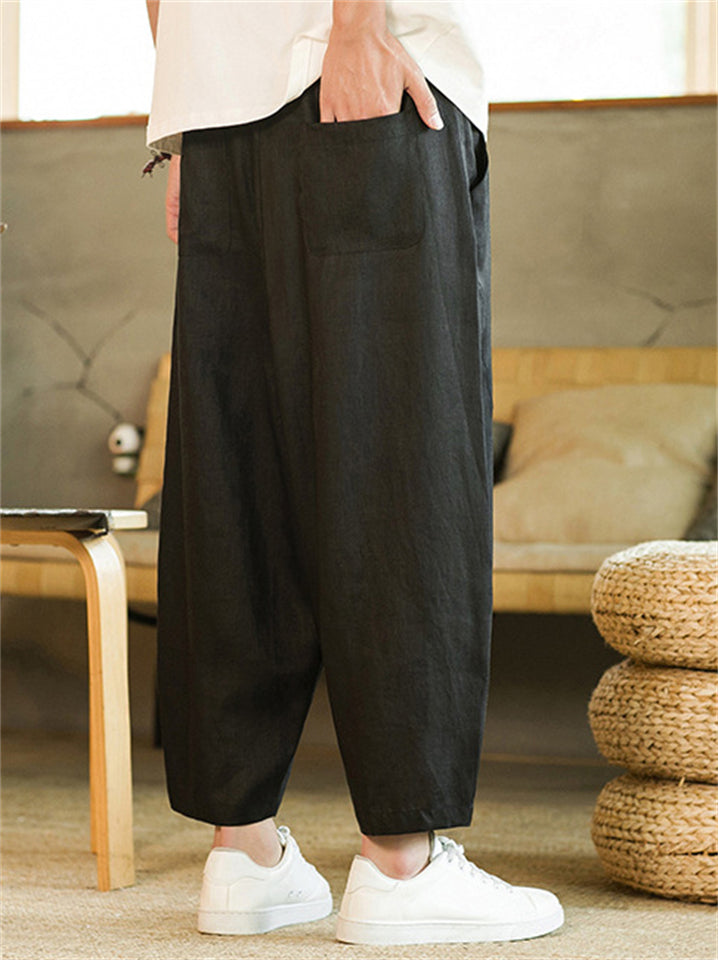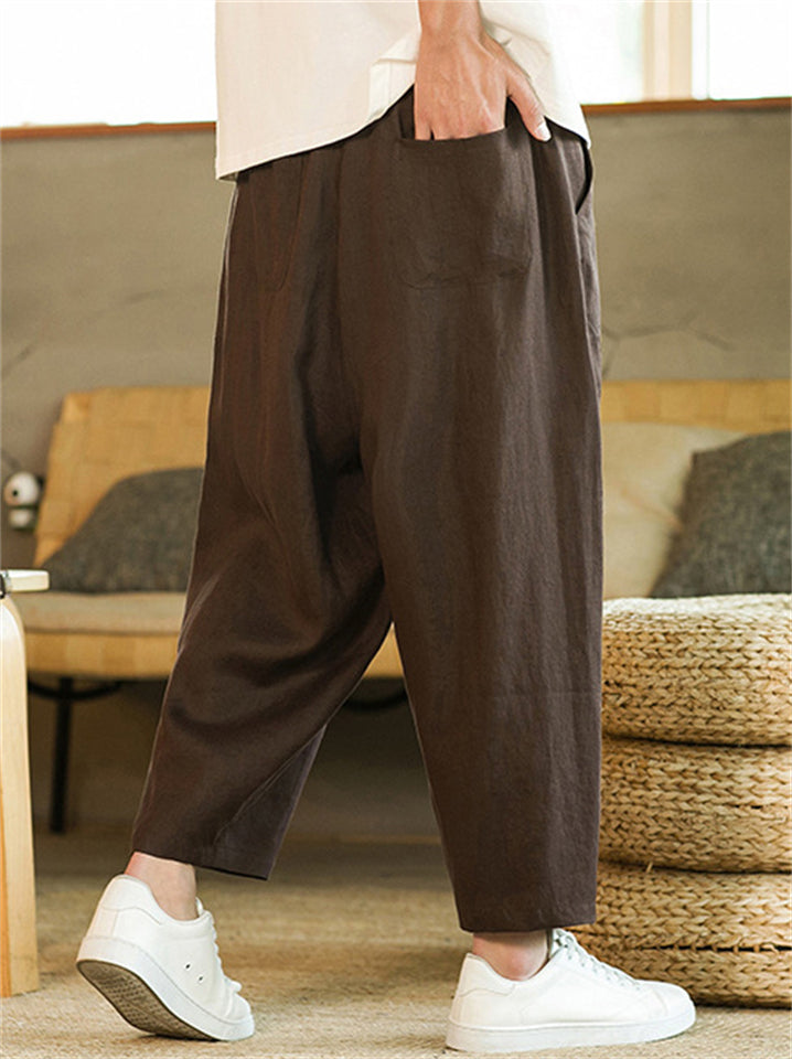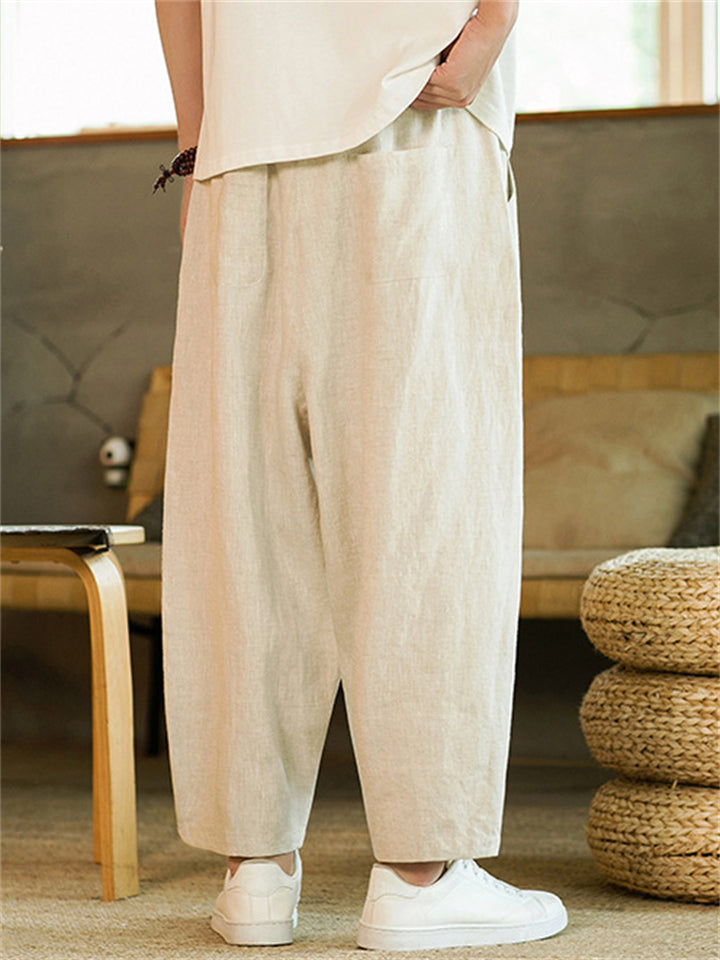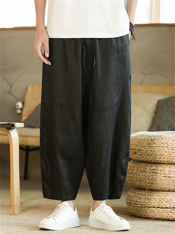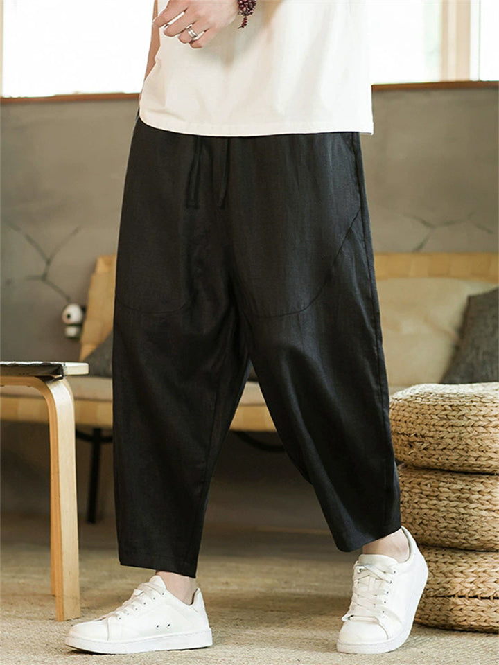 Men's Summer Vintage Casual Linen Drawstring Wide Leg Cropped Pants