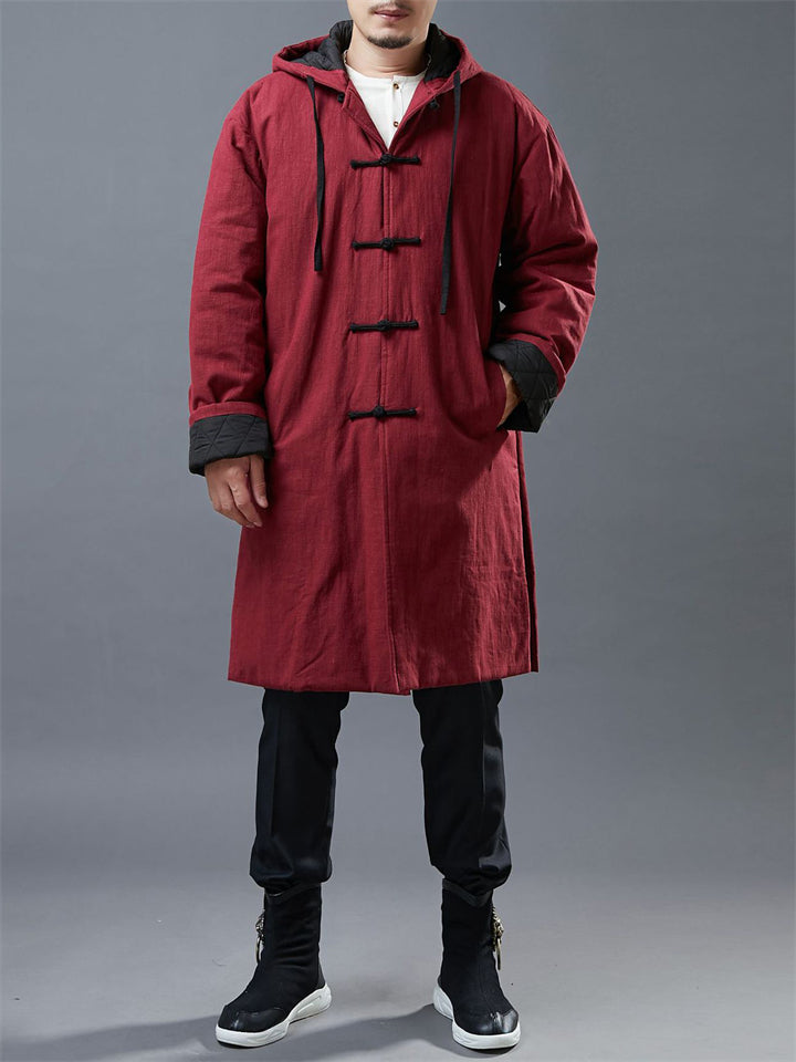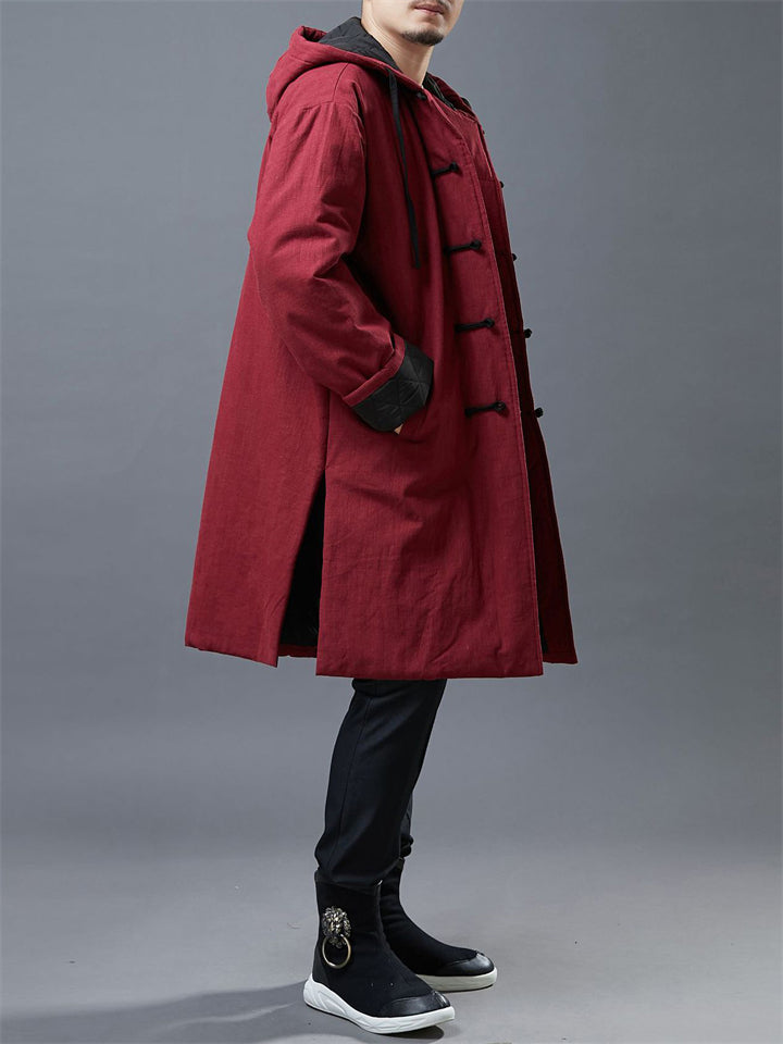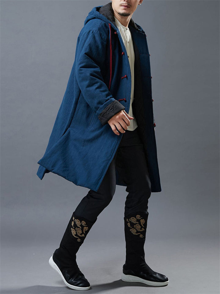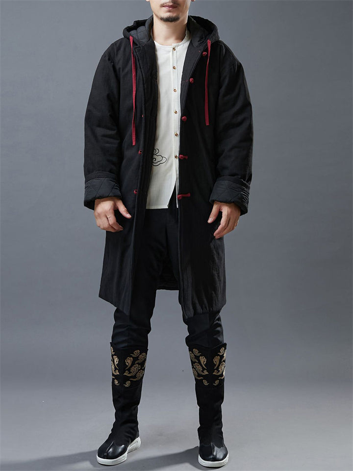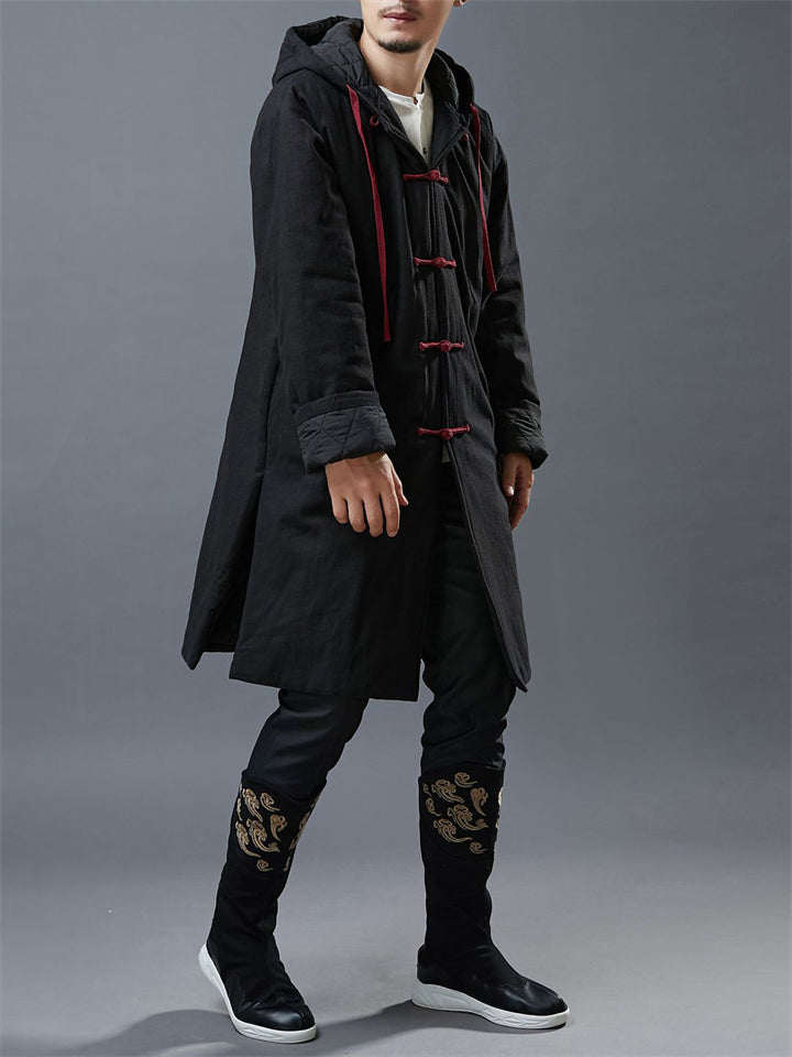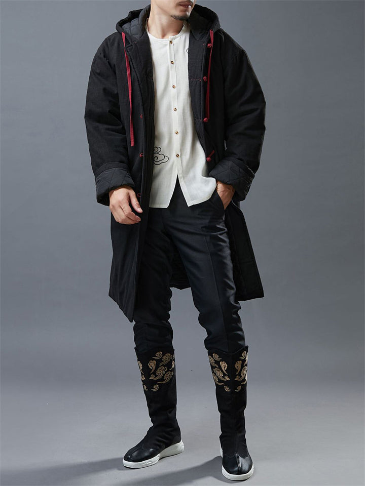 Men's Chinese Style Black Jacquard Corduroy Hooded Cloak Robe Jackets