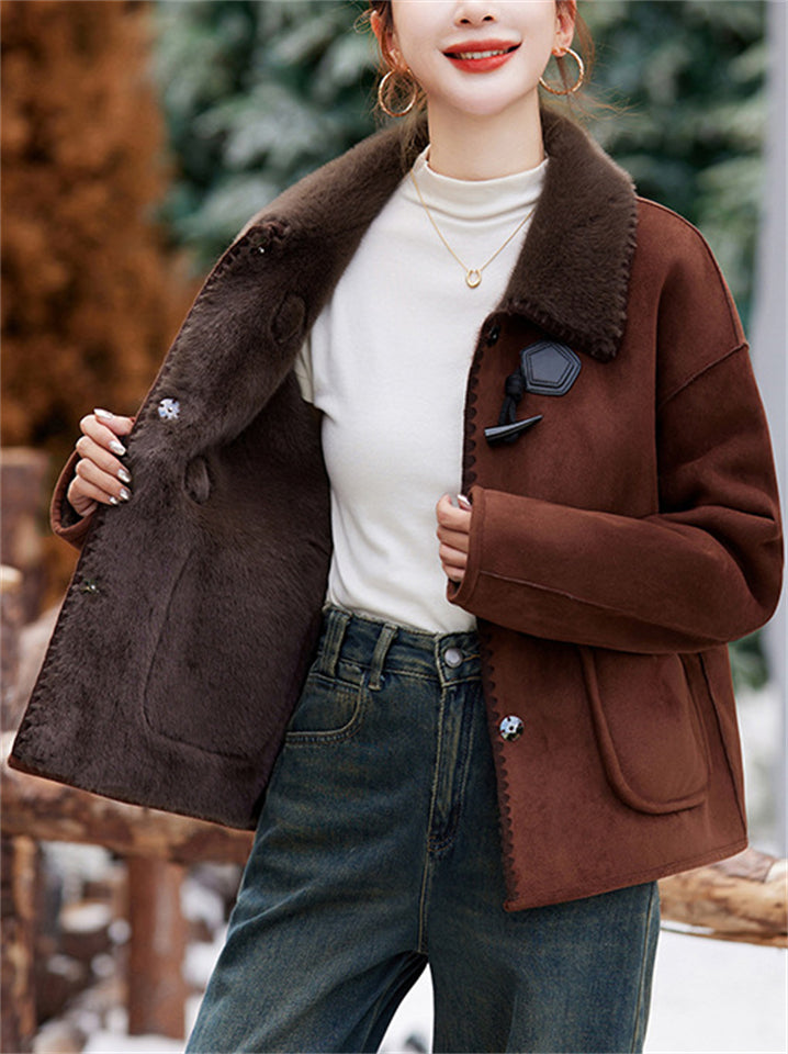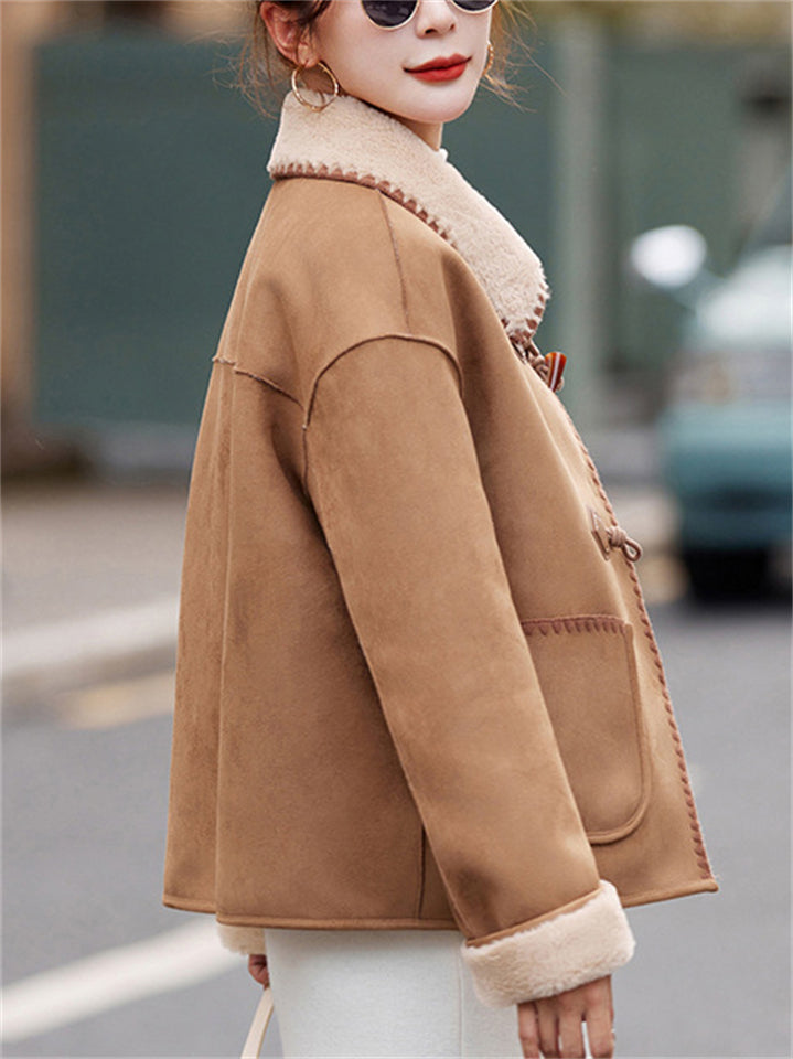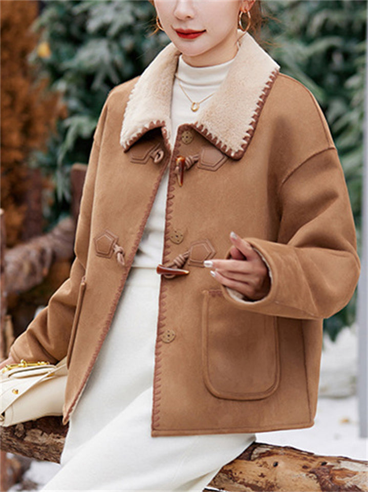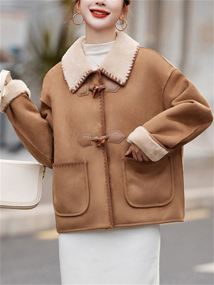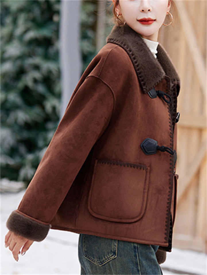 Women's Winter Vintage Contrast Trim Fleeced Faux Suede Long Sleeve Coats