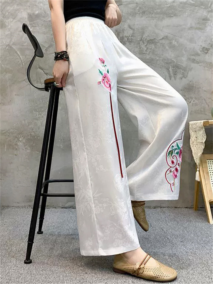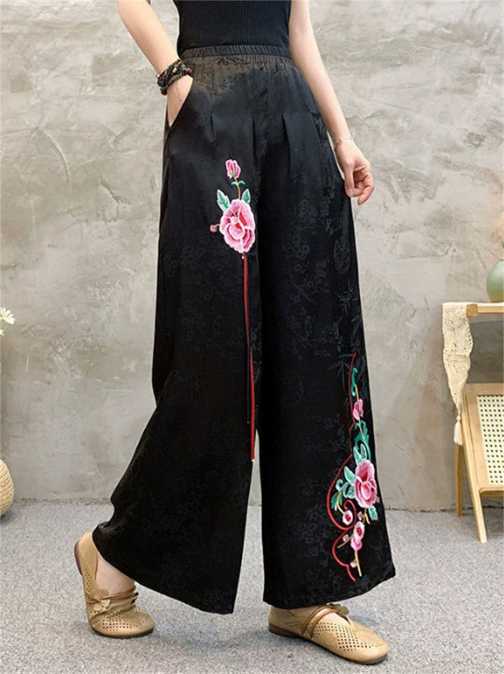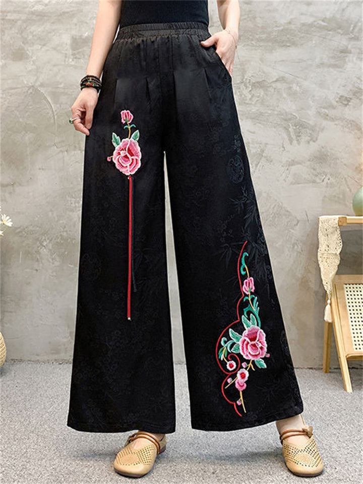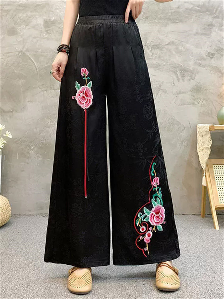Women's Ethnic Style Flowers Embroidered Comfy High Rise Pants