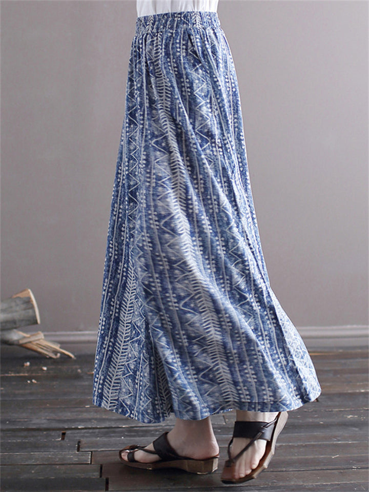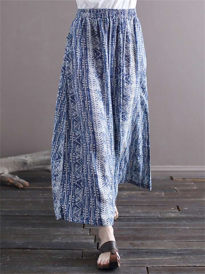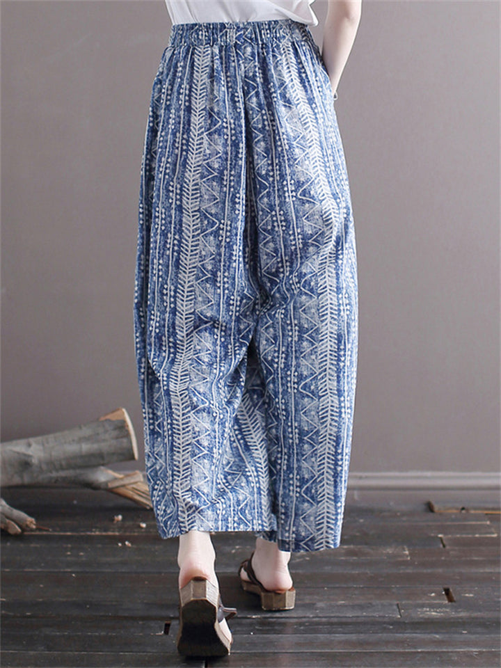 Women's Summer Blue Ethnic Style Printed Elastic Waist Wide Leg Pants