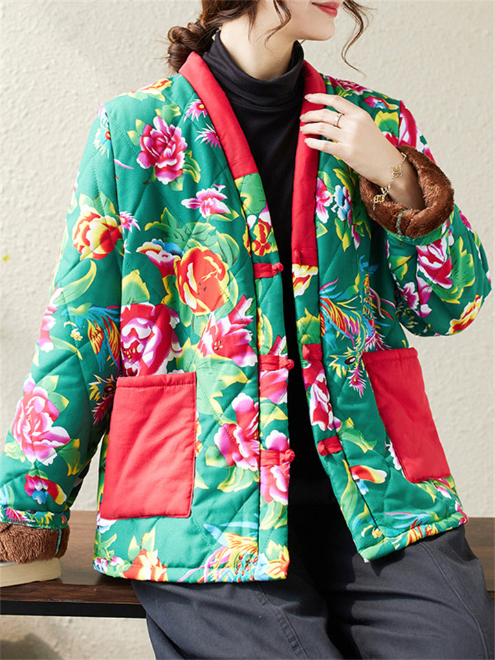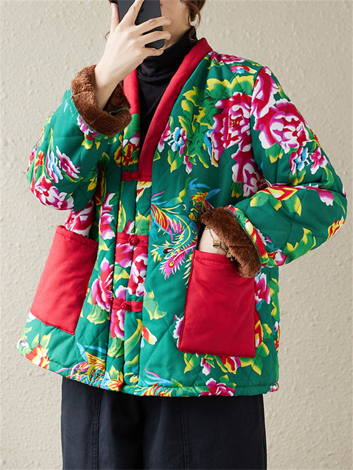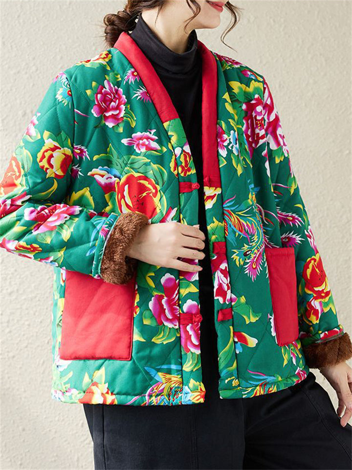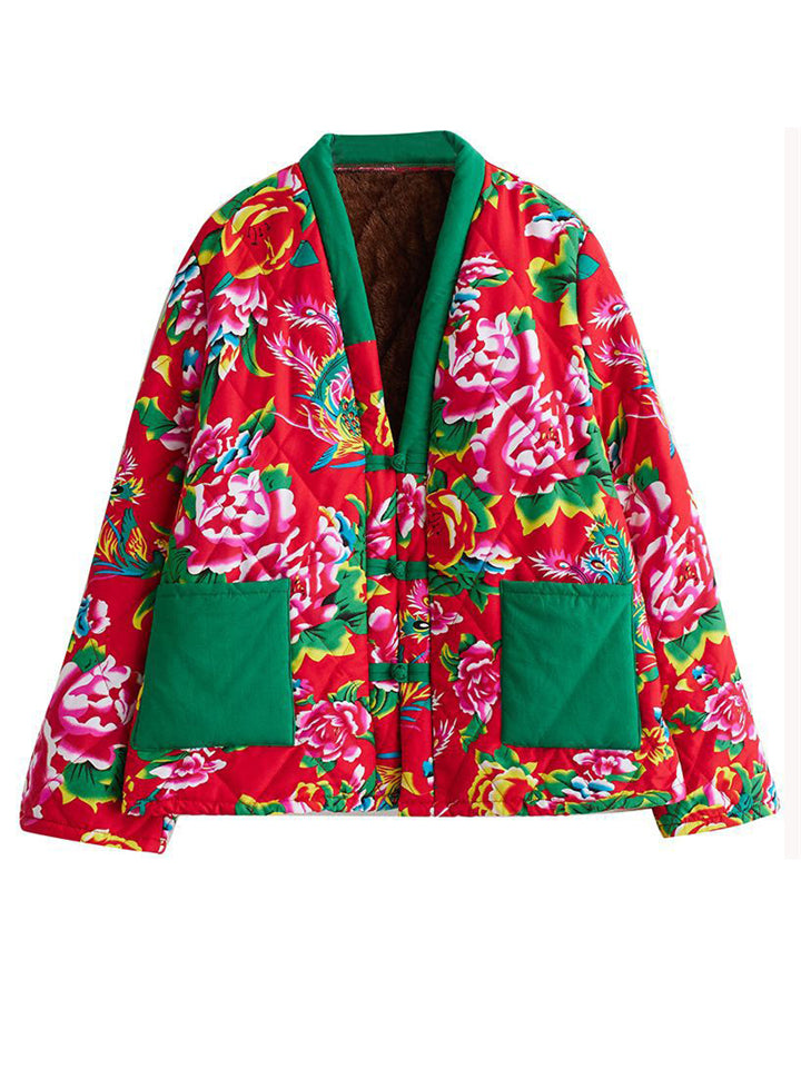 Country Style Red & Green Floral Print V-Neck Plush Liner Coat