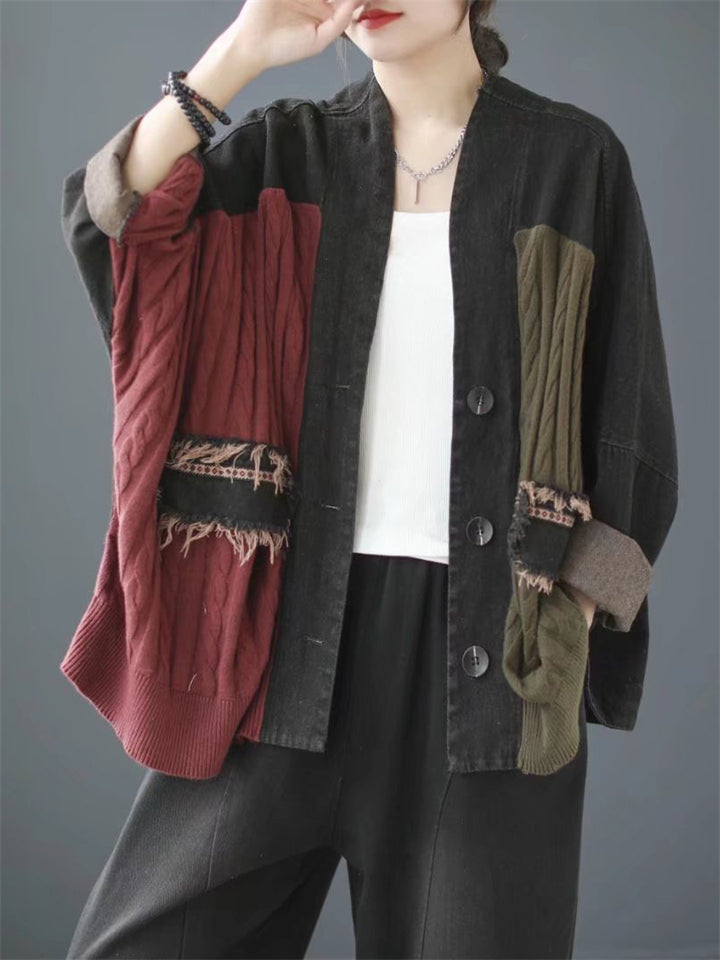 Women's Ethnic Style Trimmings Patchwork Black Cardigan Coat
