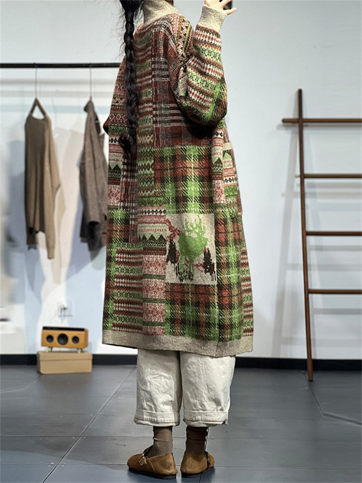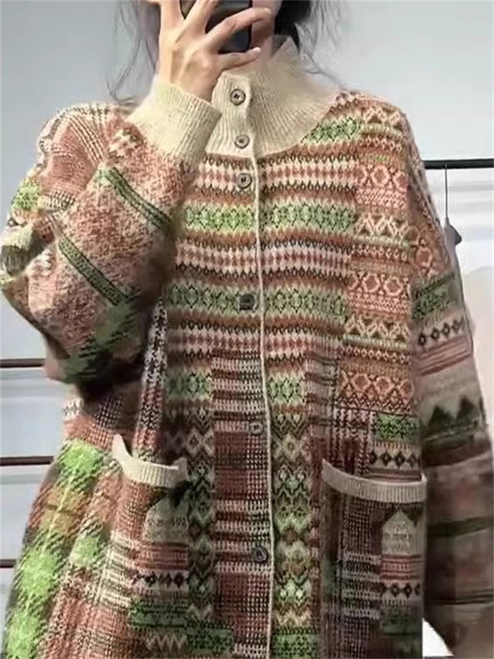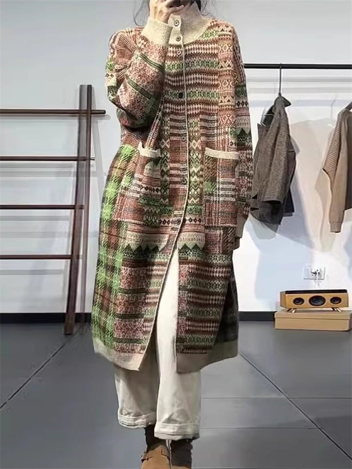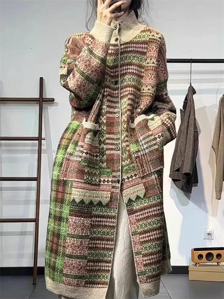 Female Ethnic Style Jacquard Mid-length Single-breasted Knit Coat