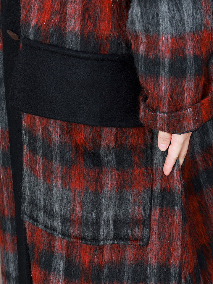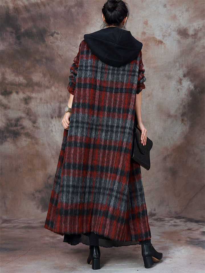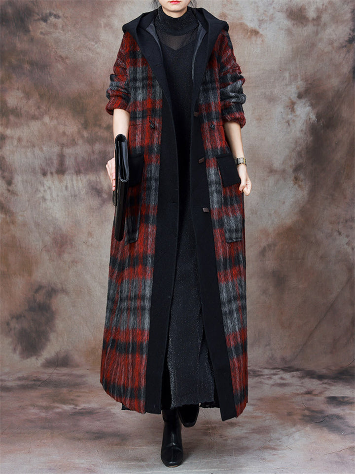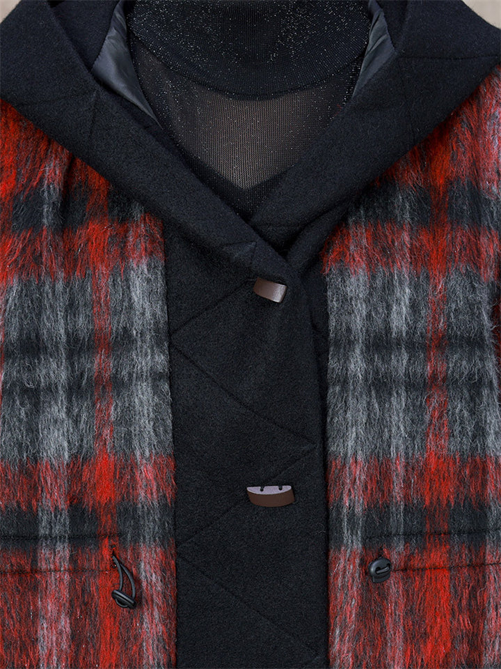 Female Plaid Patchwork Hooded Fake Two Piece Wool Blend Coat