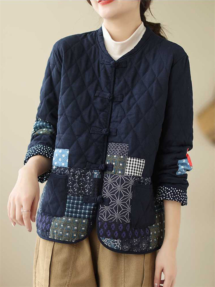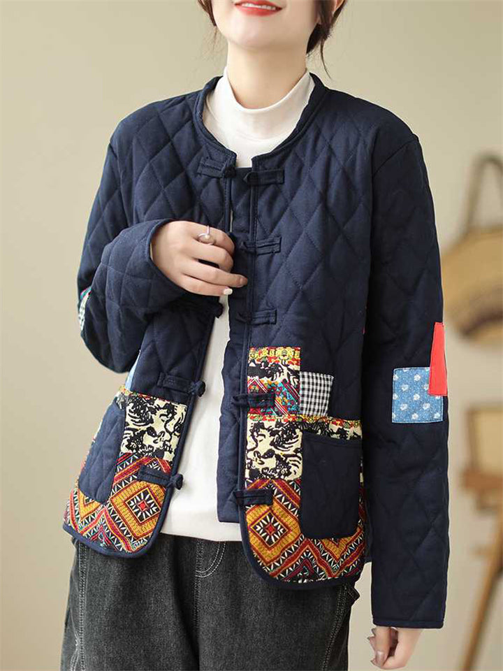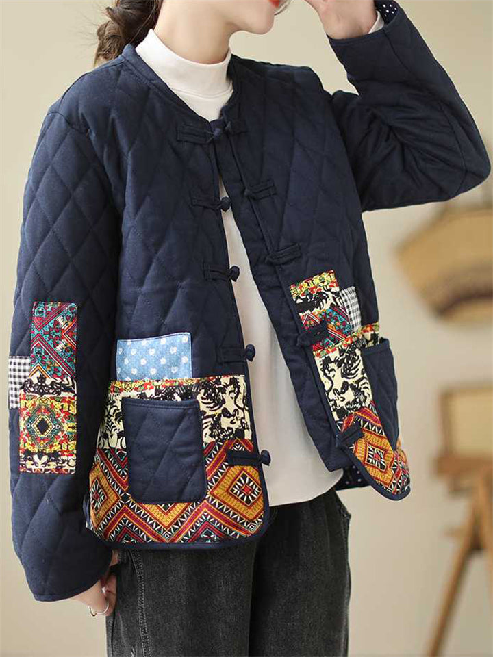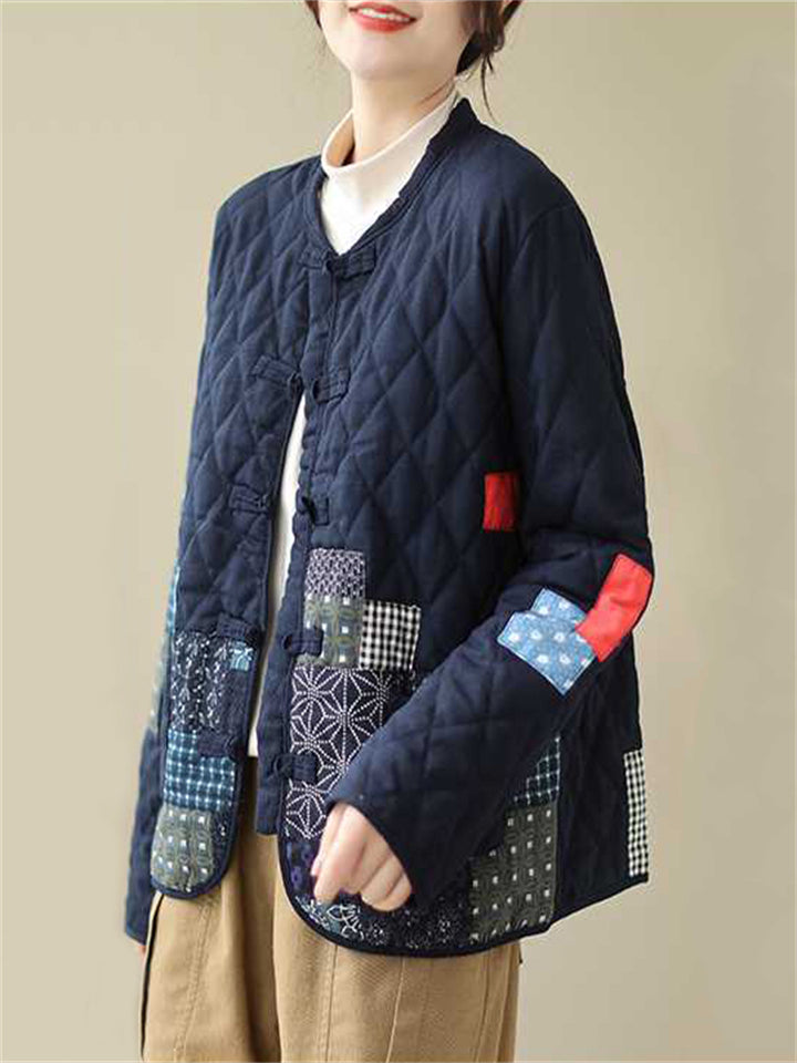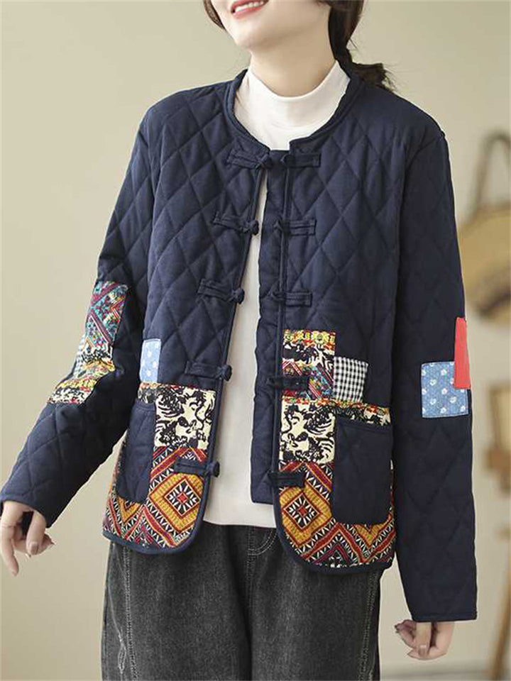 Women's Retro Print Stand Collar Long Sleeve Padded Coat