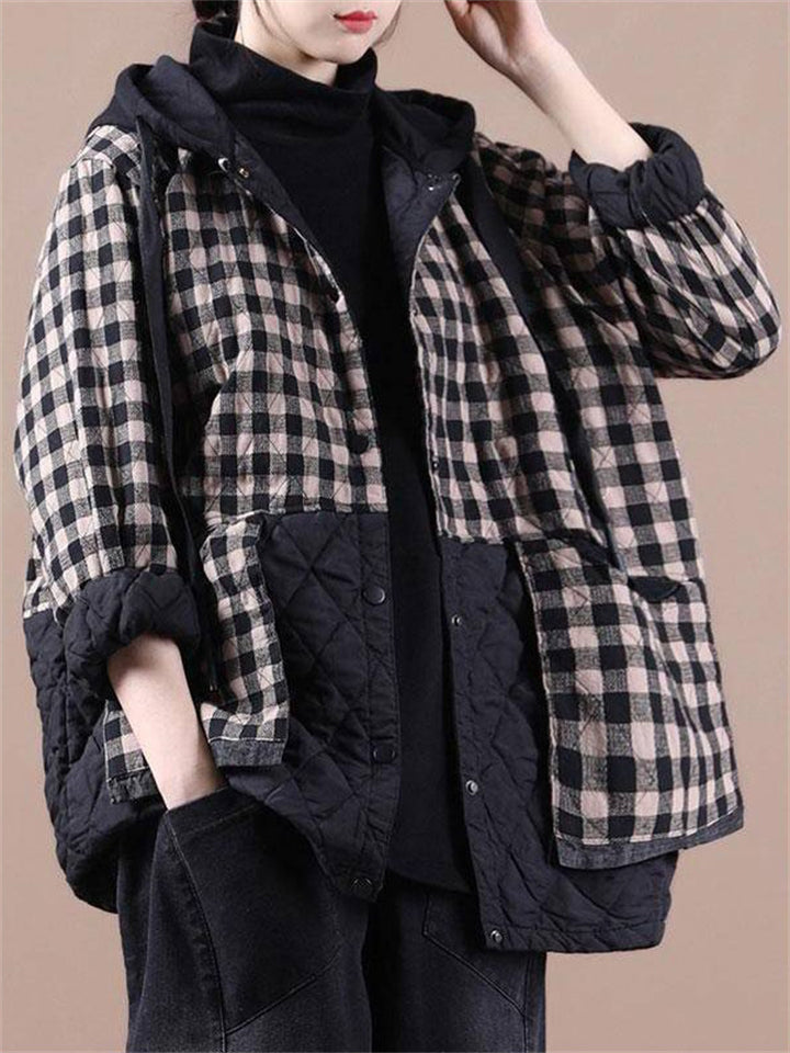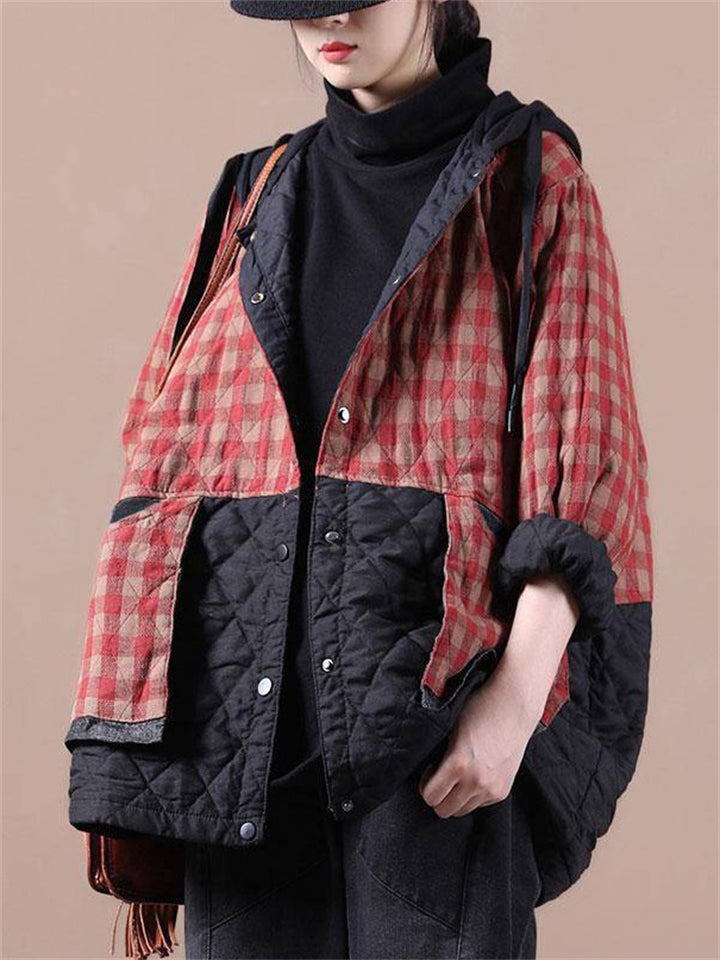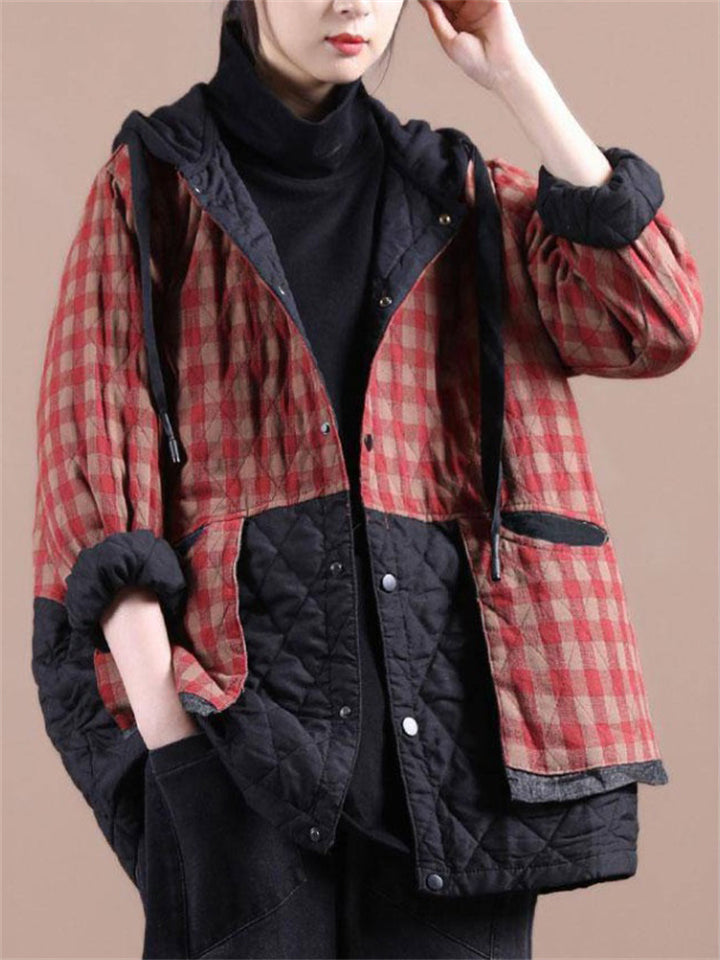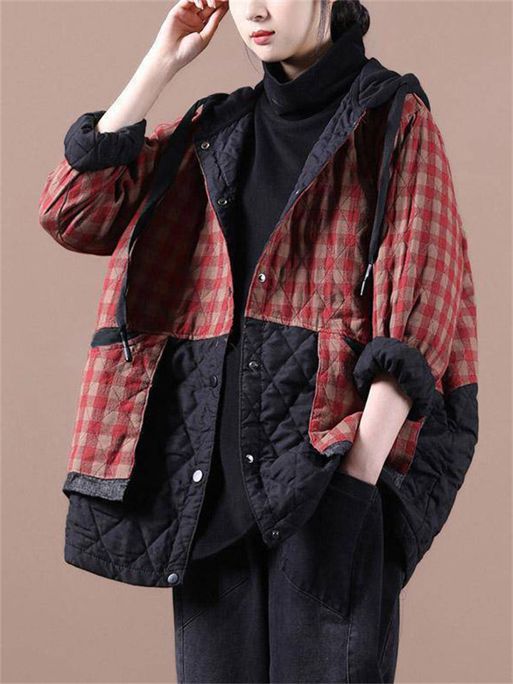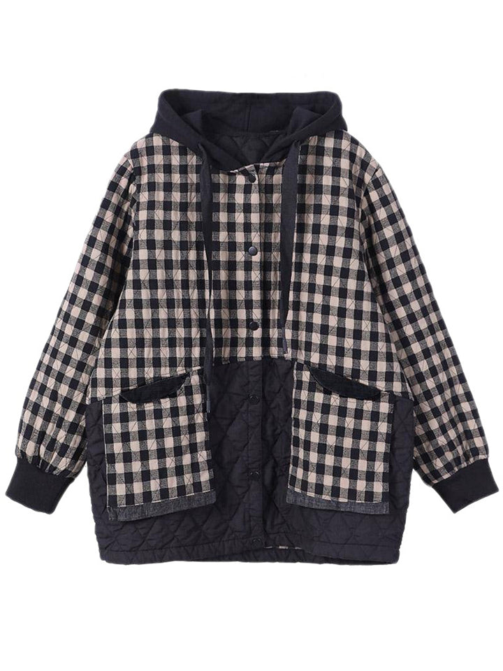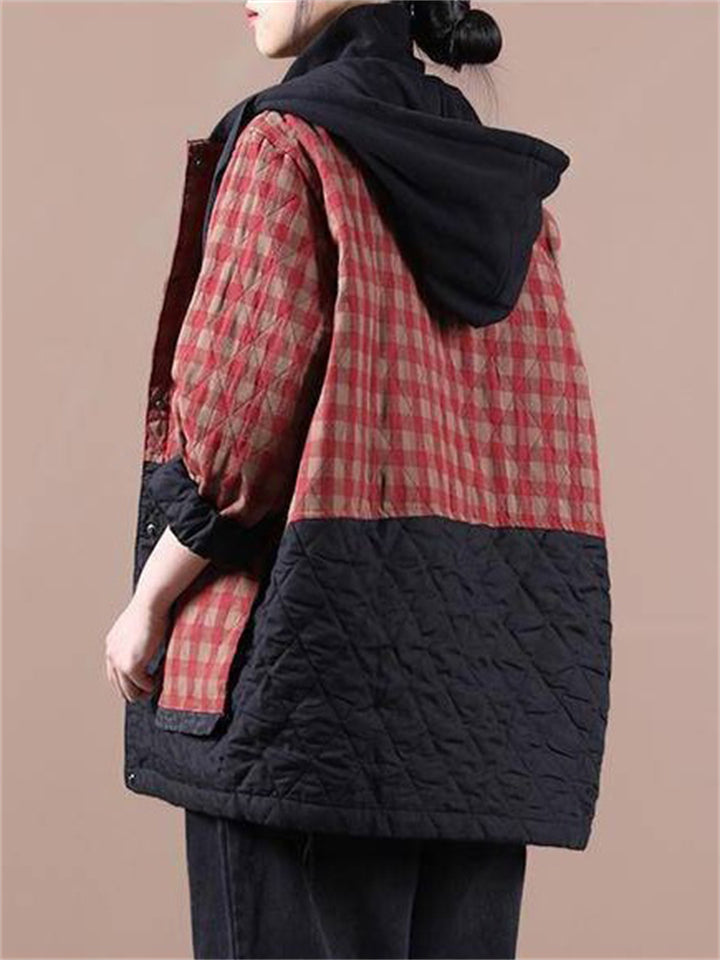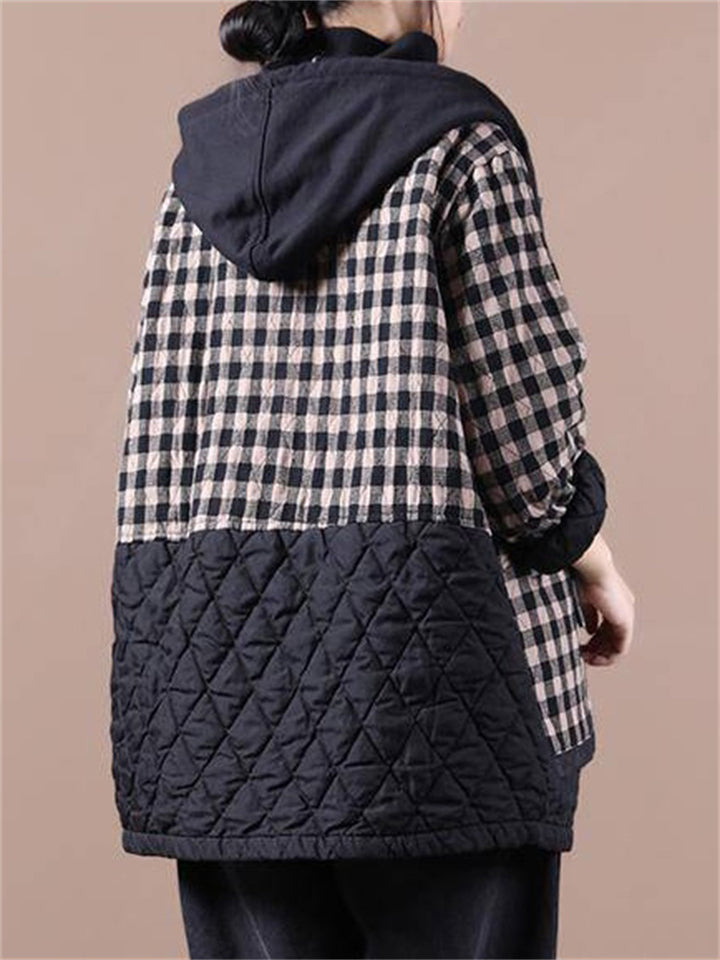Leisure Plaid Patchwork Hooded Padded Coats for Ladies