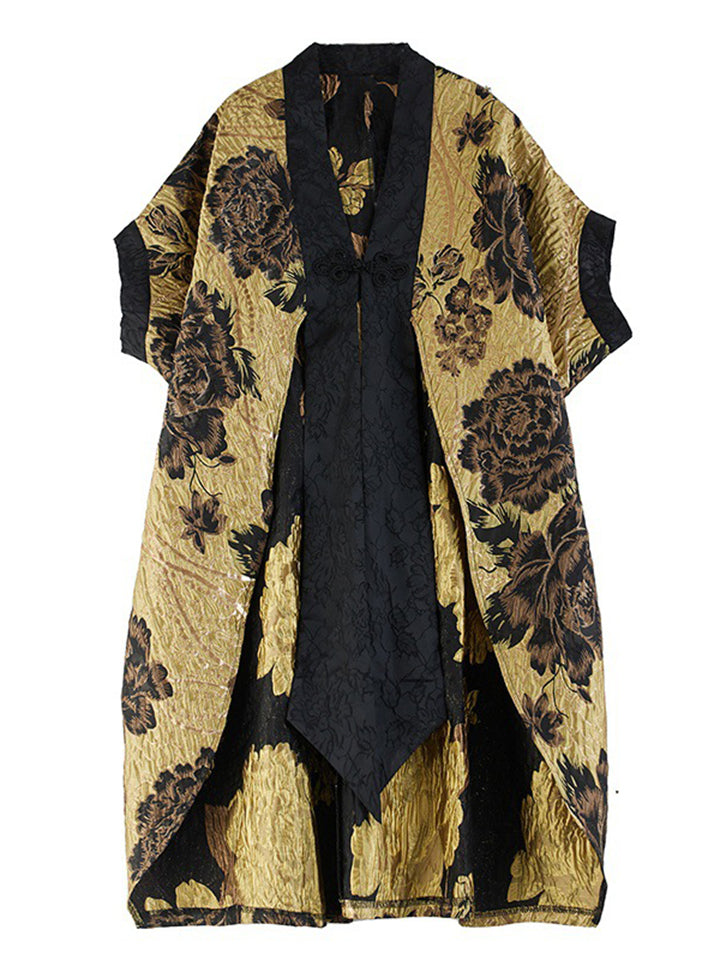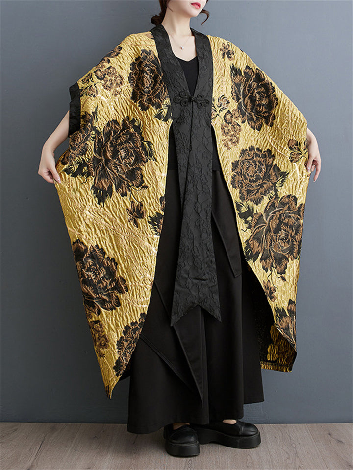 Women's Ethnic Style Trimmings Patchwork Black Cardigan Coat