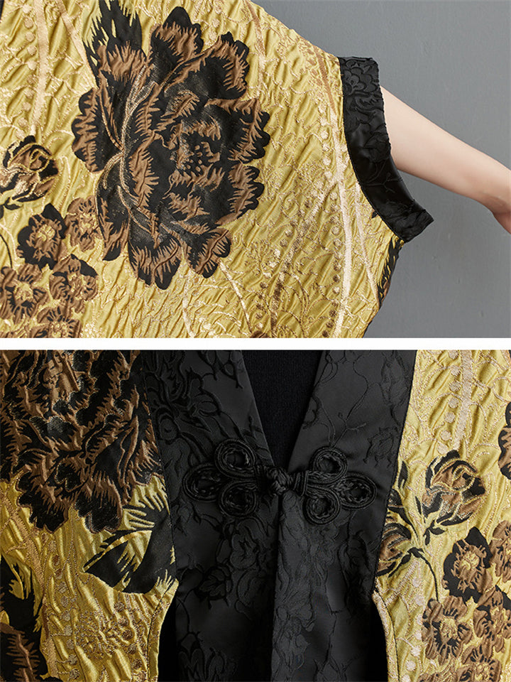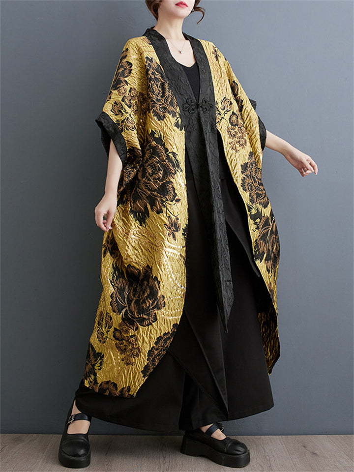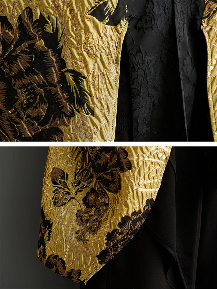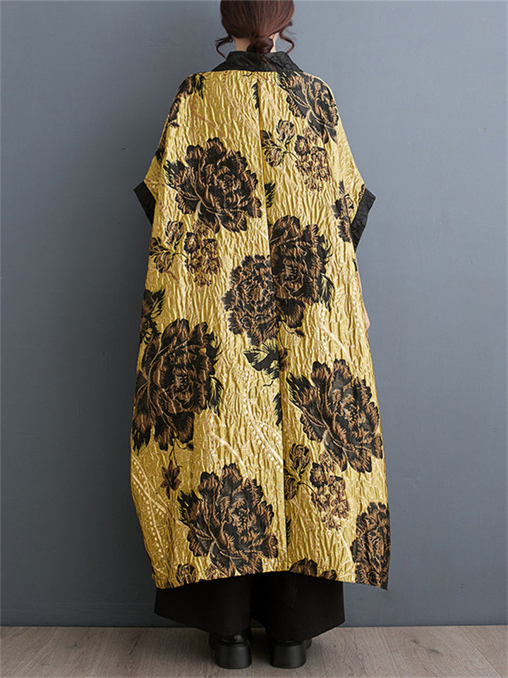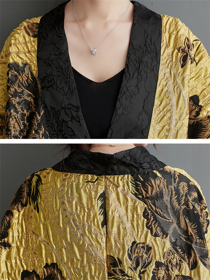 Luxury Golden Yellow Peony Jacquard Women's Long Coat