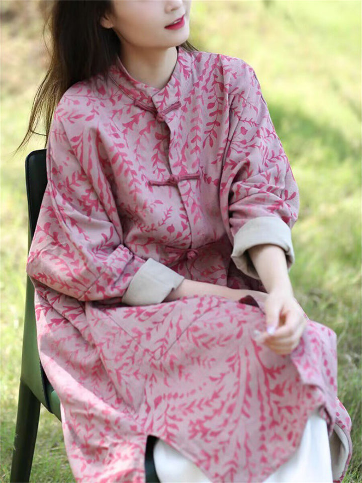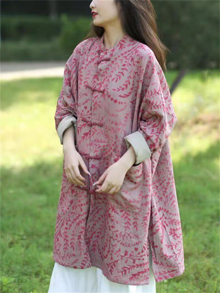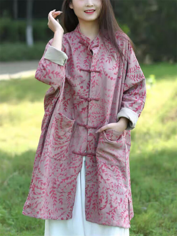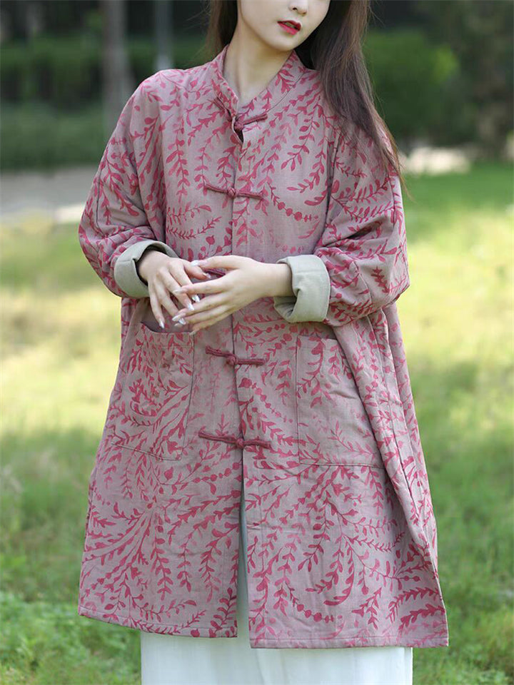 Women's Casual Leaf Print Stand Collar Cotton Linen Coat
