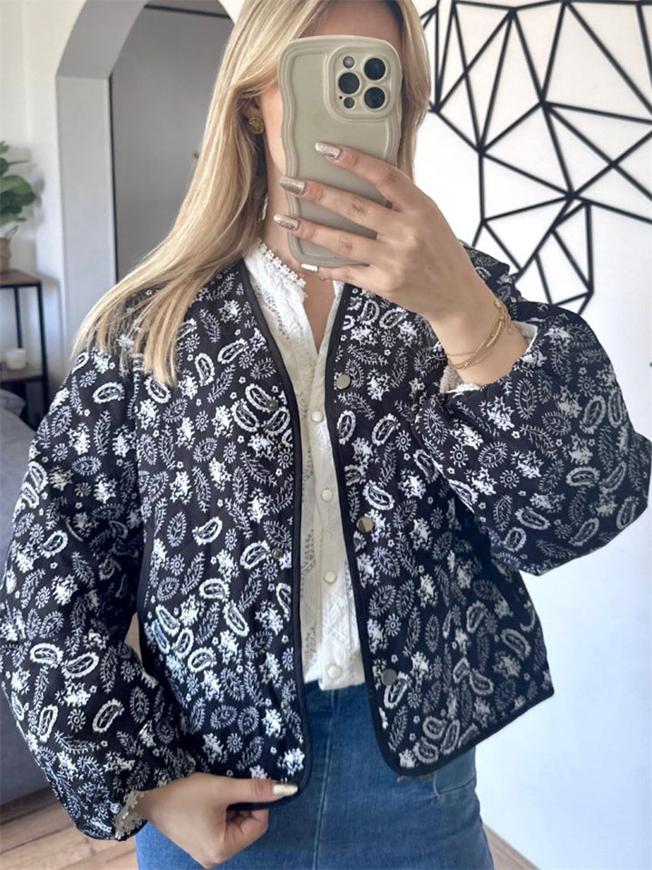 Women's Retro Print Stand Collar Long Sleeve Padded Coat