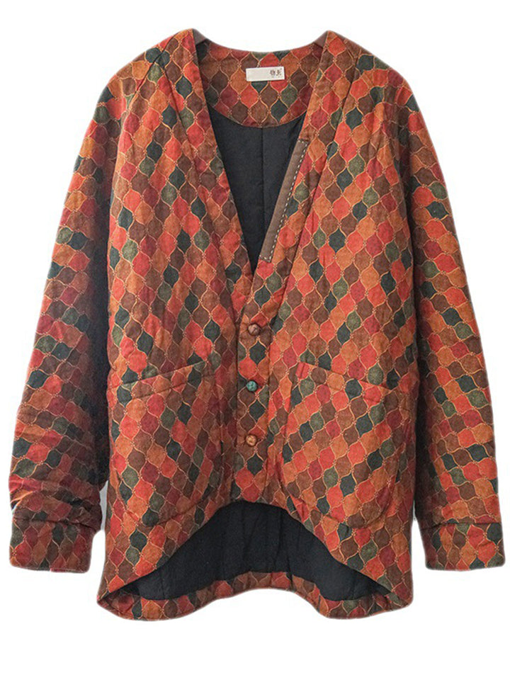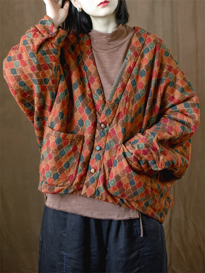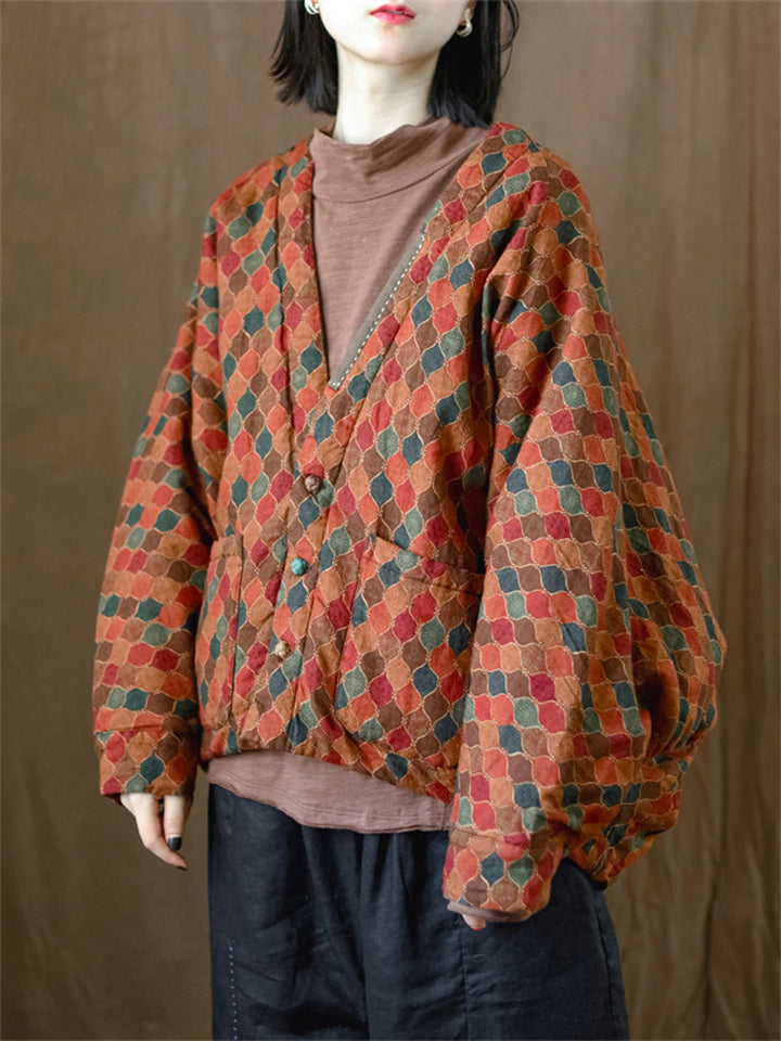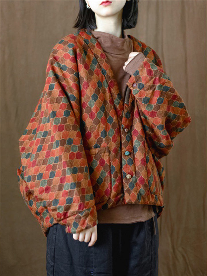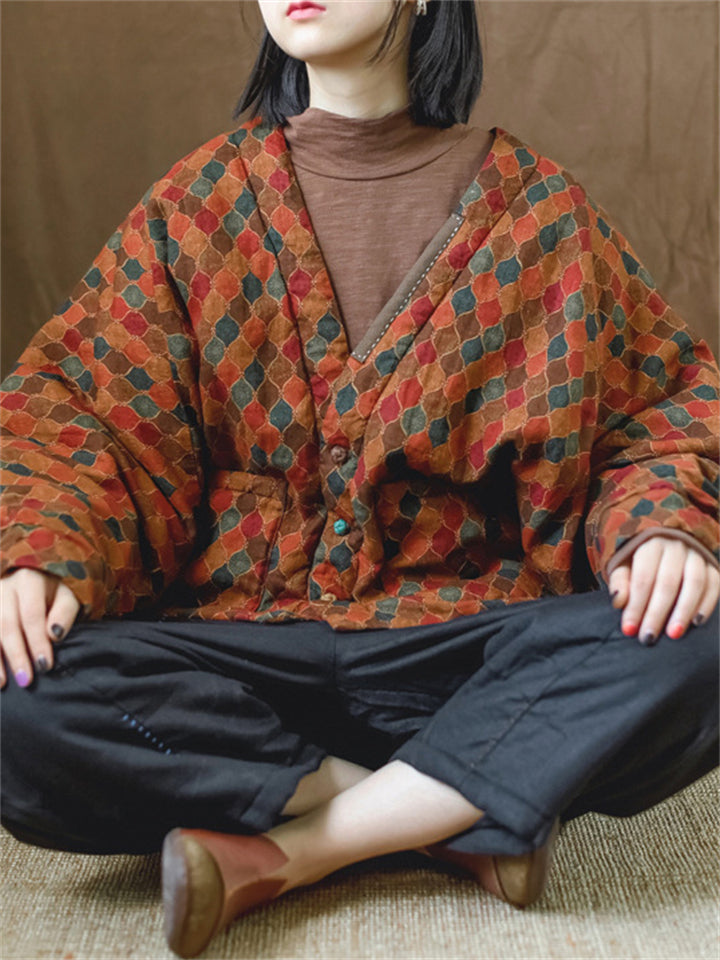 Women's Colorful Plaid V Neck Batwing Sleeve Cotton Padded Coat