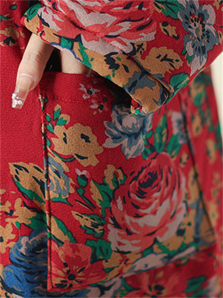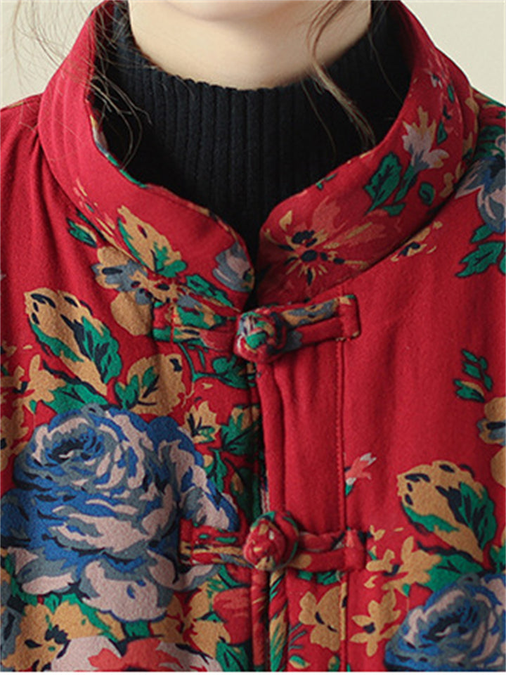 Women's Country Style Stand Collar Rose Print Red Cotton Coat