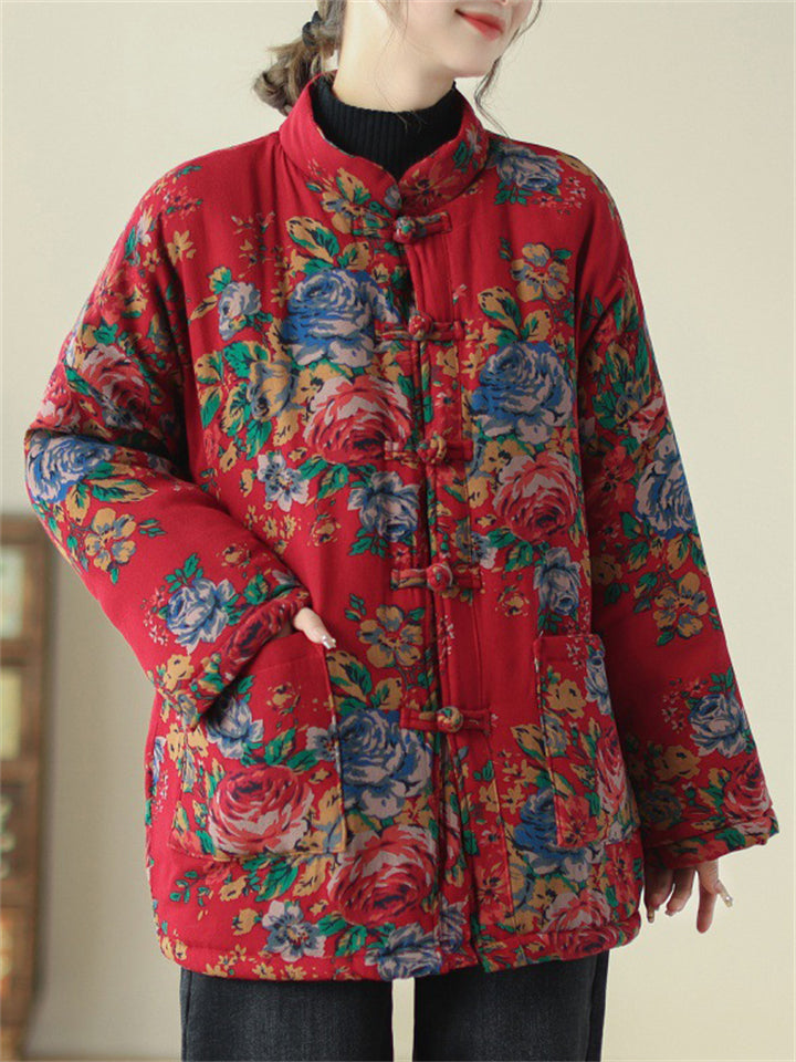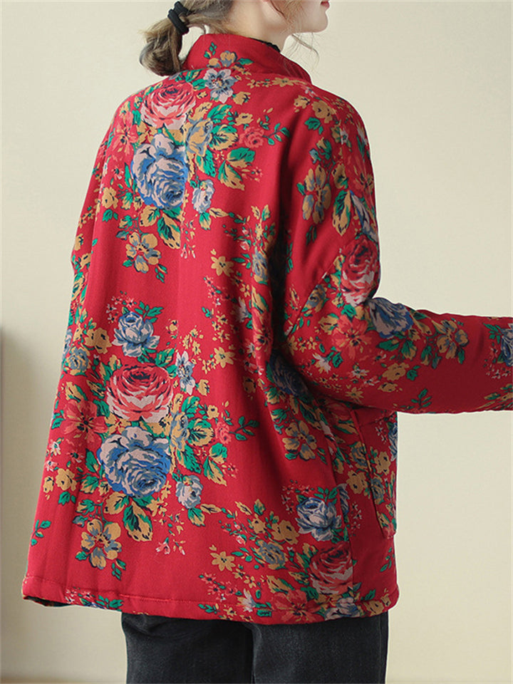 Women's Retro Print Stand Collar Long Sleeve Padded Coat