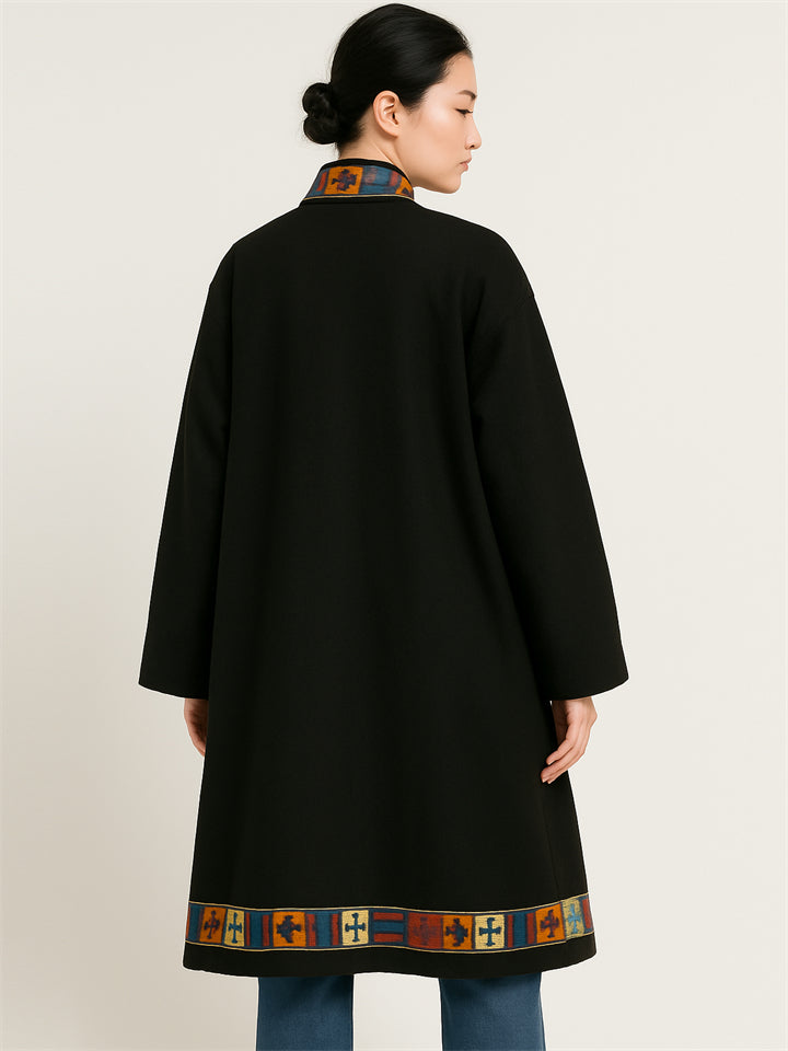 Women's Ethnic Style Trimmings Patchwork Black Cardigan Coat