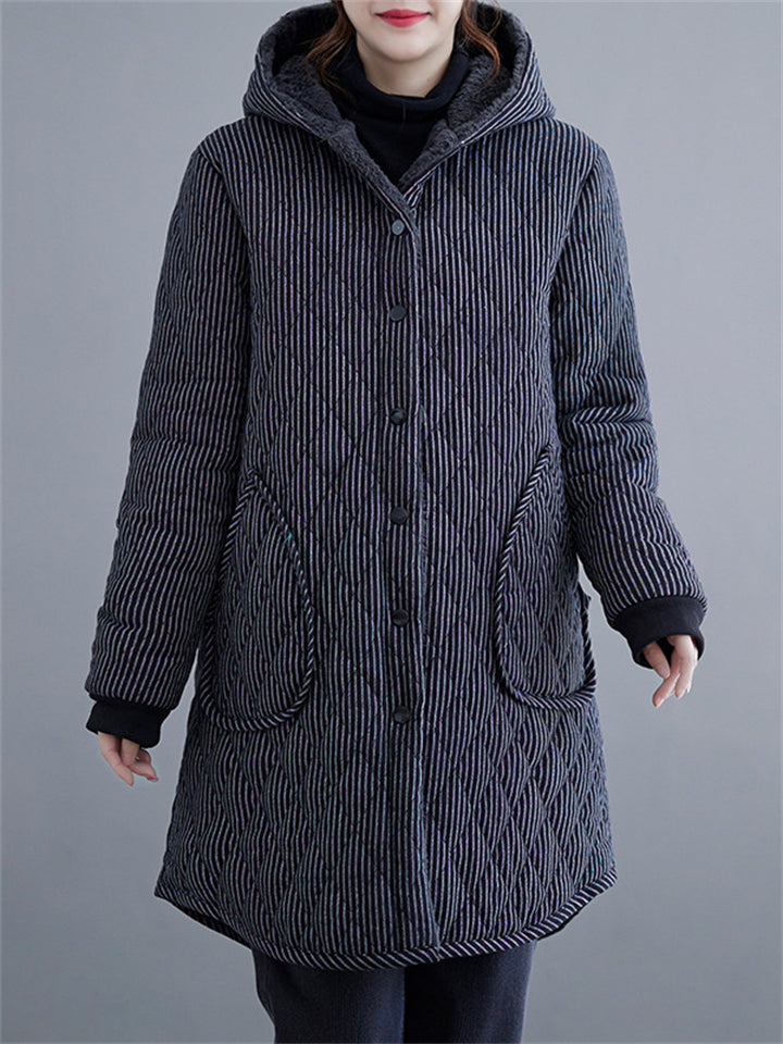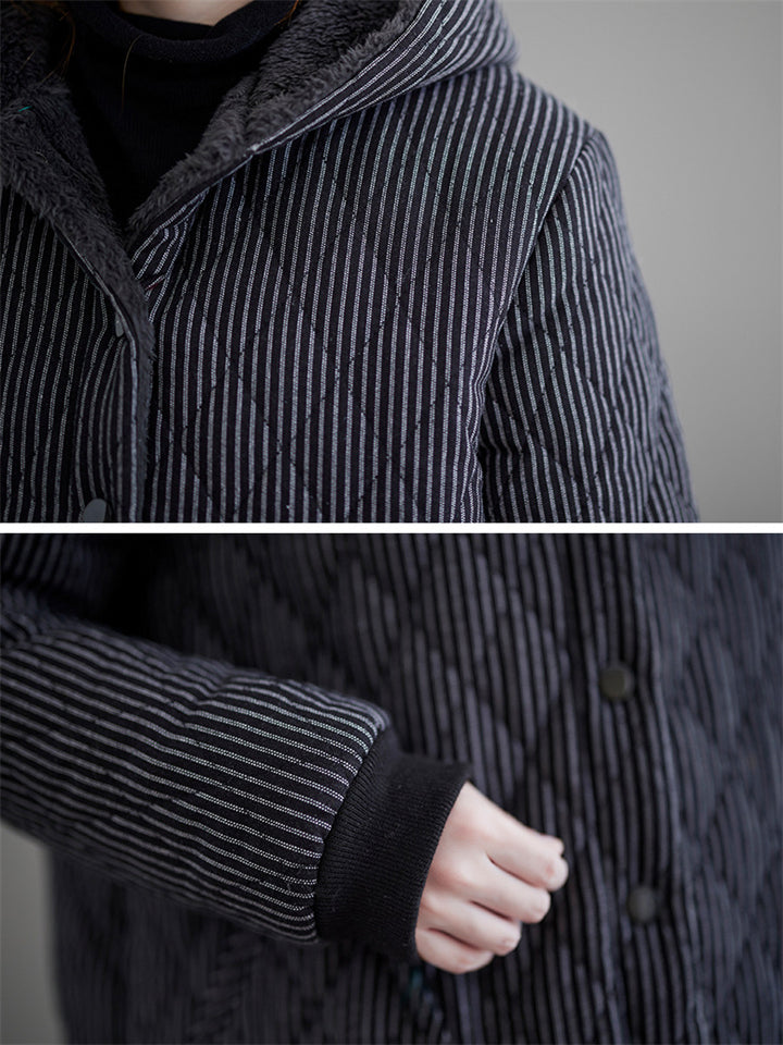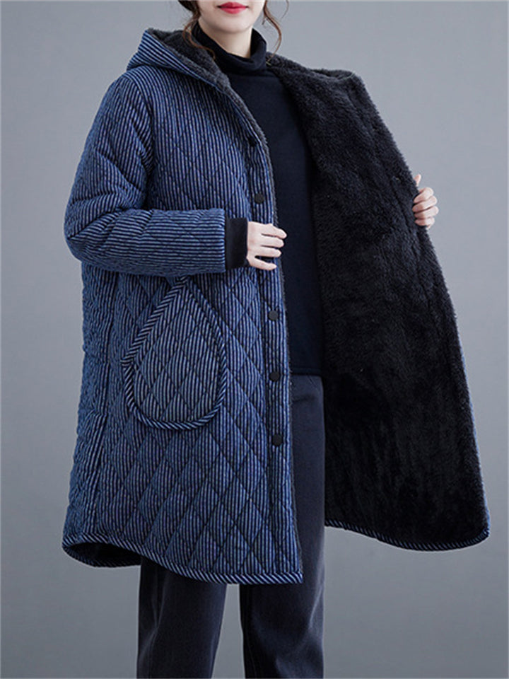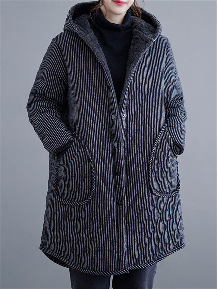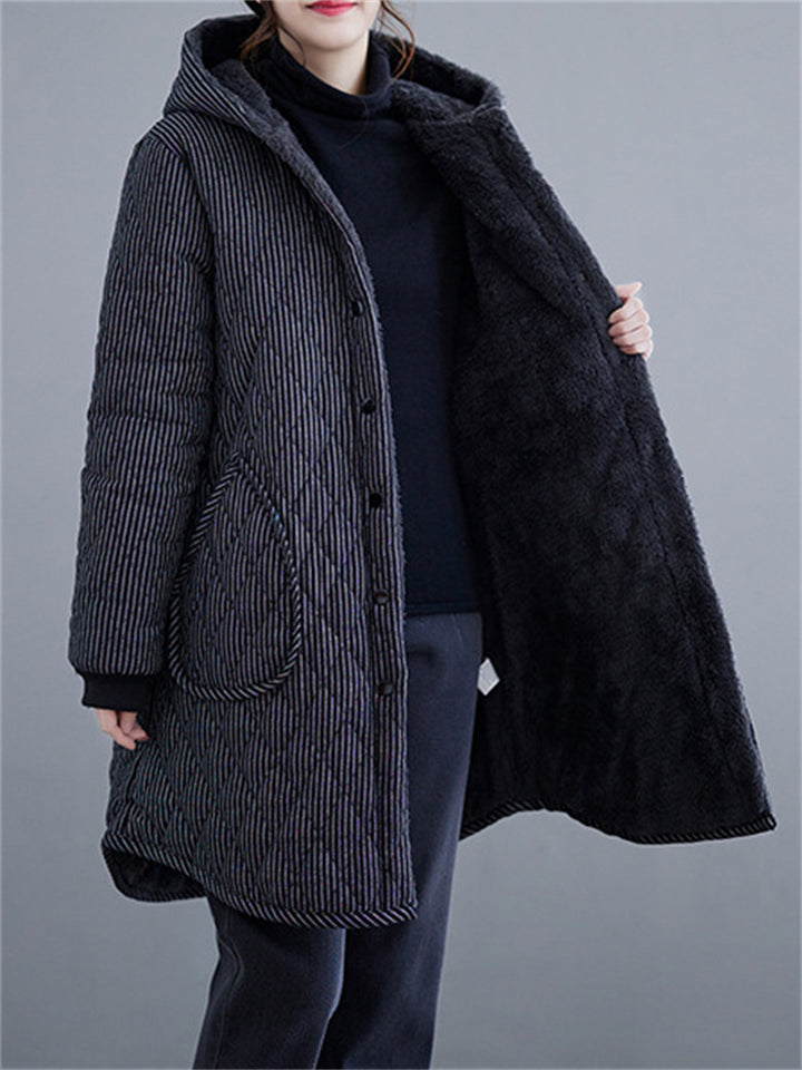 Women's Stripe Warm Plush Lining Casual Mid-Length Hooded Coat