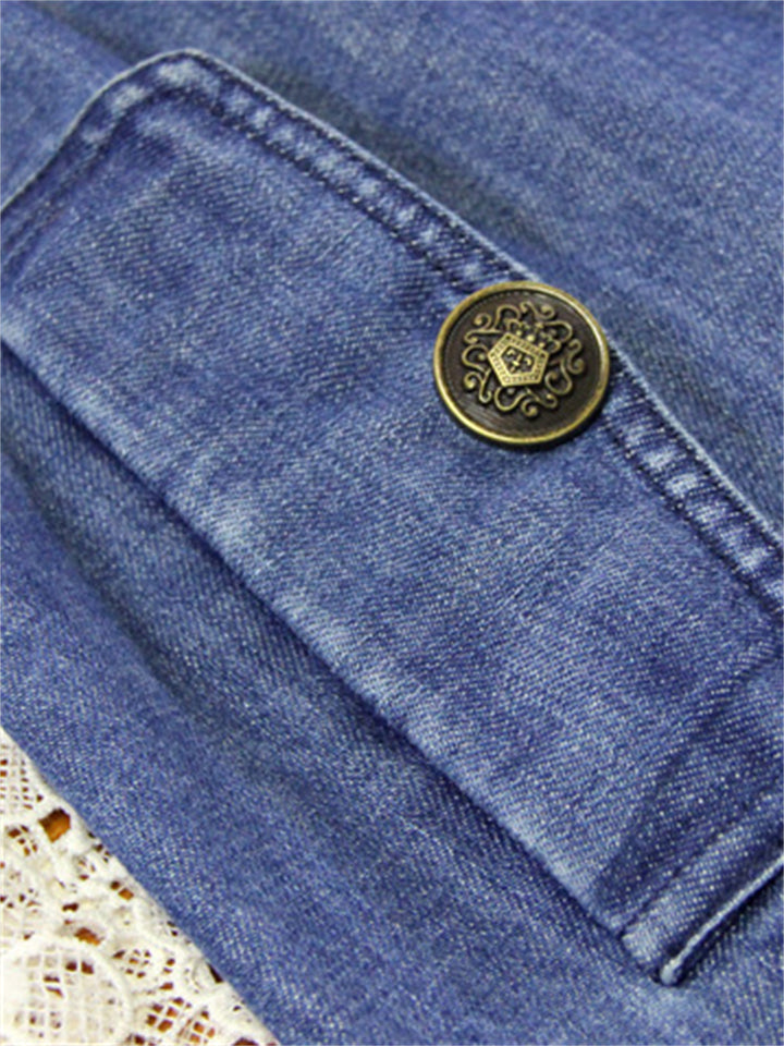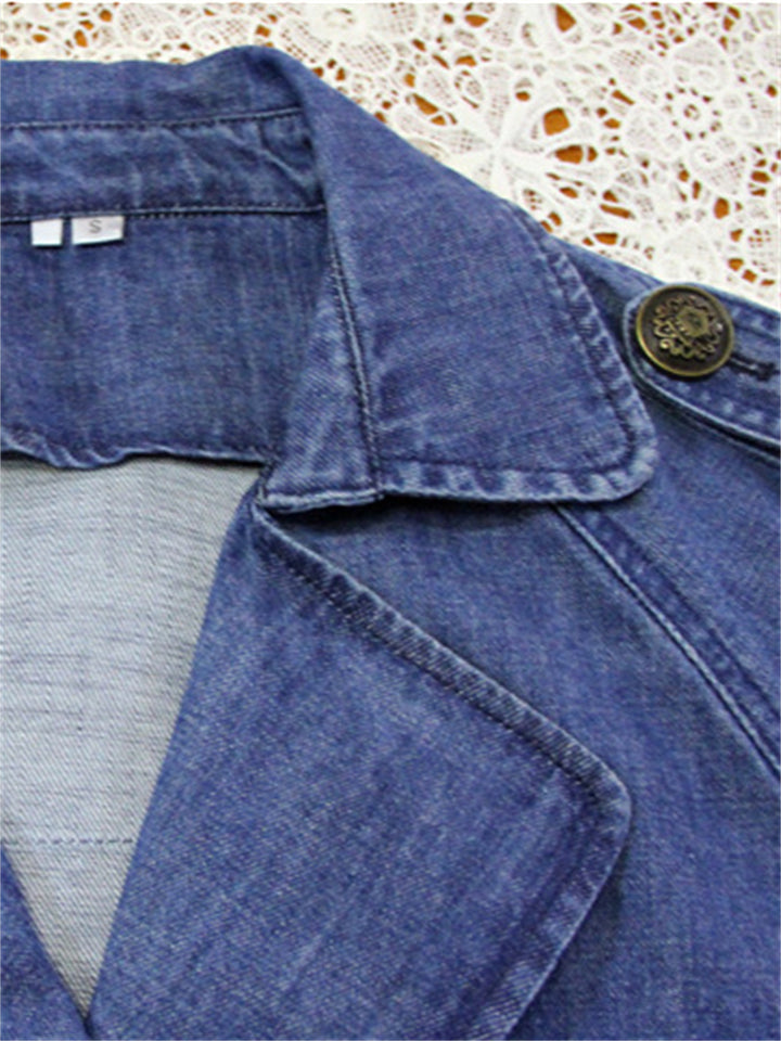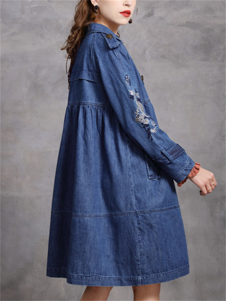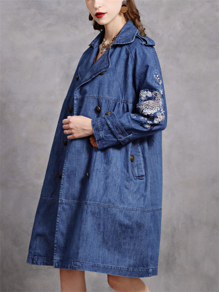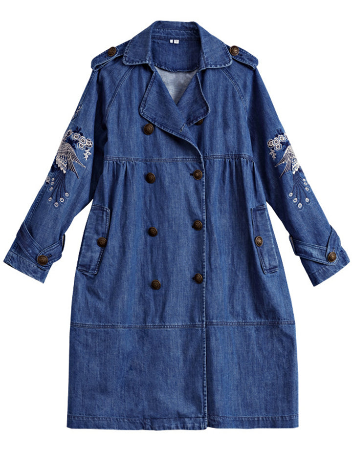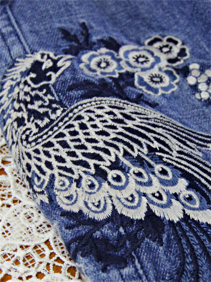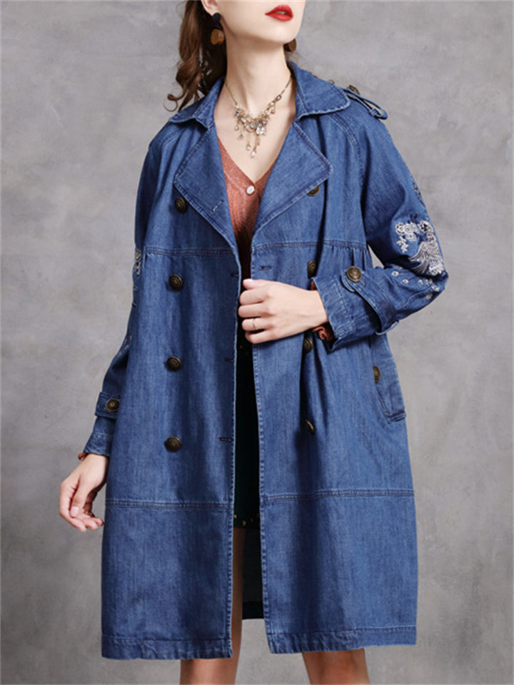 Women's Stylish Peacock Embroidery Double Breasted Denim Coat