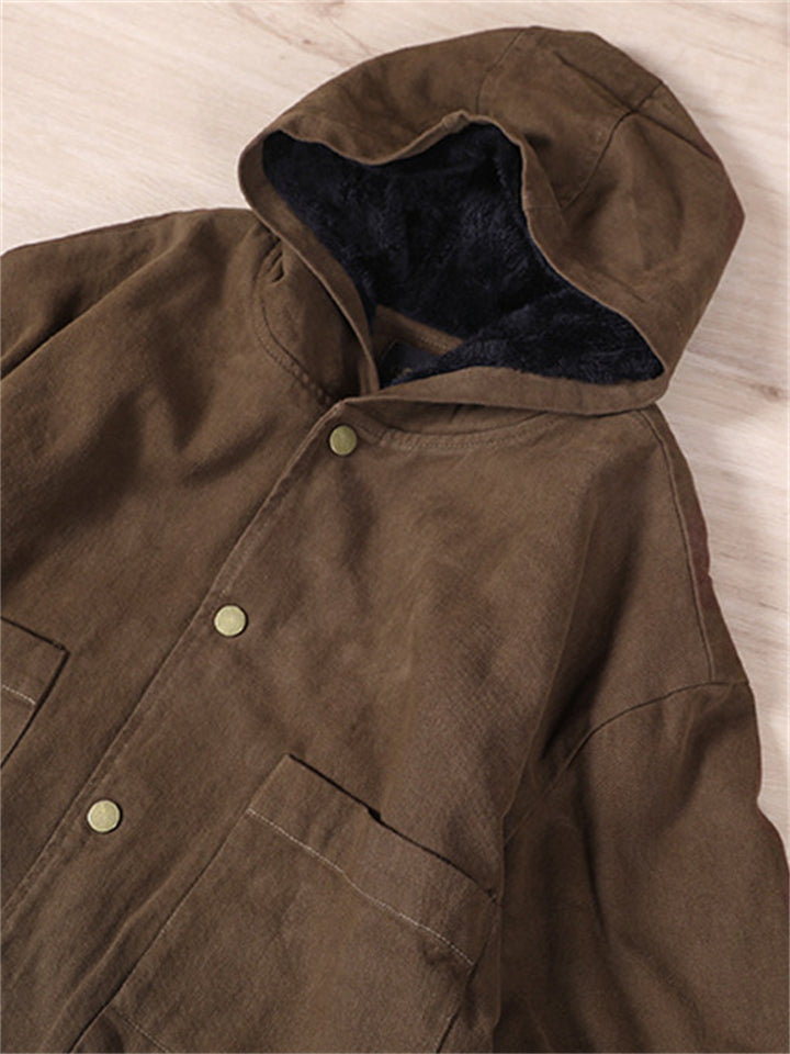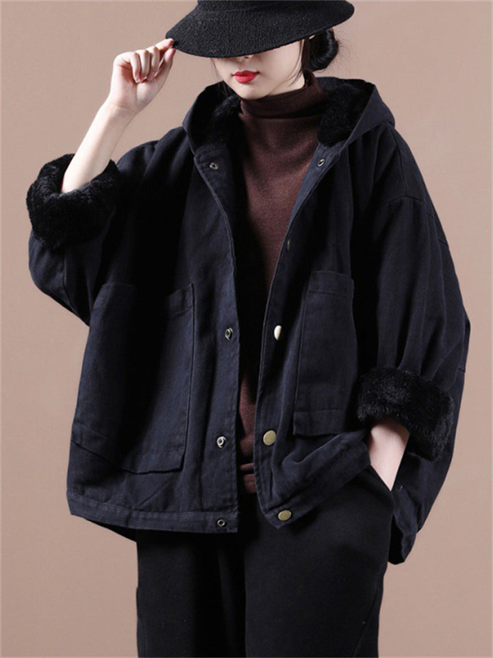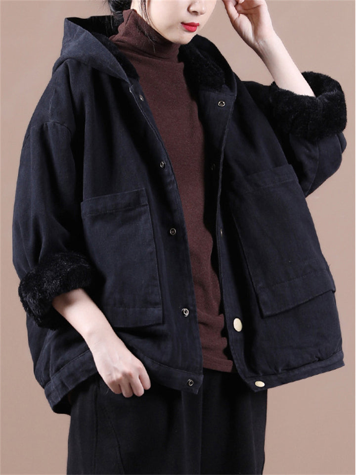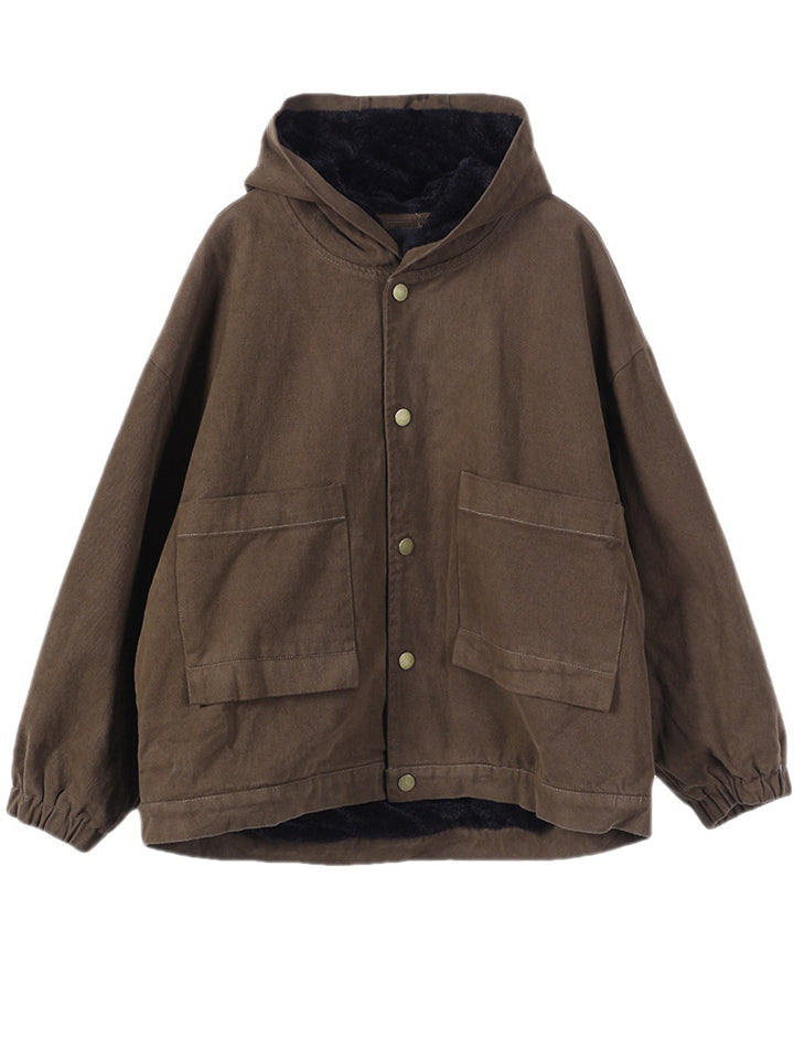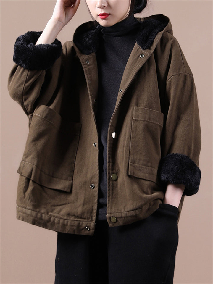 Women's Trendy Hooded Patch Pocket Plush Lining Coat