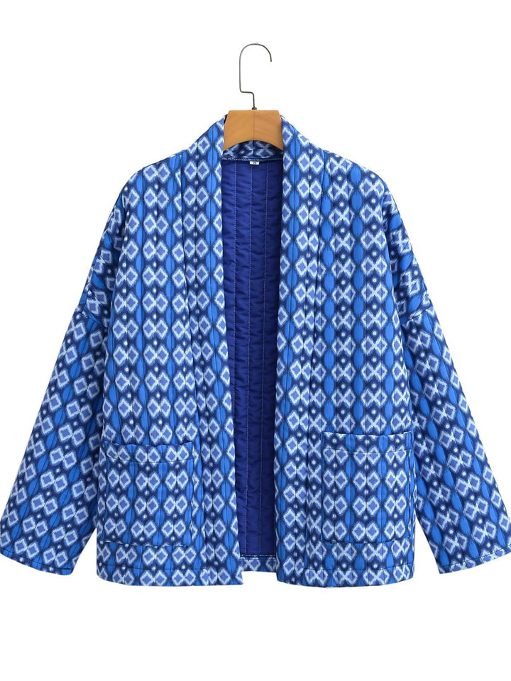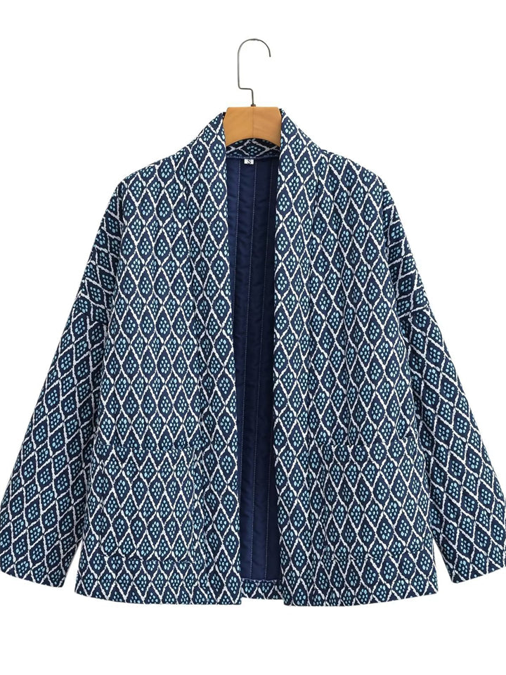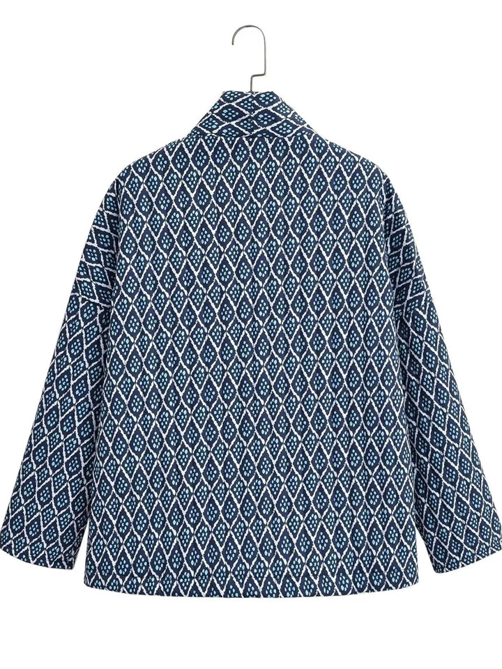 Women's Autumn Blue Printed Long Sleeve Lace Up Cardigan Coat