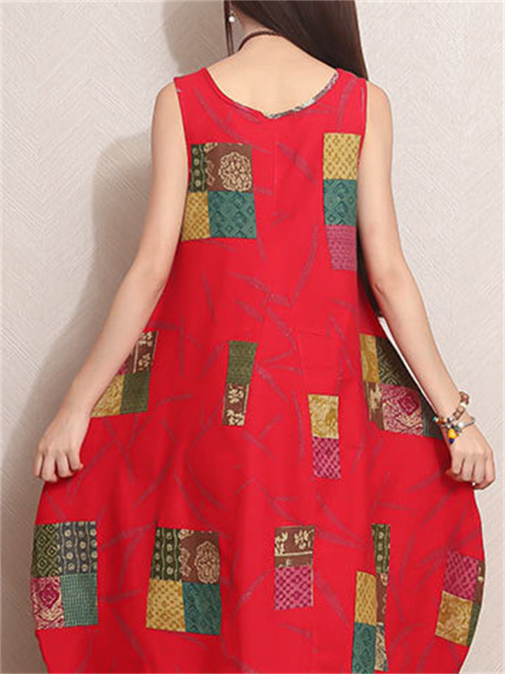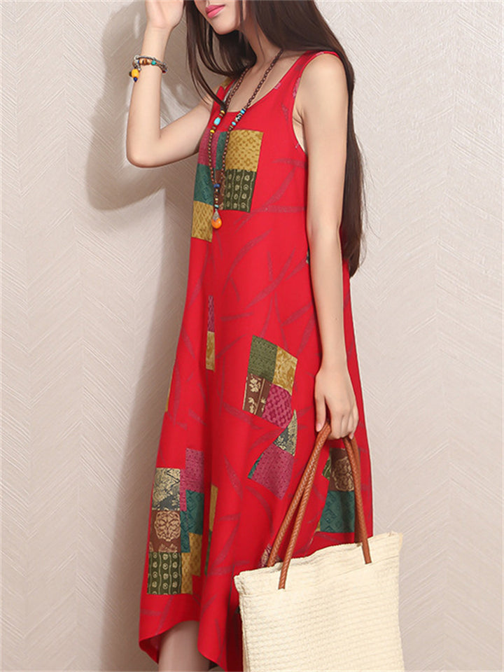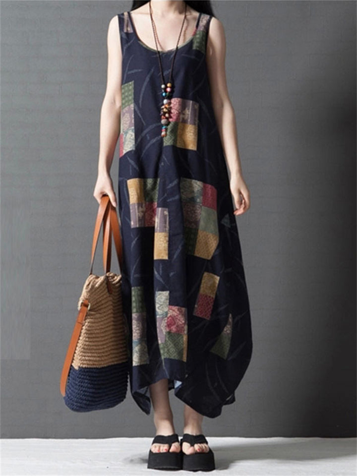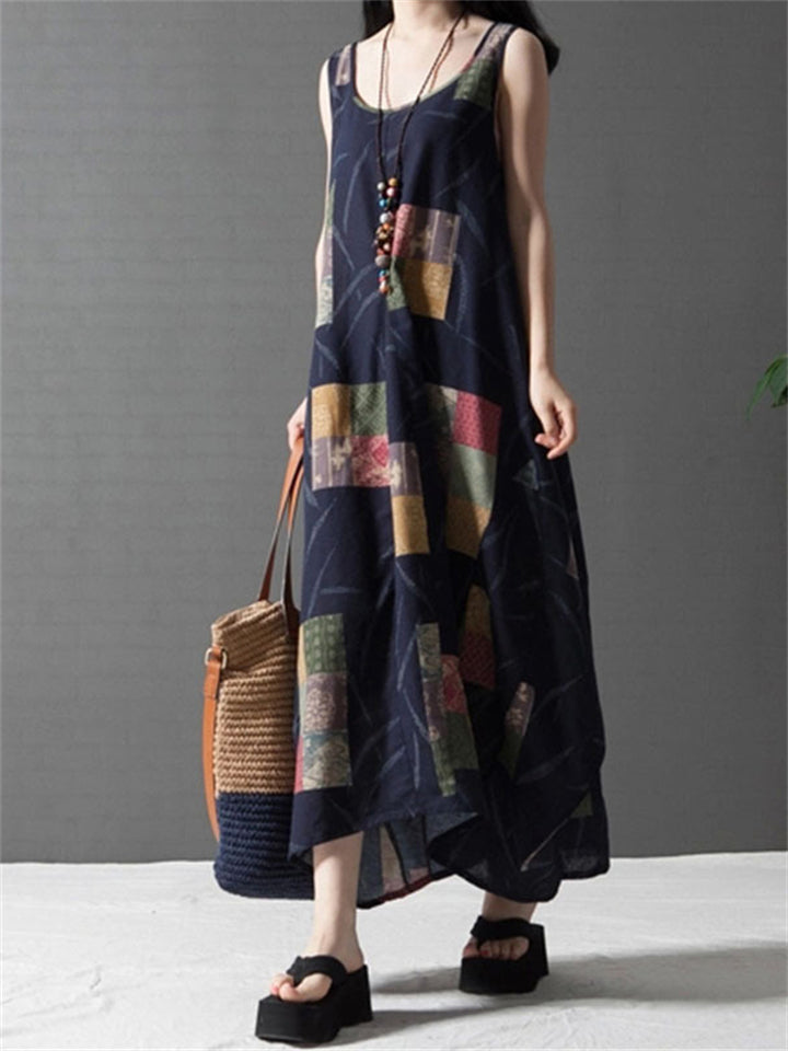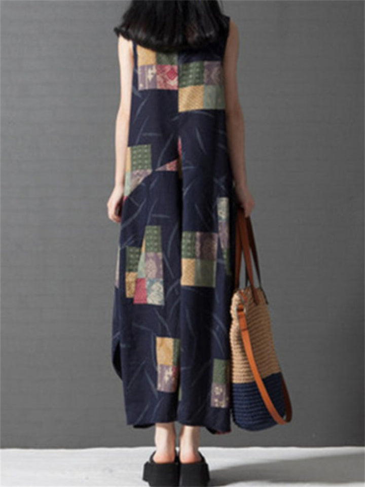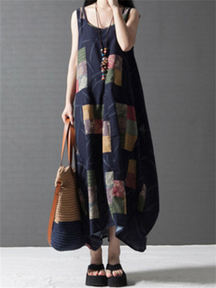Women's Oriental Style Elegant Print Patchwork Sleeveless Dress