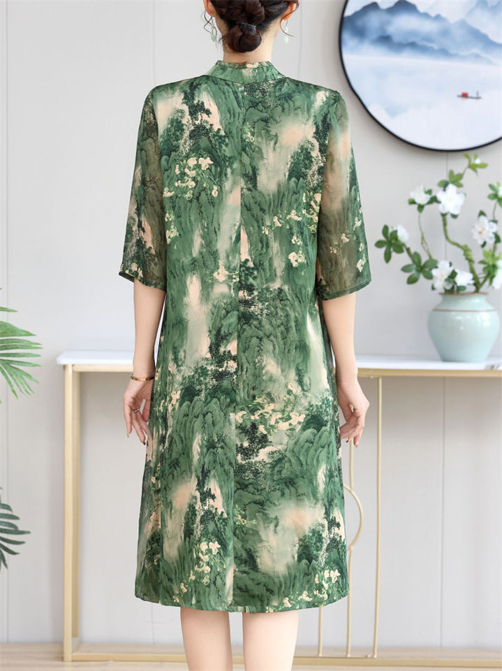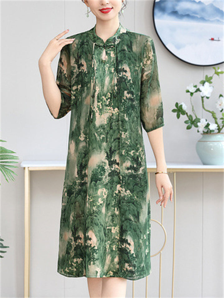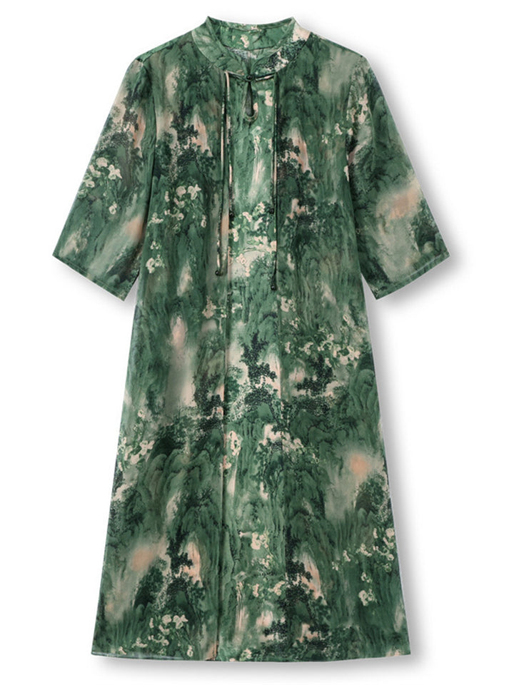 Chinese Style Green Landscape Print Cheongsam Collar Dress for Women