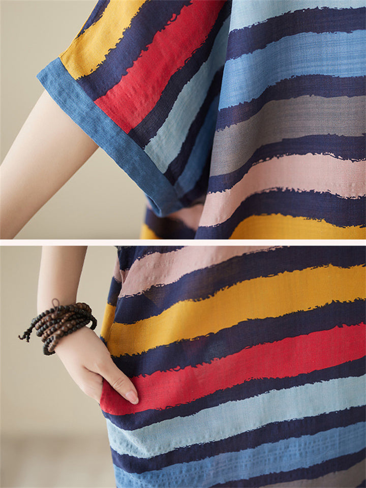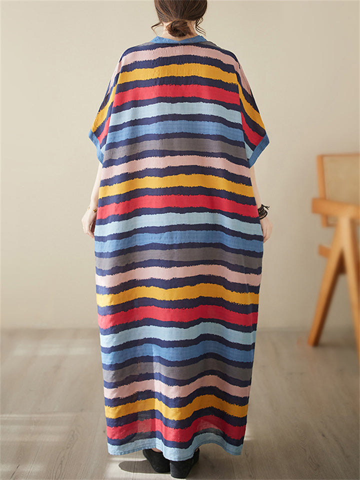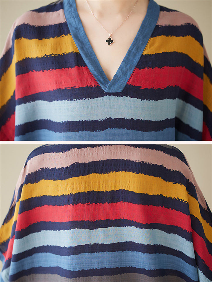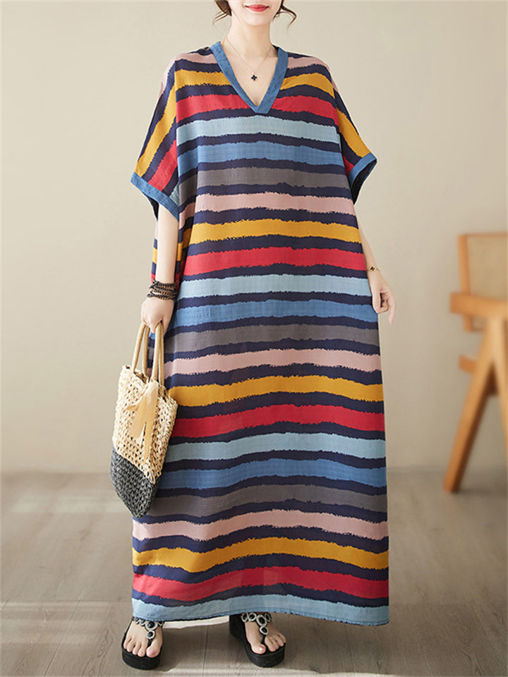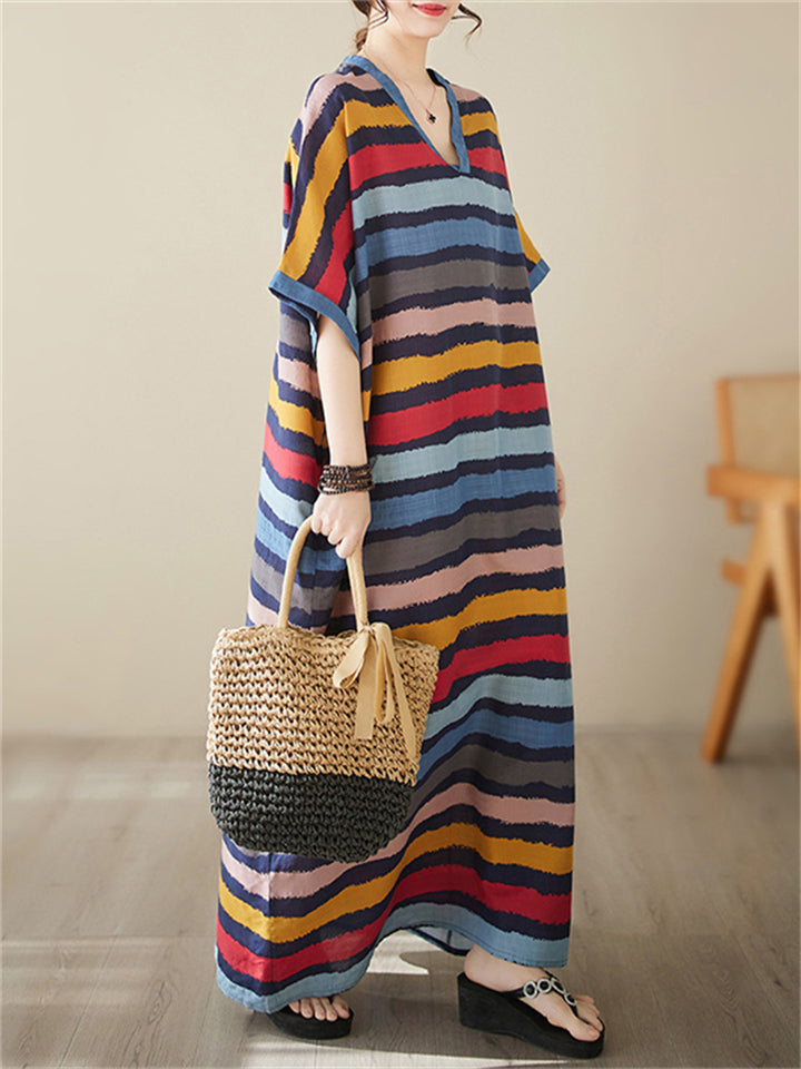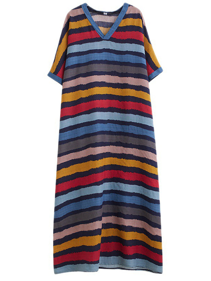 Colorful Stripes V Neck Vacation Long Dress for Women