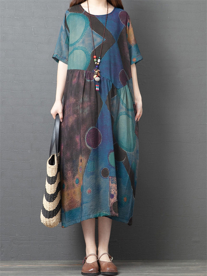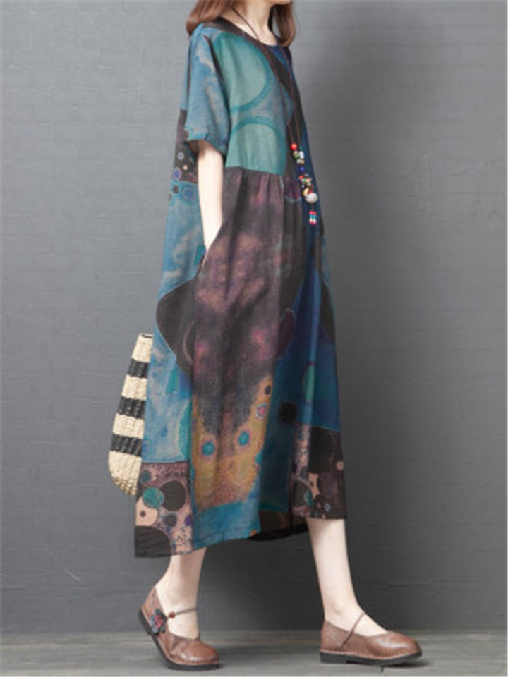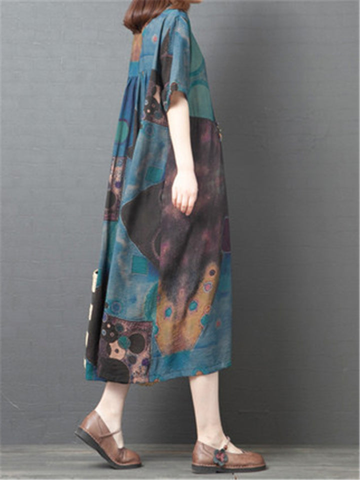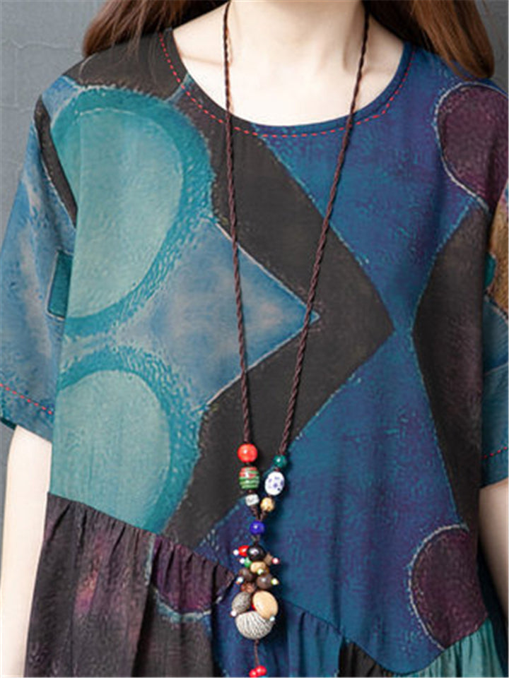Women's Summer Printed Patchwork Half Sleeve Big Hem Maxi Dress