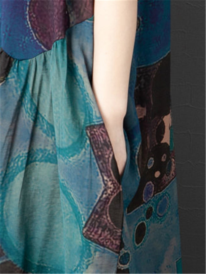 Women's Oriental Style Elegant Print Patchwork Sleeveless Dress