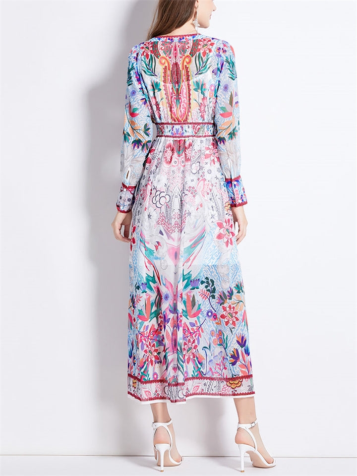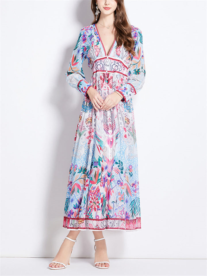 Women's Trendy Ethnic Holiday Style Print V Neck Maxi Dress