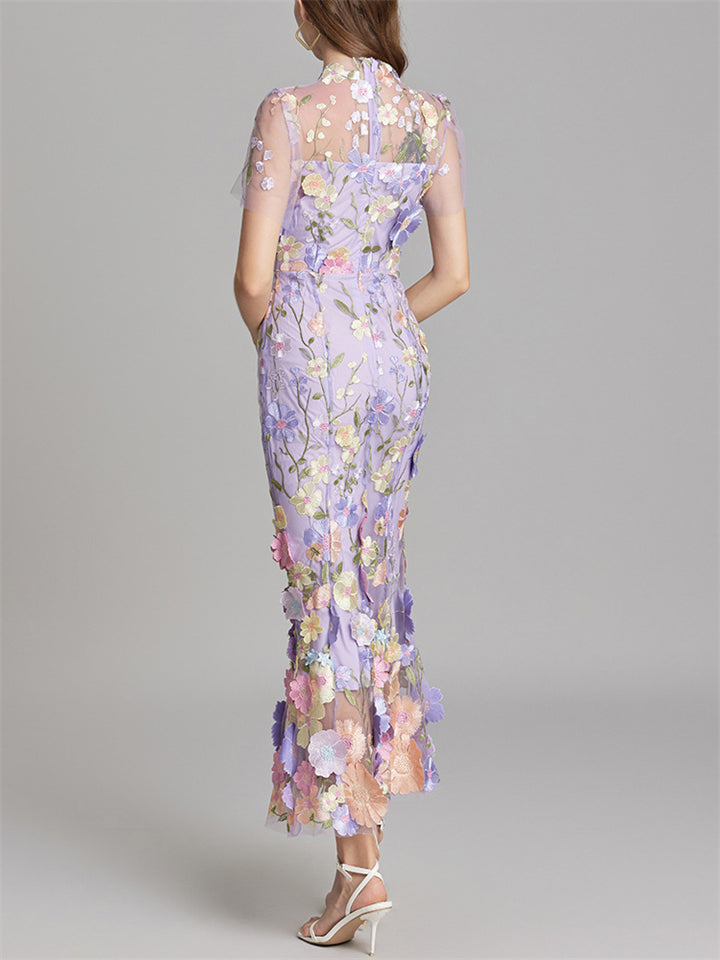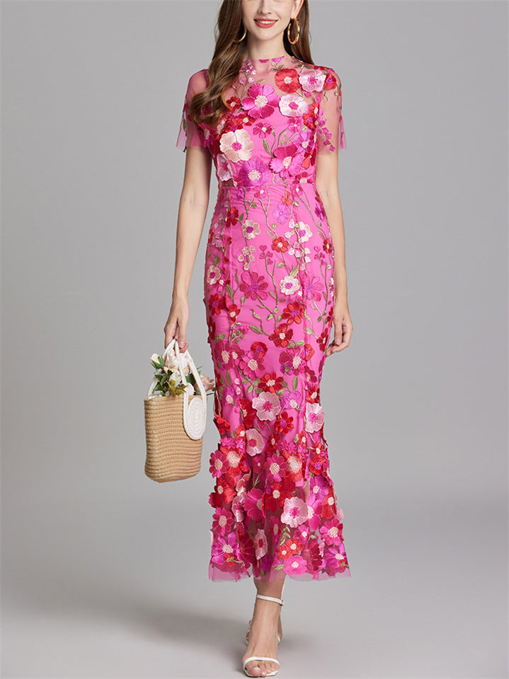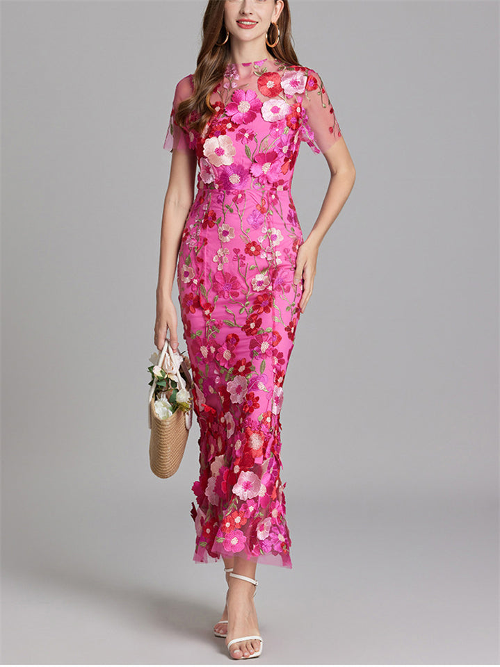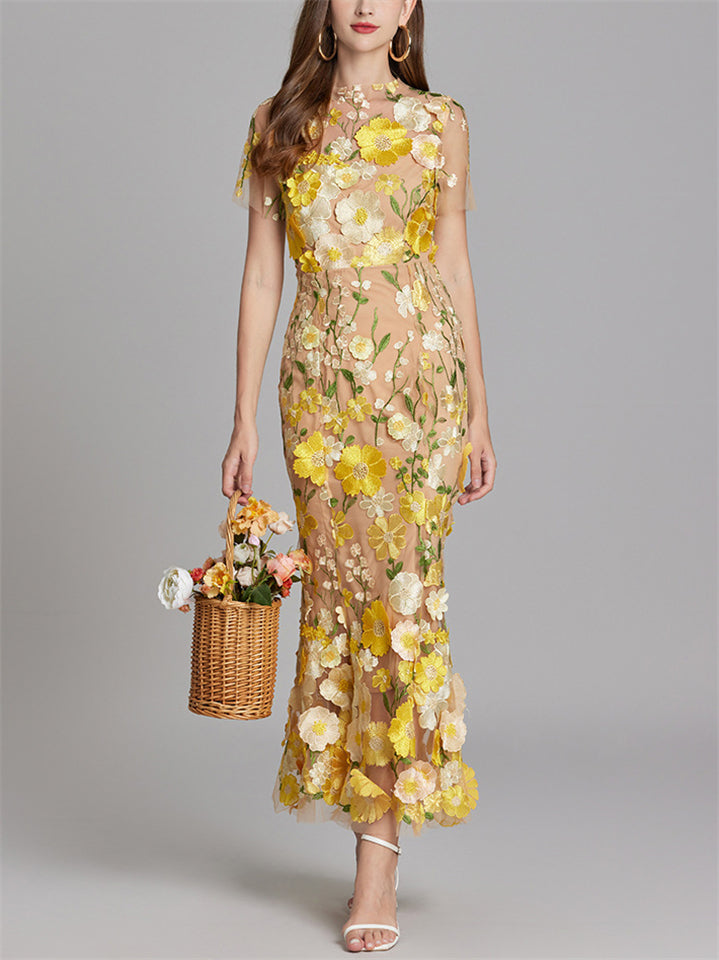 Elegant 3D Floral Embroidery Women's Sabrina Neckline Maxi Dress