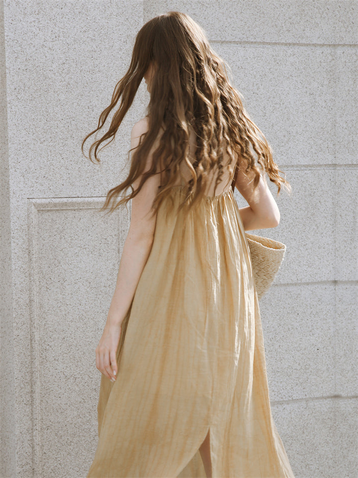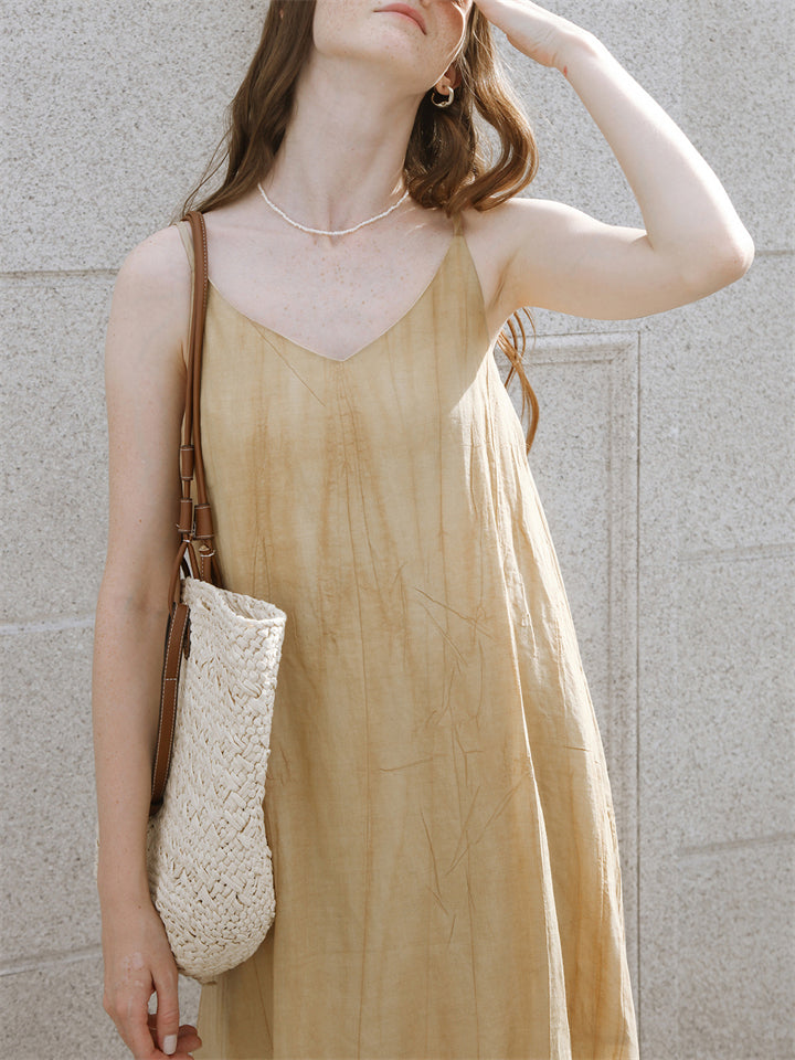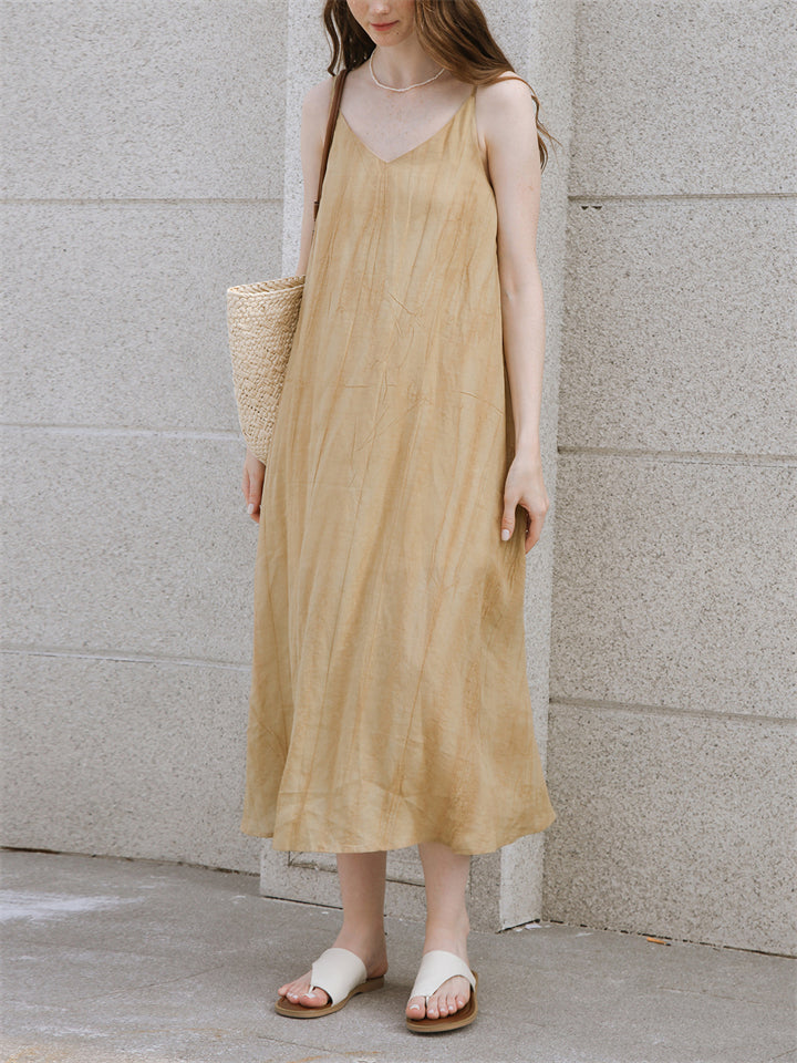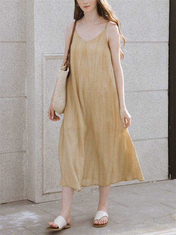Elegant Apricot V Neck Sleeveless Flowy Tencel Dress for Women