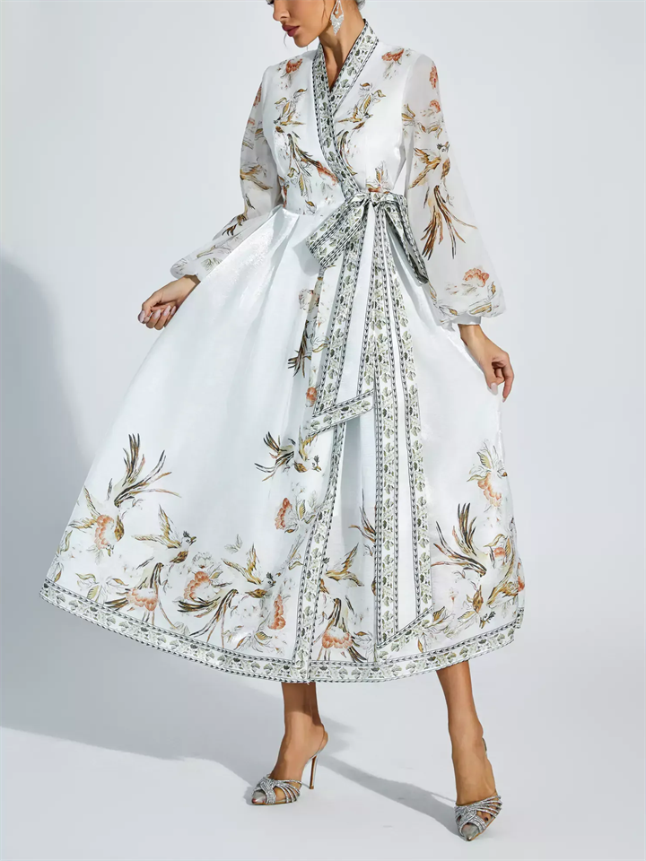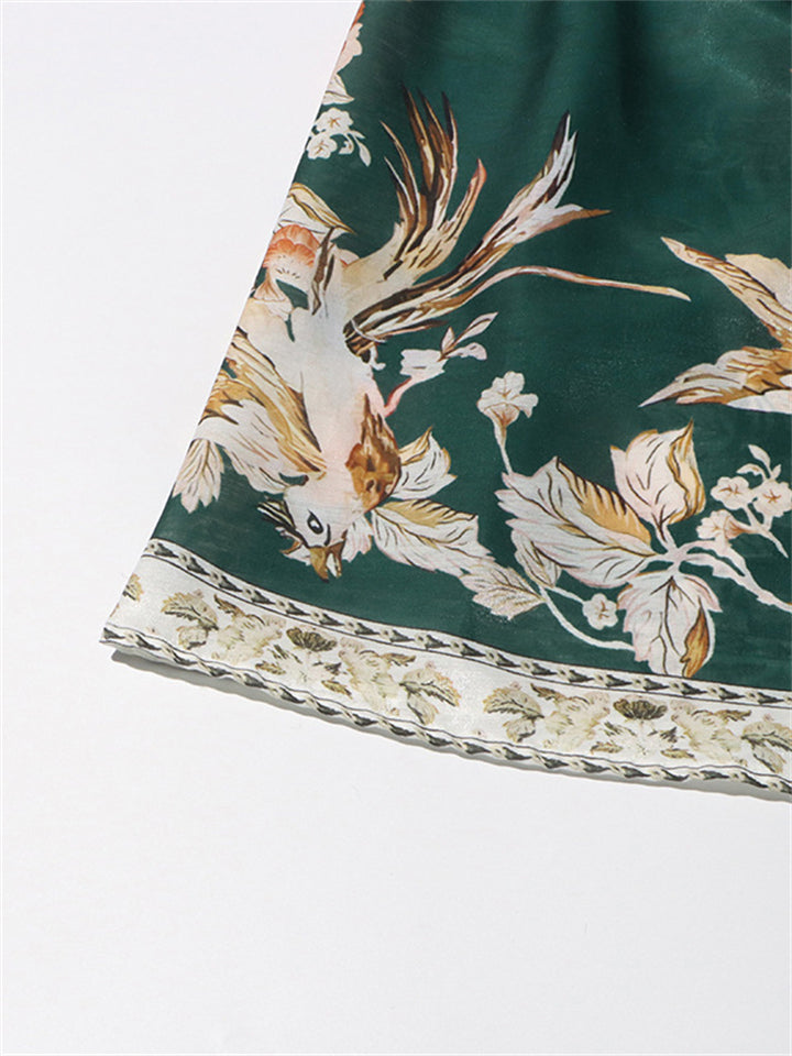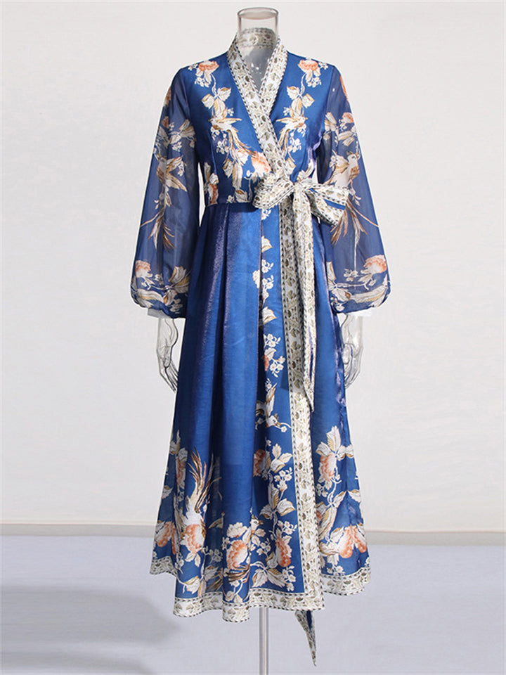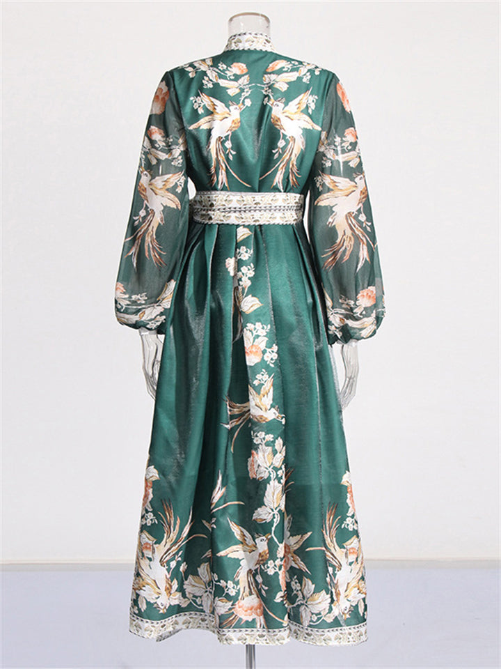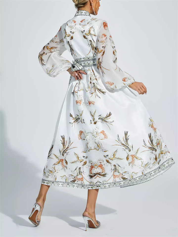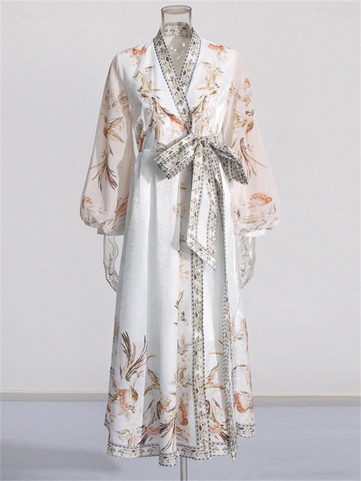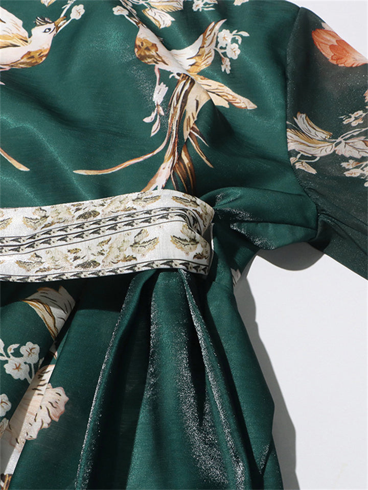 Ethnic Bird & Flower Print Lantern Sleeve Lace Up Dress for Women