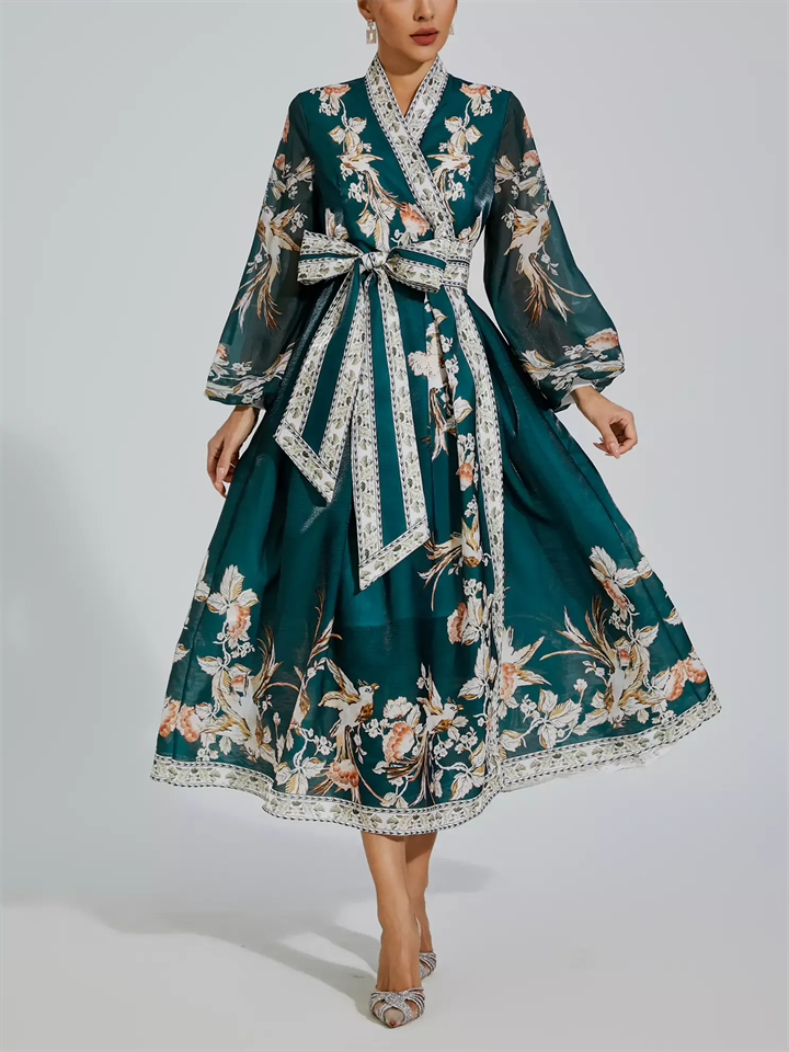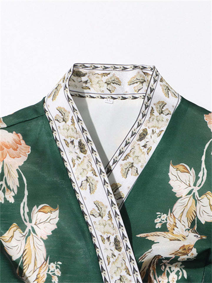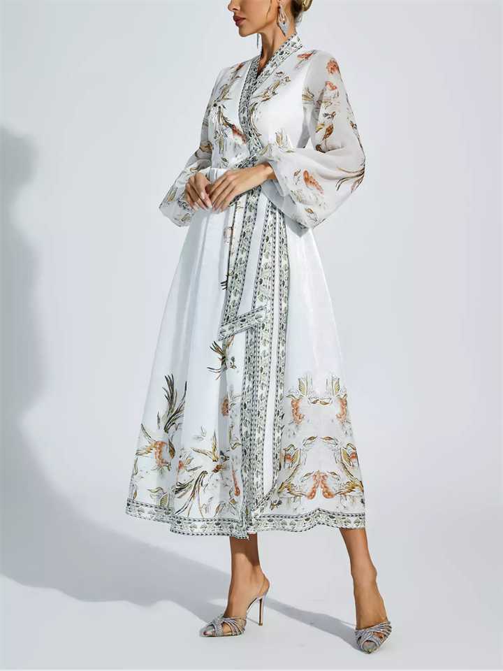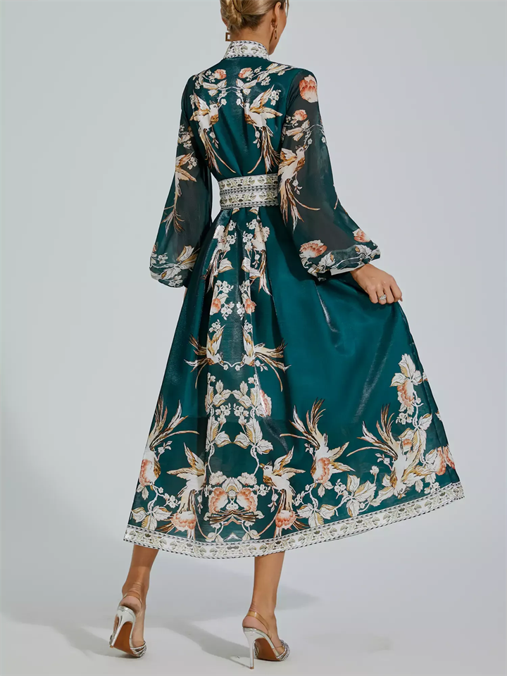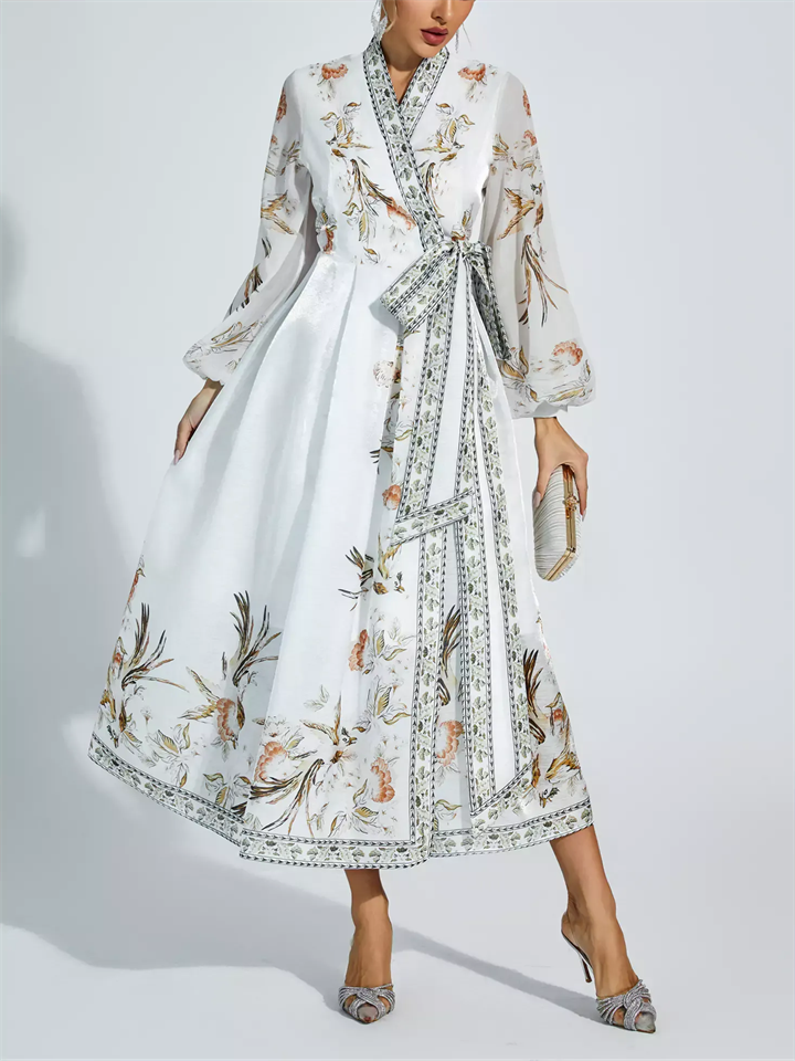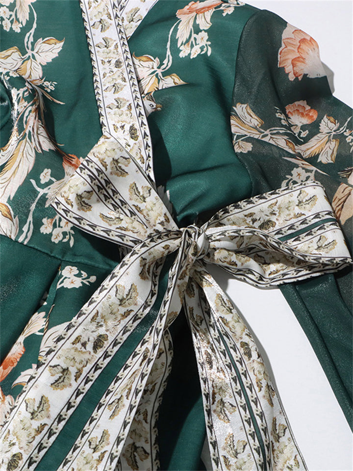 Ethnic Bird & Flower Print Lantern Sleeve Lace Up Dress for Women