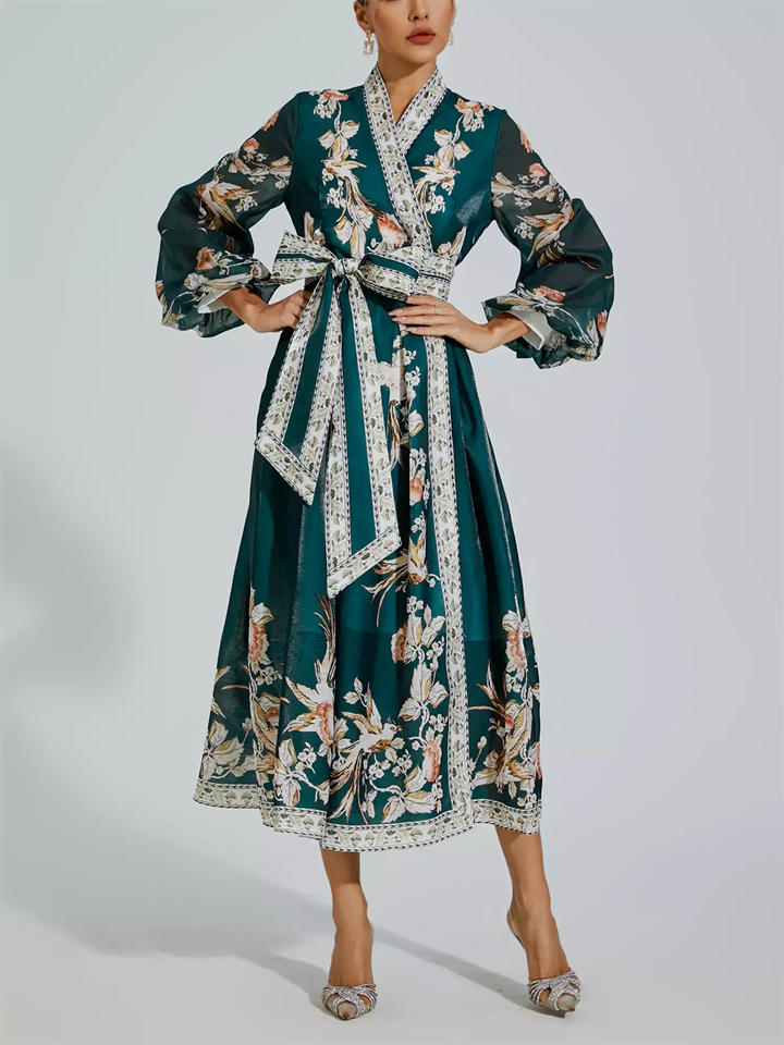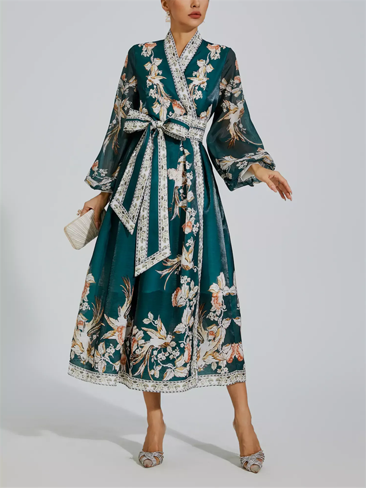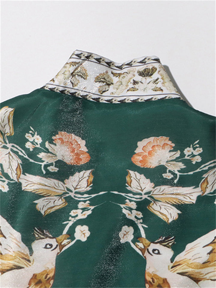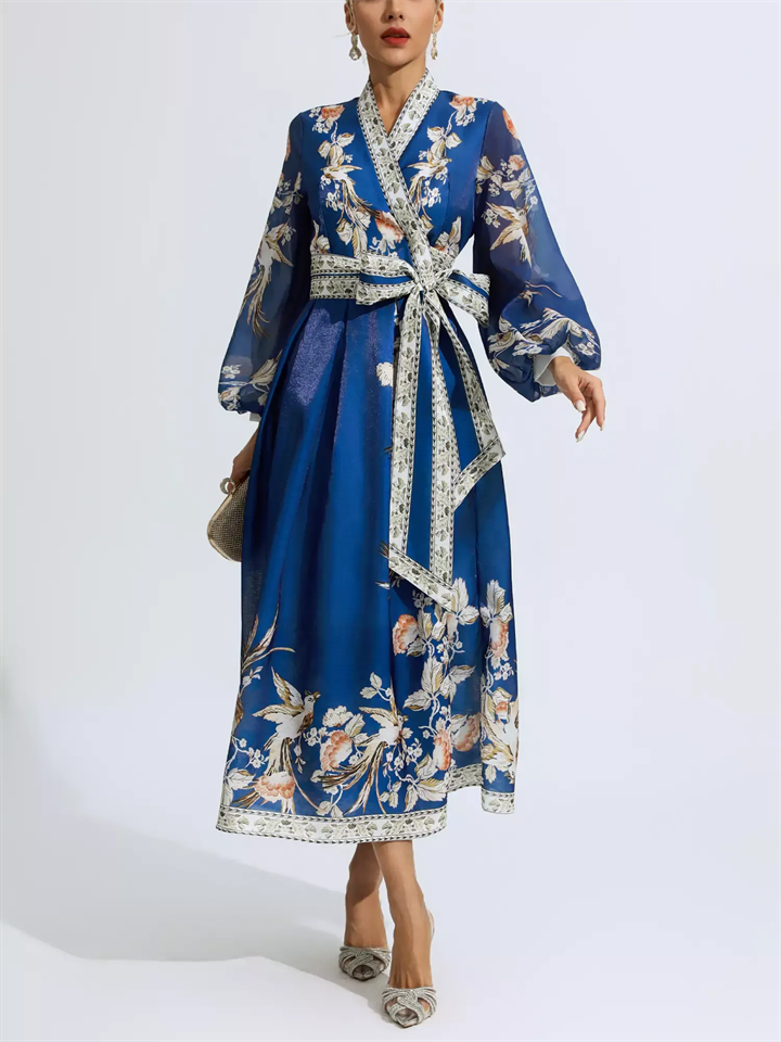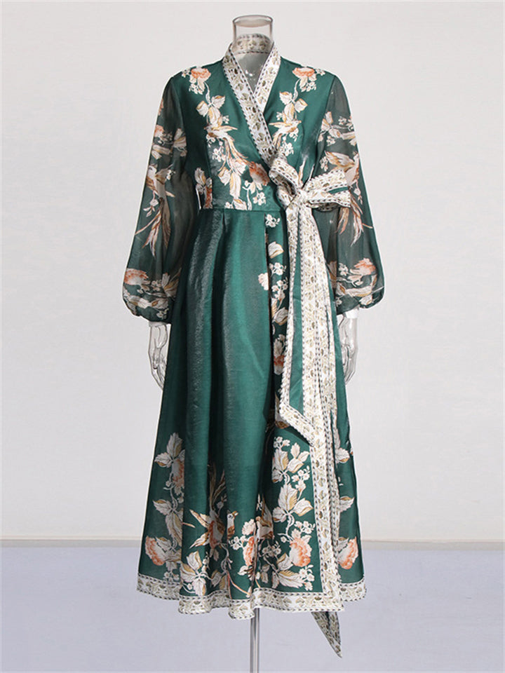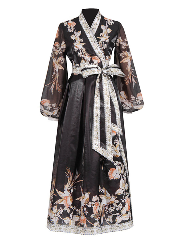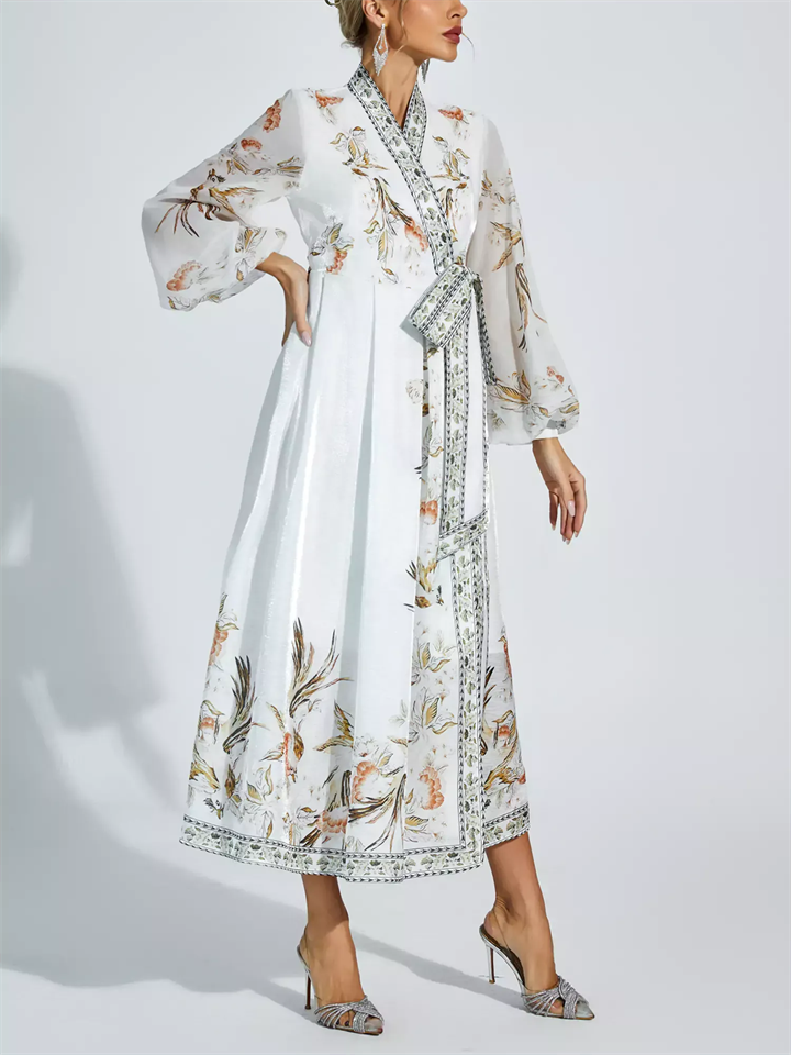Ethnic Bird & Flower Print Lantern Sleeve Lace Up Dress for Women