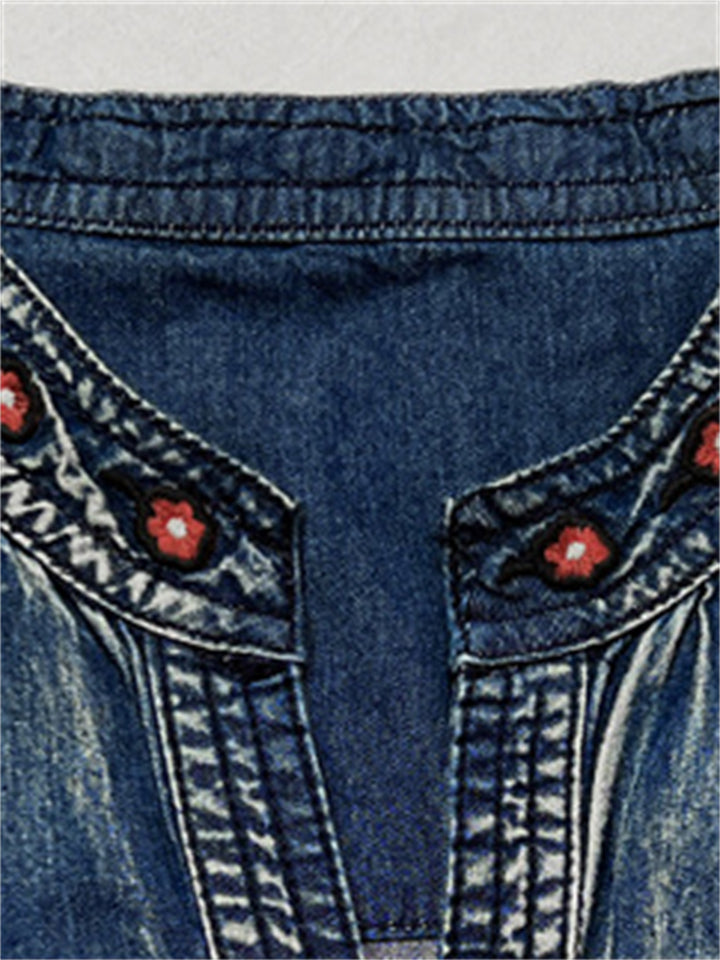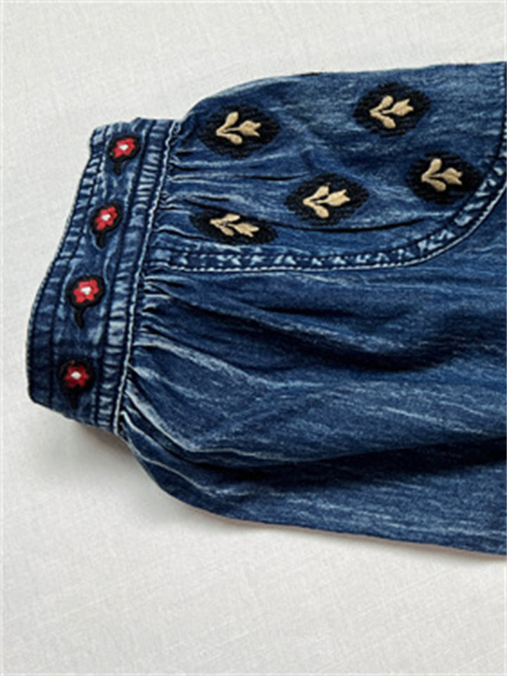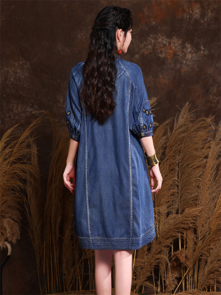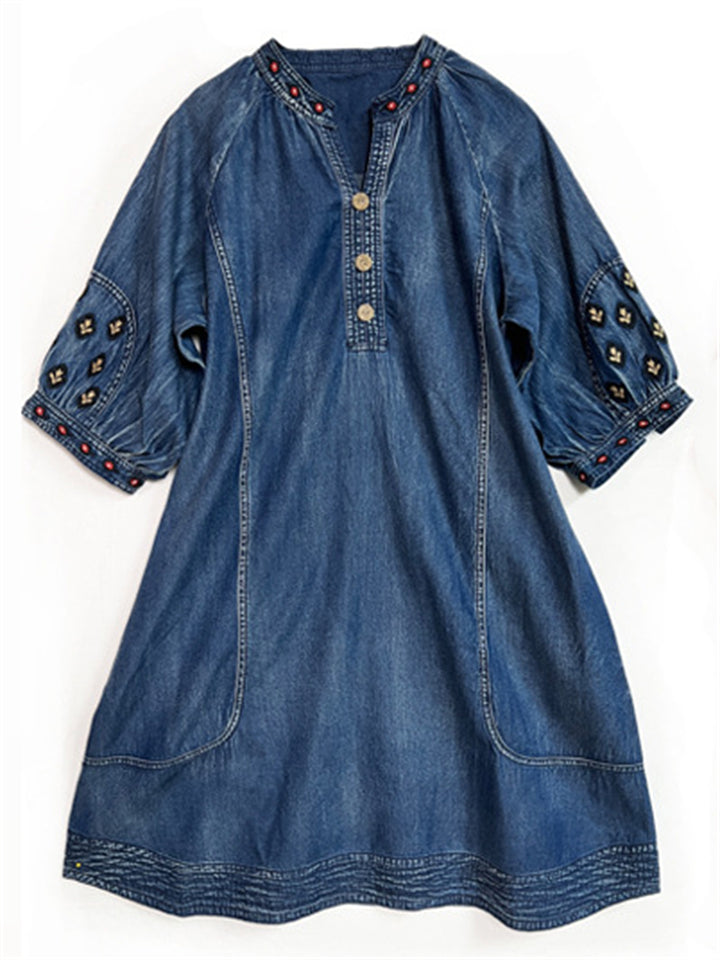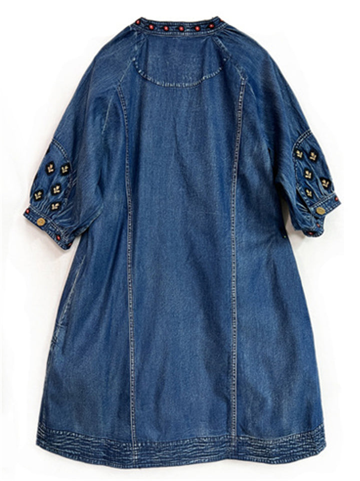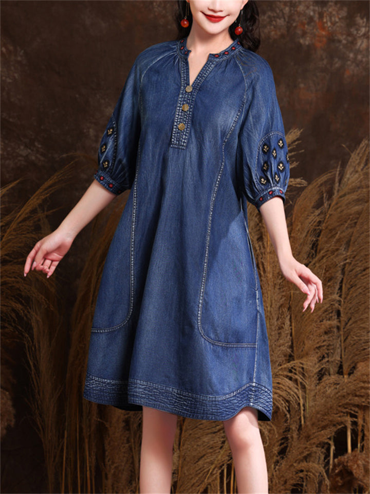 Ethnic Style Embroidery Women's V Neck Puff Sleeve Denim Dress