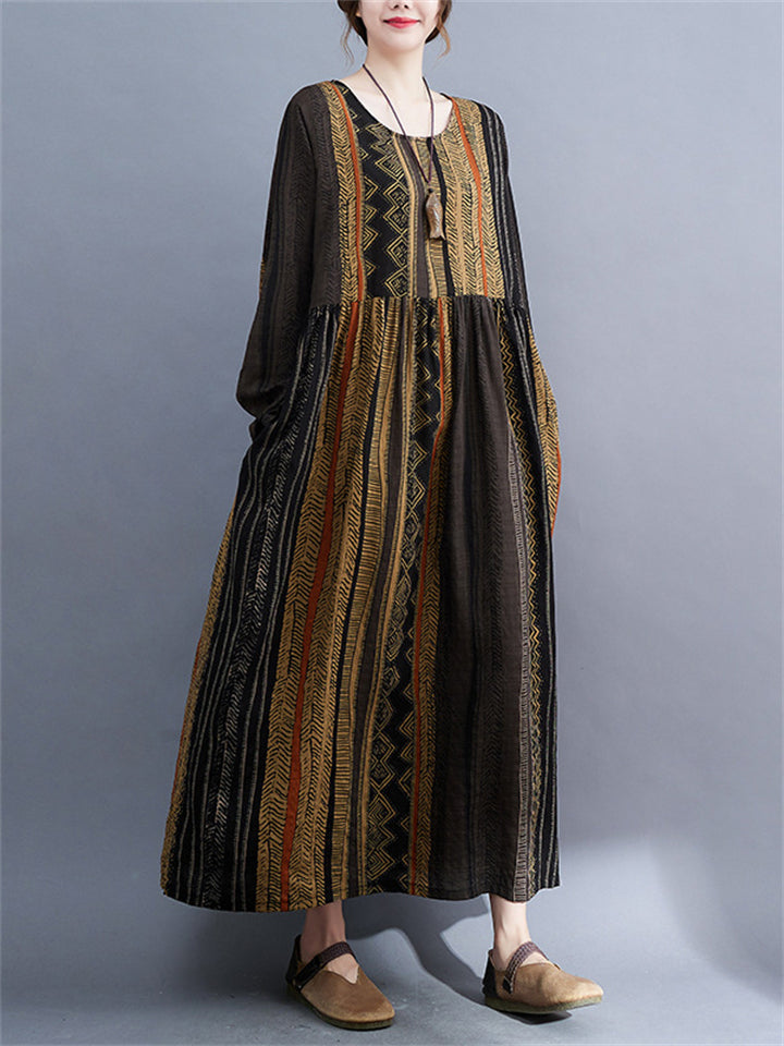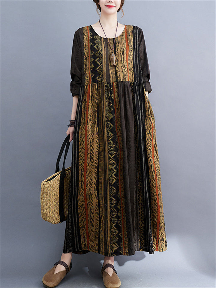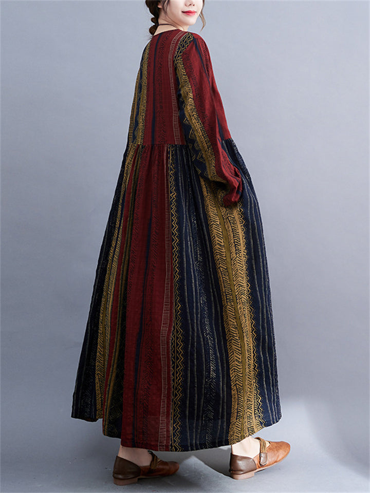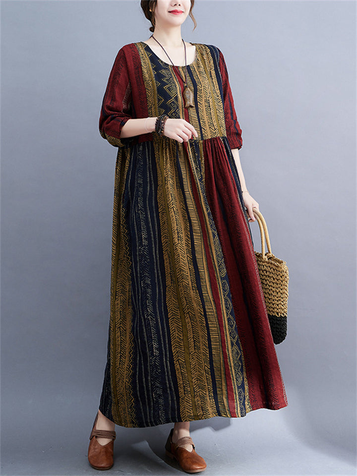 Ethnic Style Multicolor Stripe Round Neck Holiday Dress for Lady