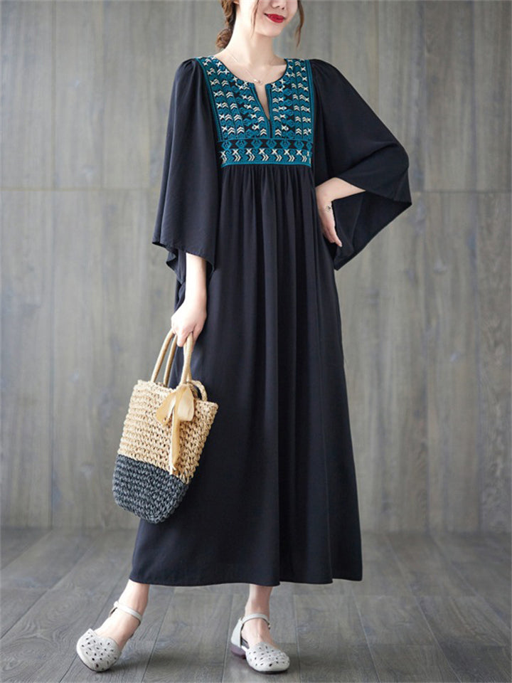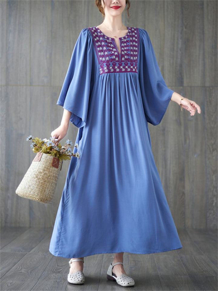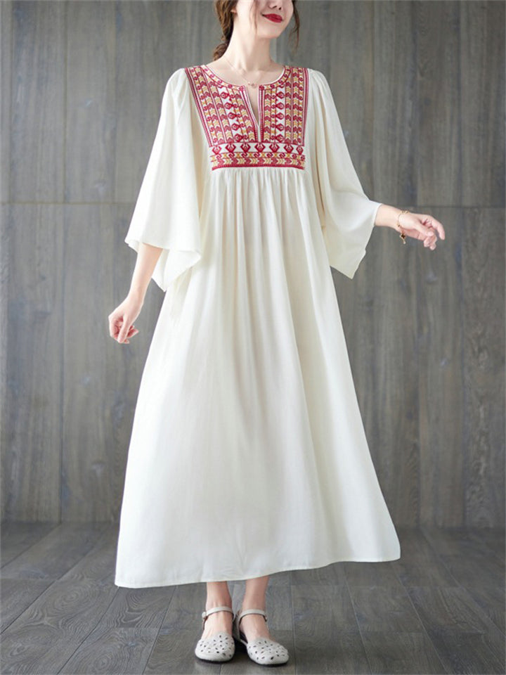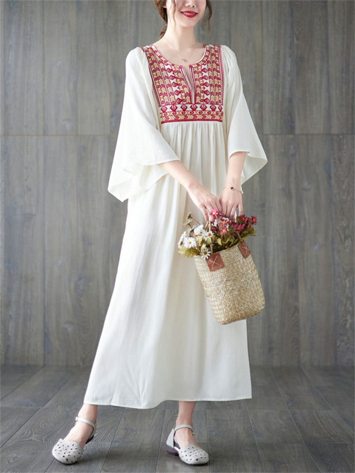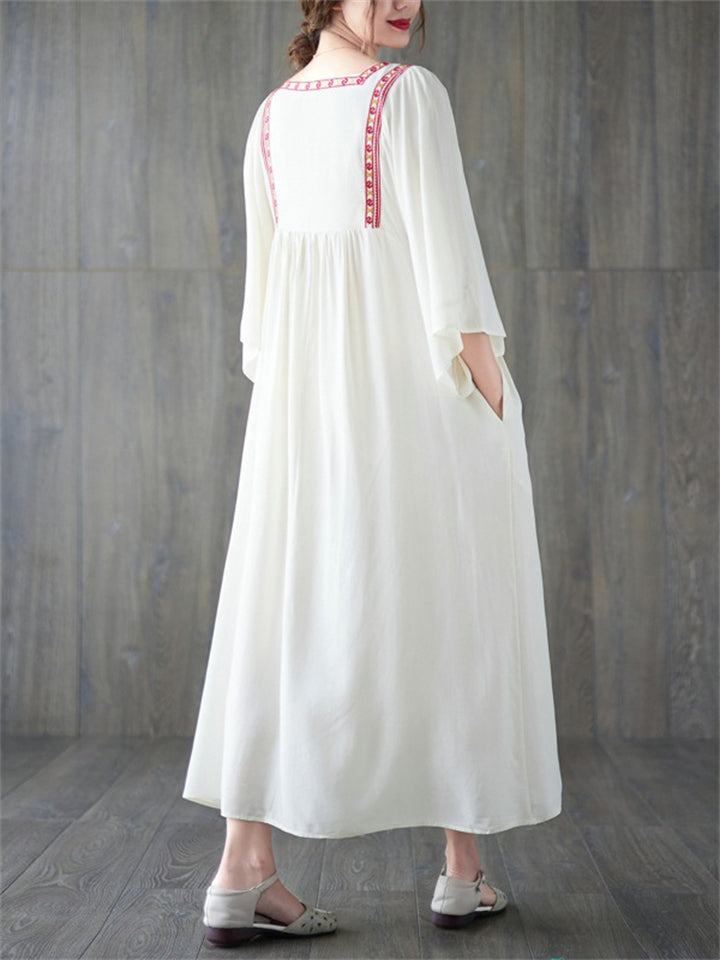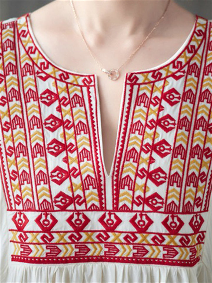 Ethnic Style V Neck Embroidery Ruffle Dress for Women