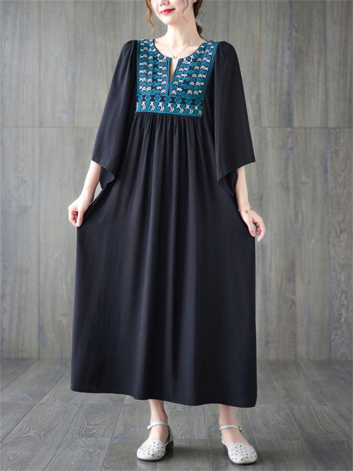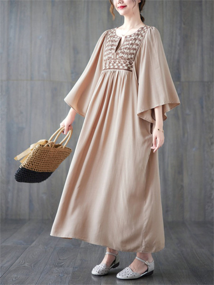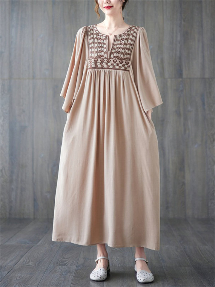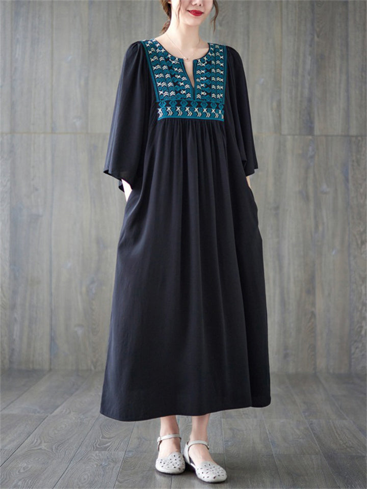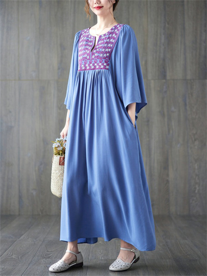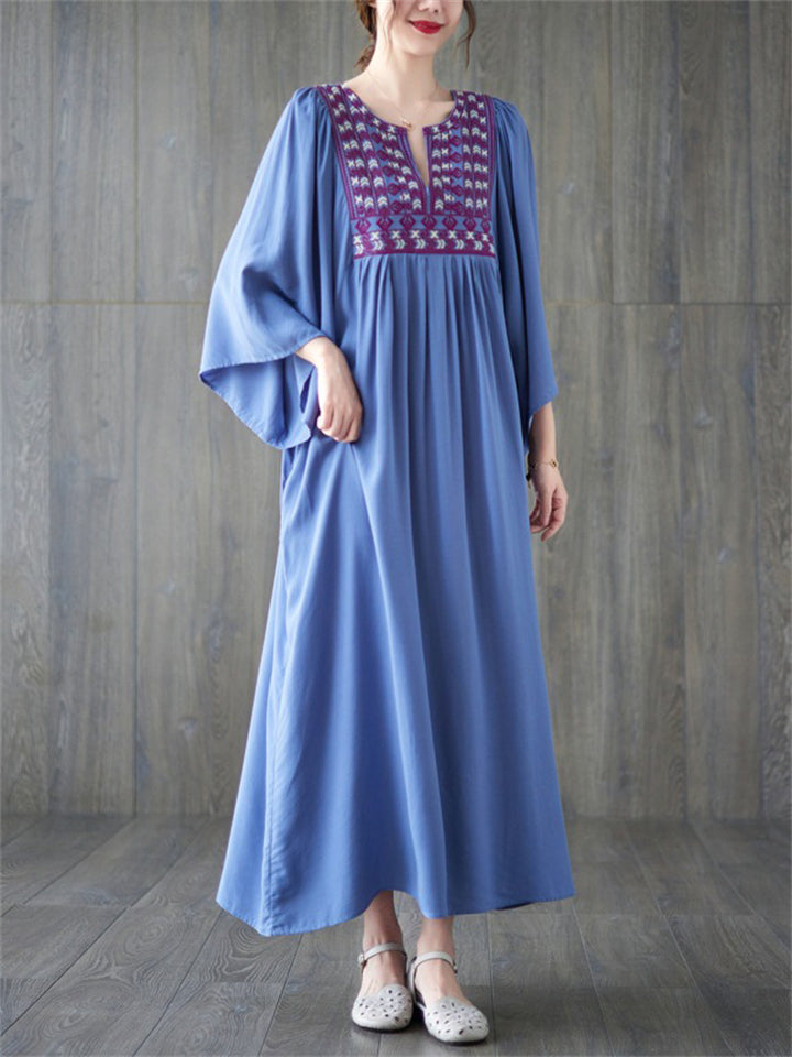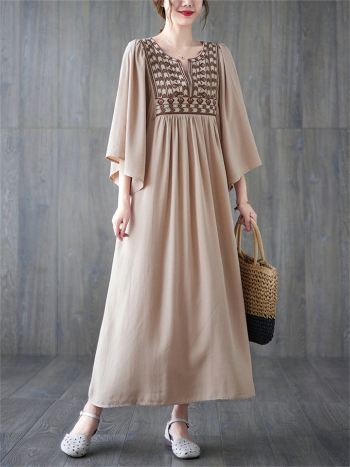Ethnic Style V Neck Embroidery Ruffle Dress for Women
