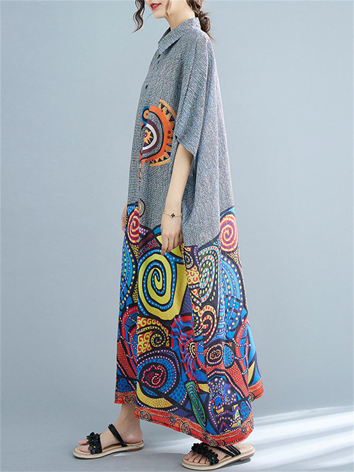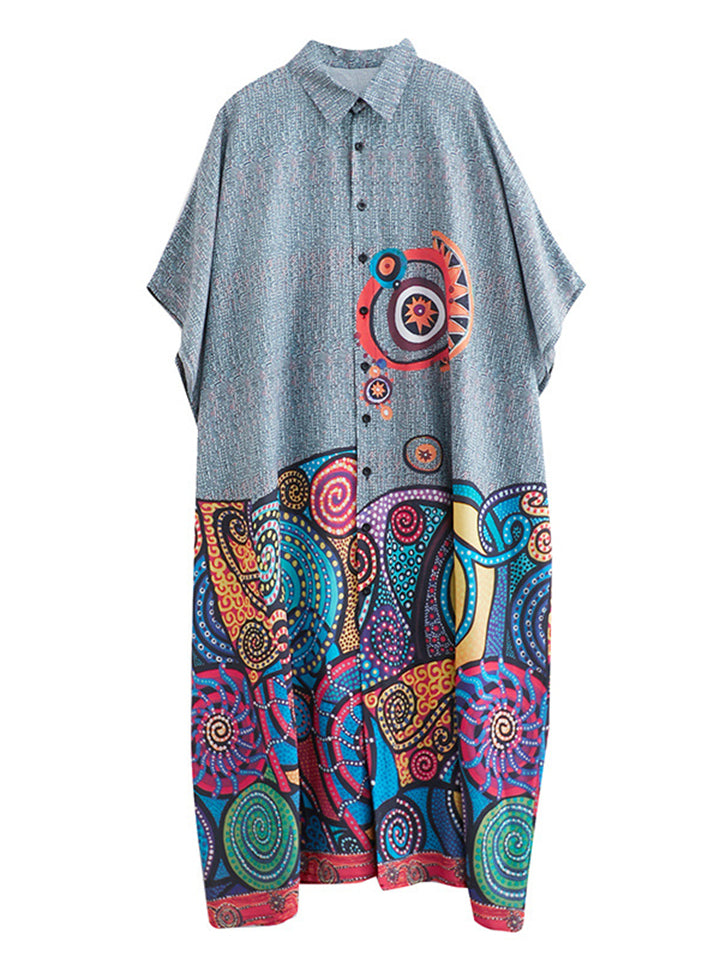 Fat Girls Oversized Bohemian Print Lapel Shirt Dress