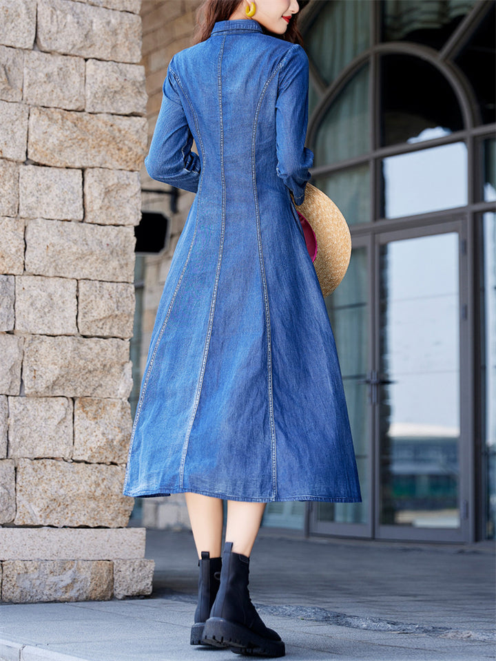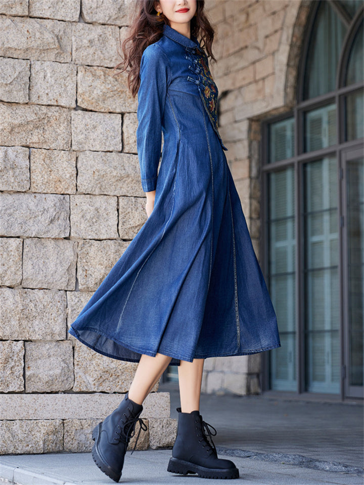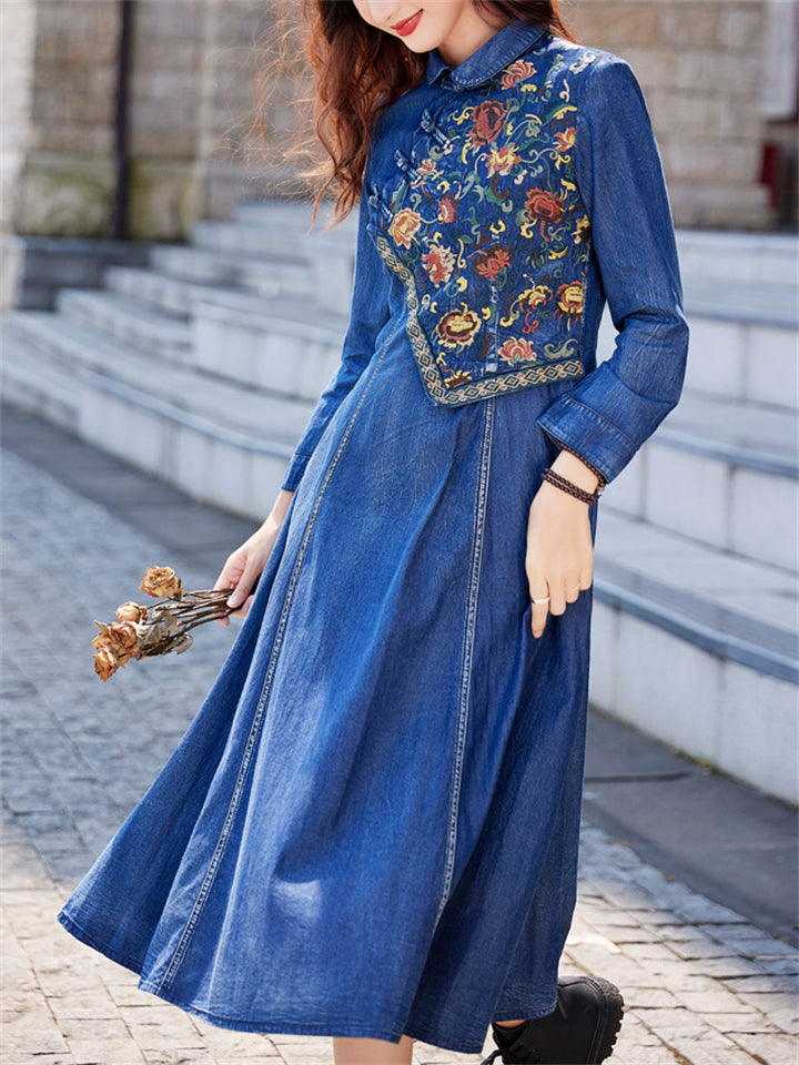 Female Ethnic Style Embroidery Floral Slim Denim Dress