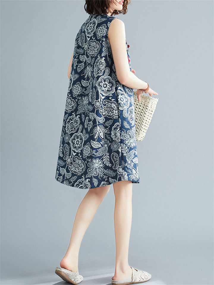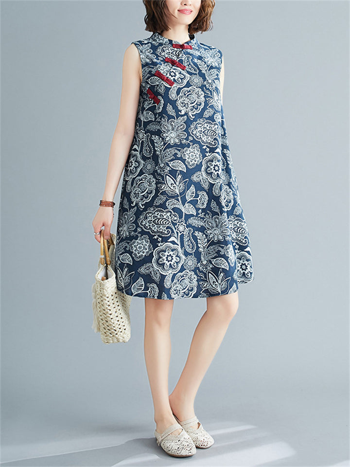 Female Flower Printed Retro Loose Cheongsam Dress