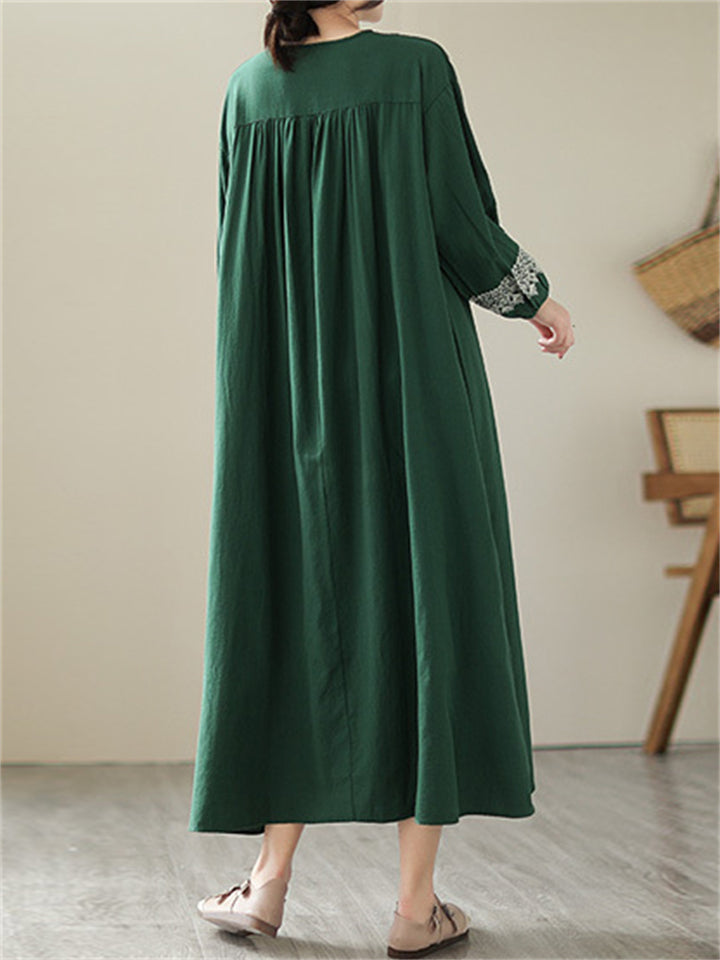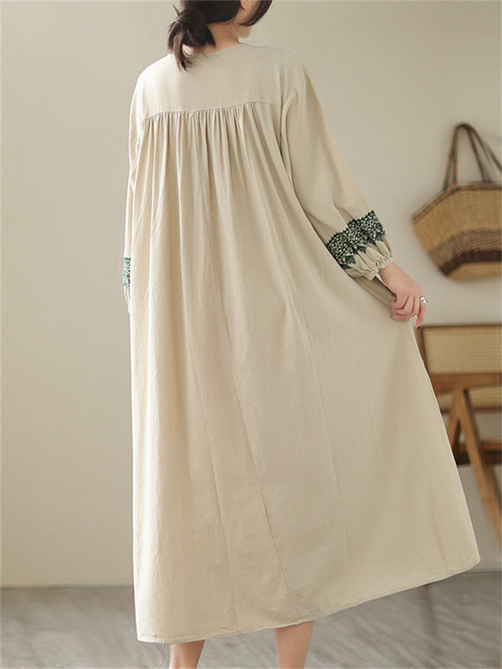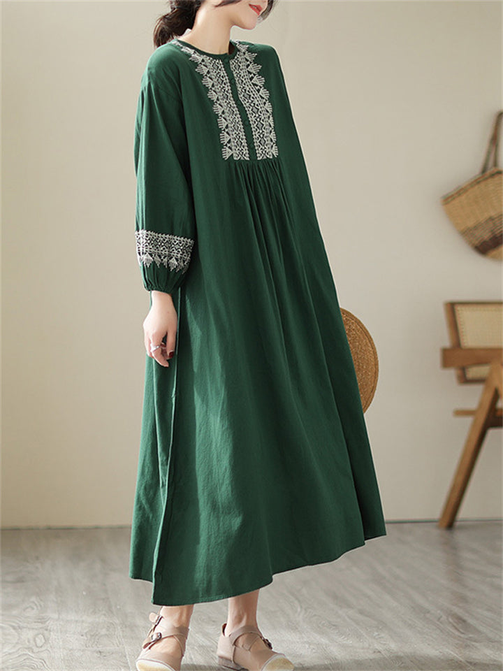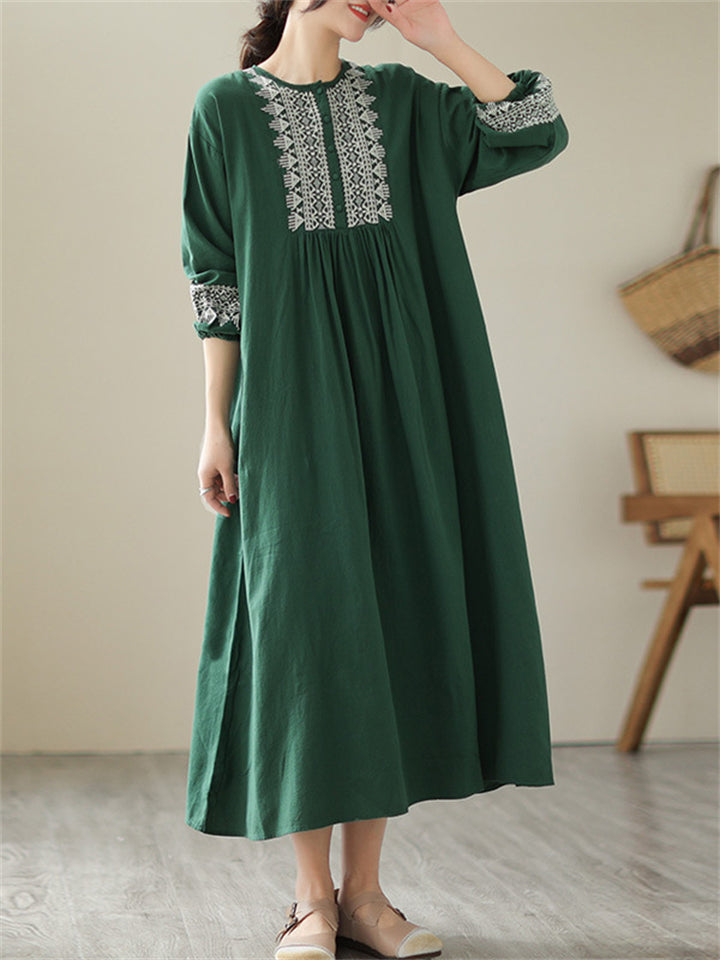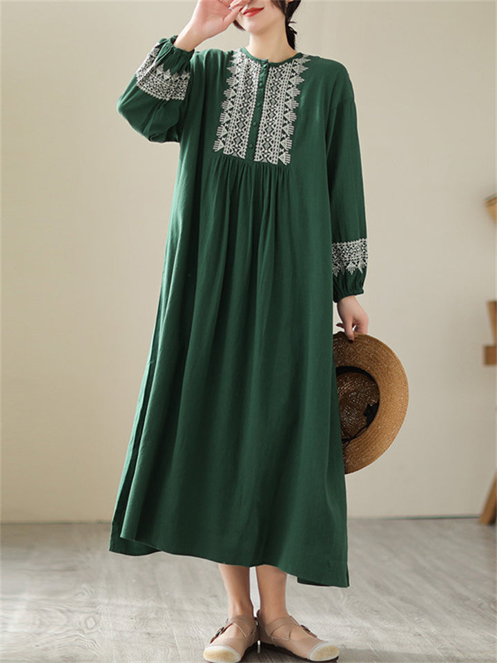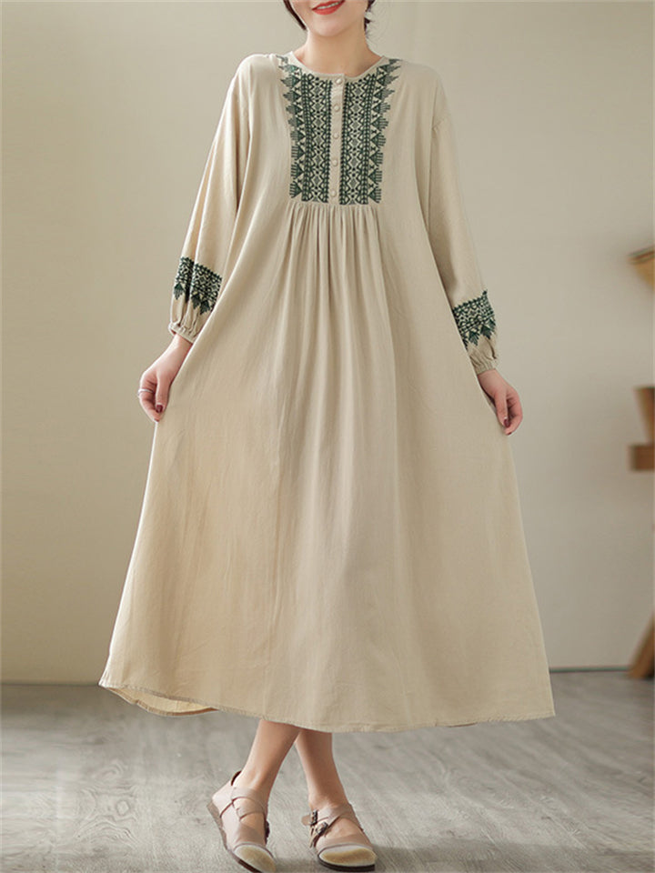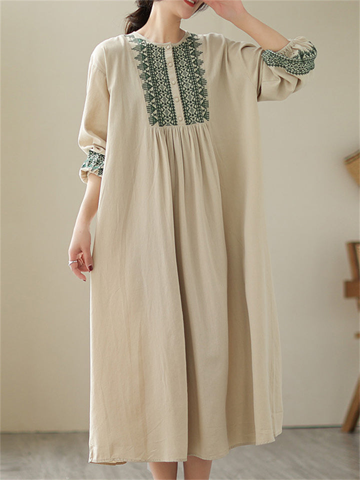 Female Geometric Embroidered Round Collar Half Placket Dress