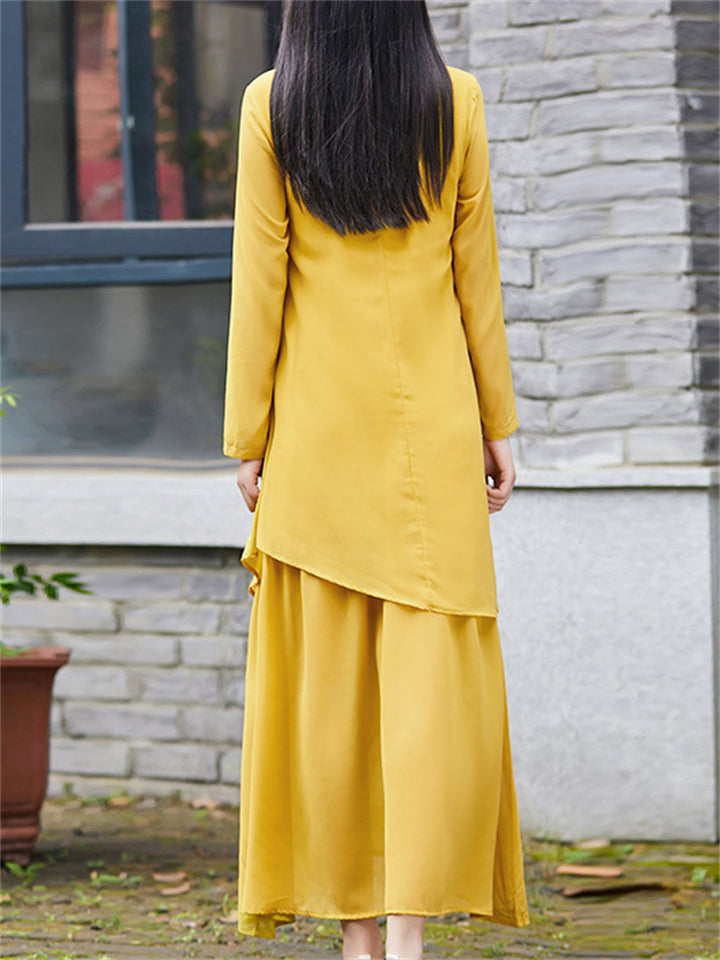 Women's Casual Solid Color Round Neck Double-layer Big Hem Midi Dress