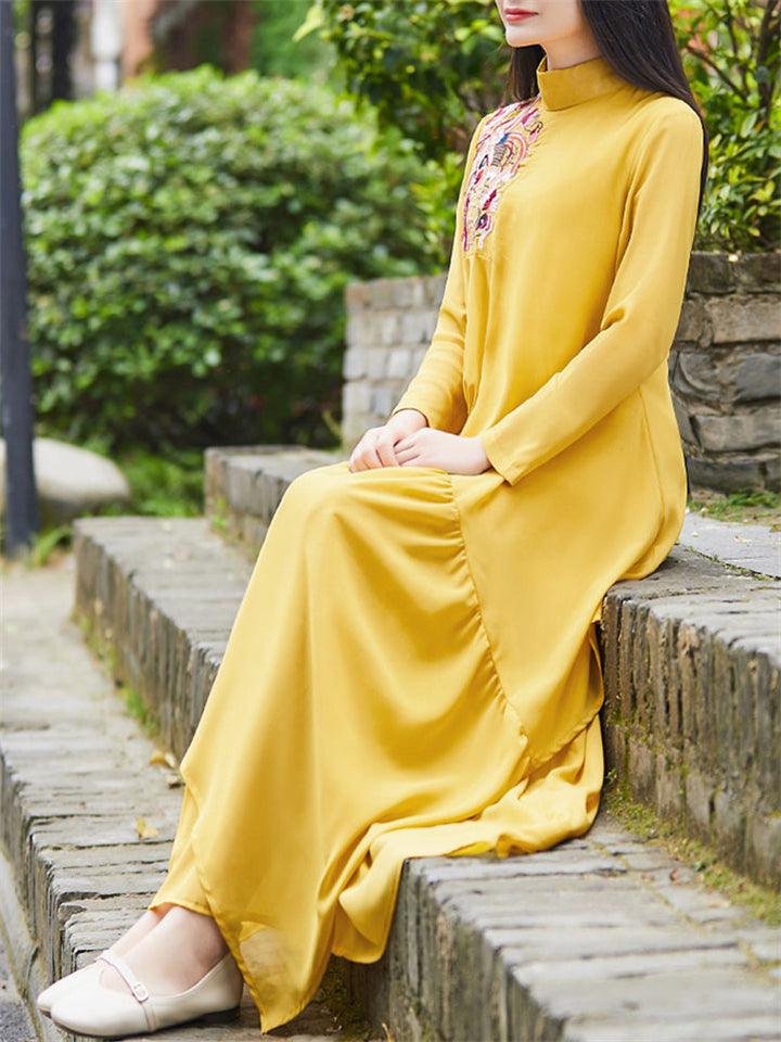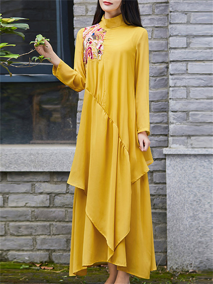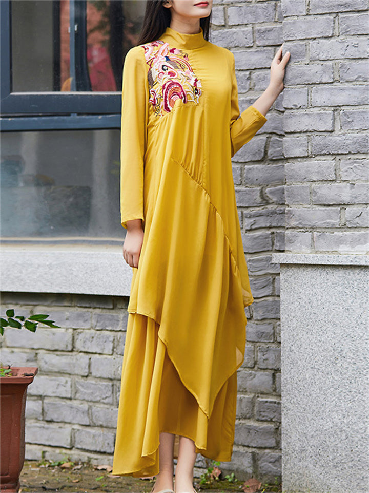 Female Patchwork Floral Embroidered Ethnic Style Chiffon Dress