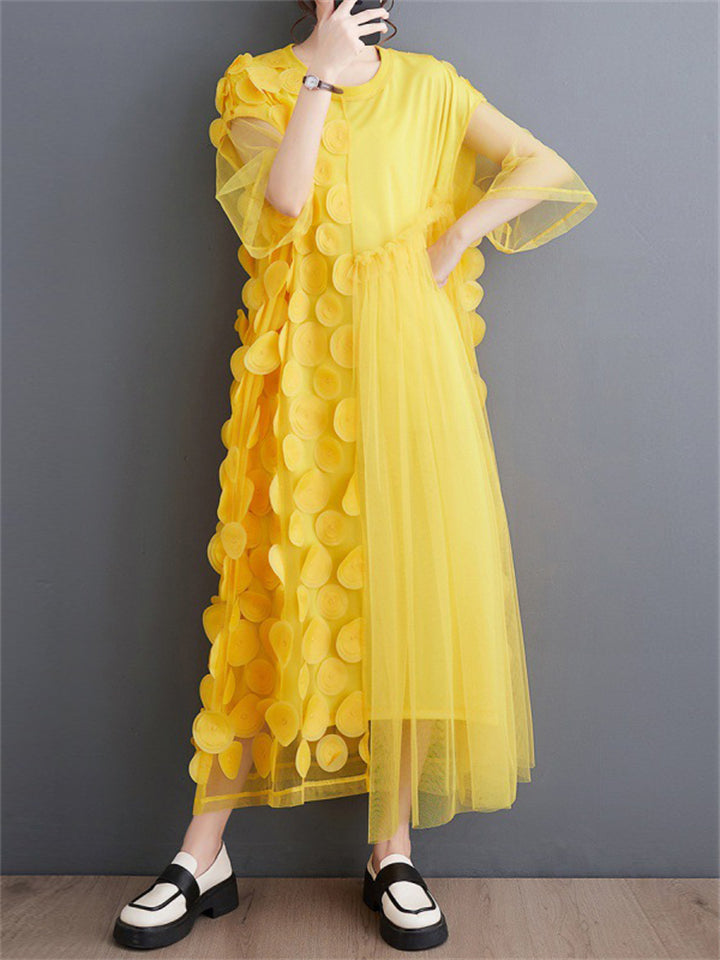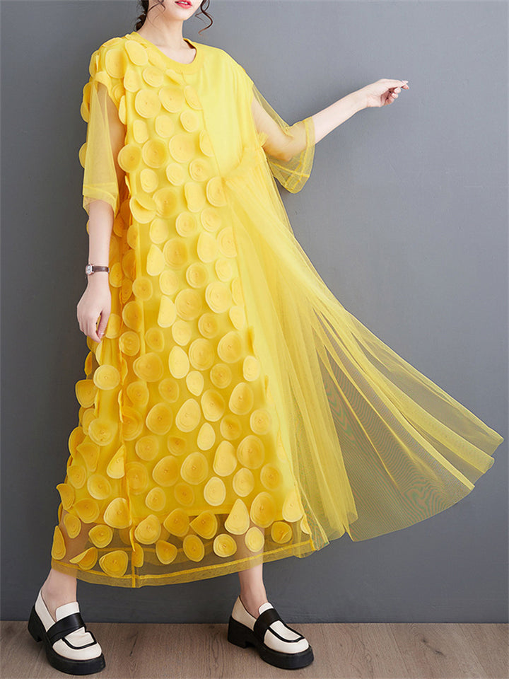 Women's Casual Solid Color Round Neck Double-layer Big Hem Midi Dress