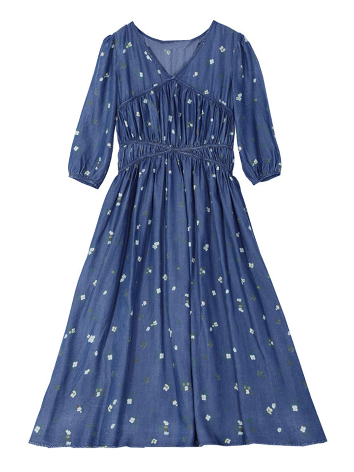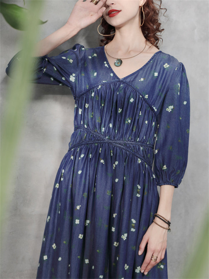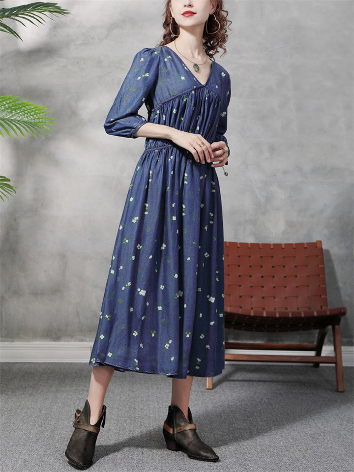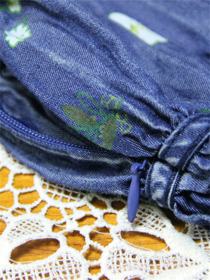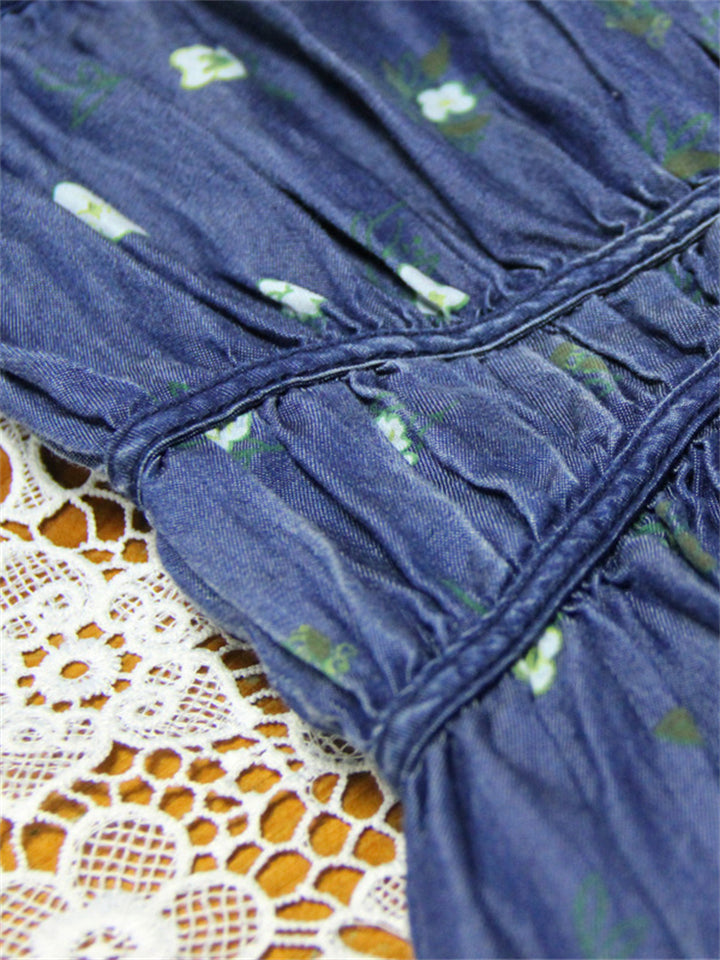 Women's Printed Denim Chiffon Patchwork Big Hem Dress